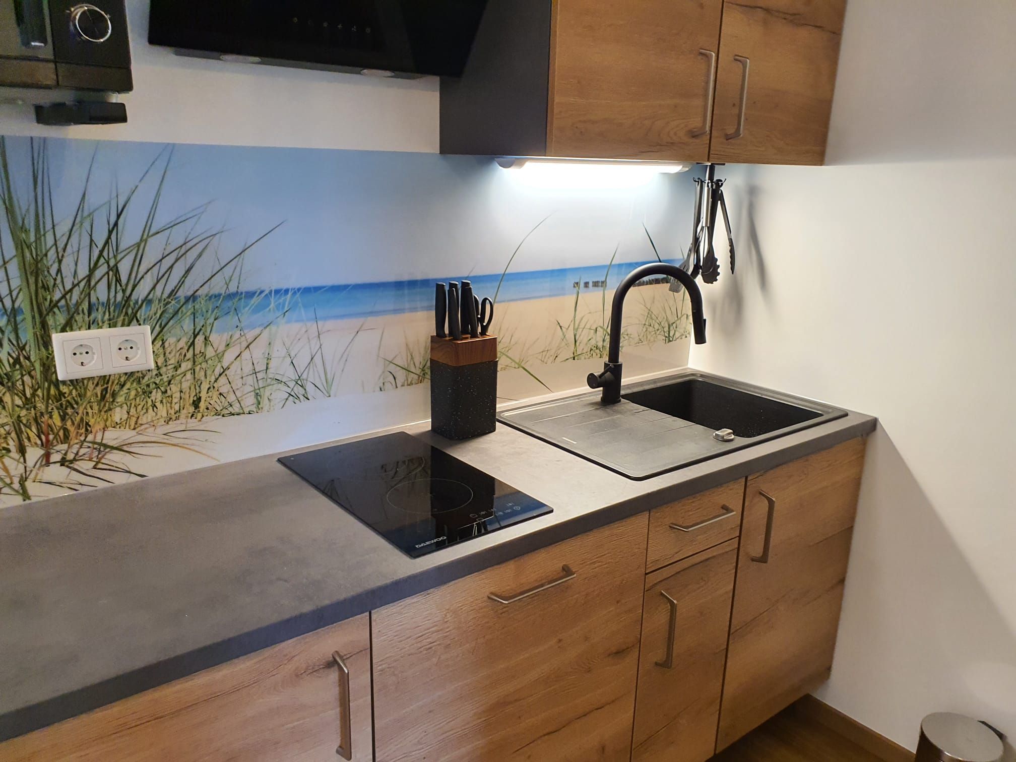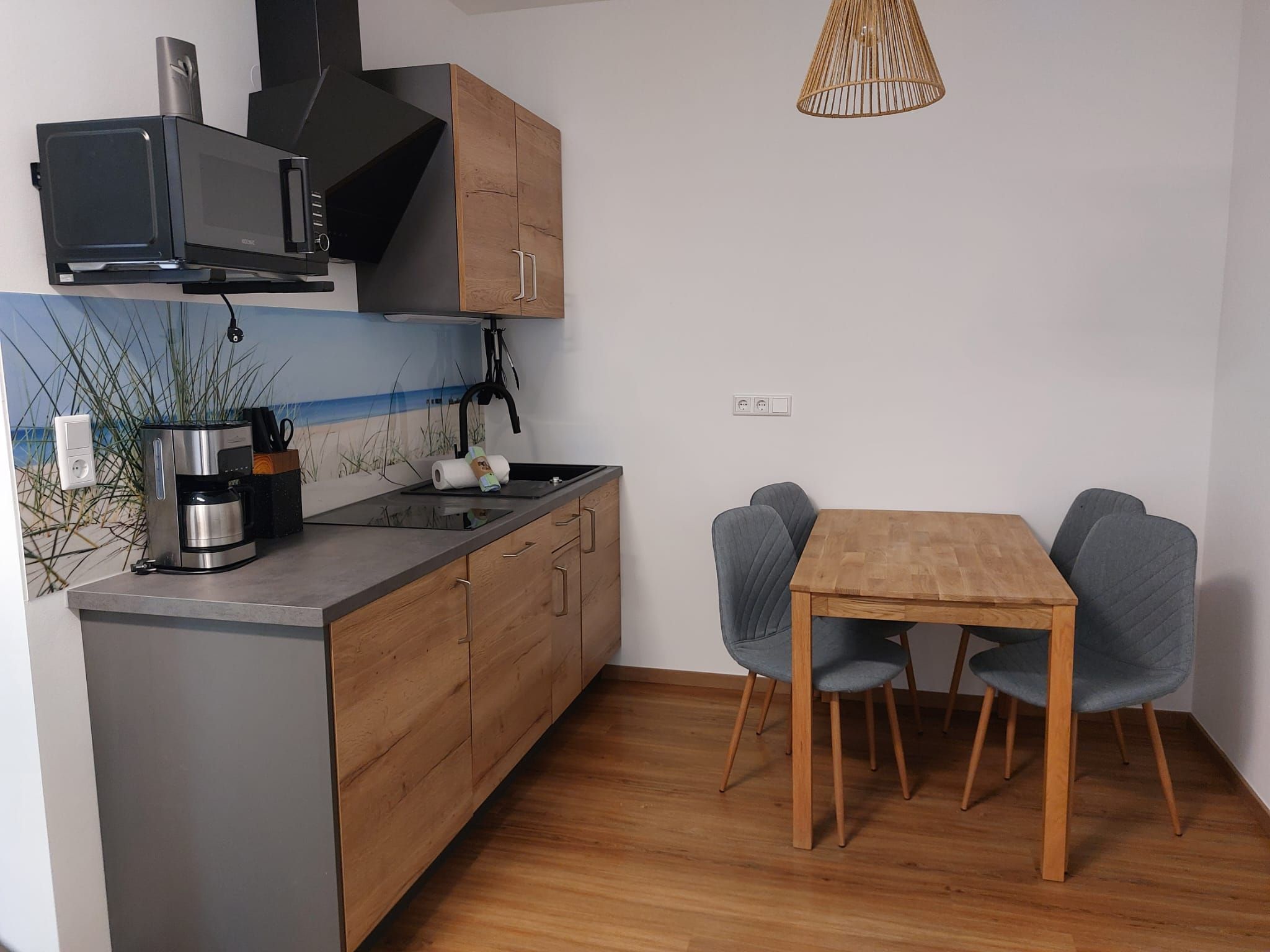 Küche - voll ausgestattet & durchdacht: moderne Küchenmöbel in stilvollem Design, umfangreiche Austattung - Geschirr & Besteck für 4 Personen, Kochutensilien, Toaster, Kaffeemaschine, Dosenöffner, Eierpicker u.v.m., Mikrowelle mit Backfunktion, Dunstabzugshaube mit Abluftsystem, Geschirrspüler & Kühlschrank, Esstisch für 4 Personen mit passenden Stühlen