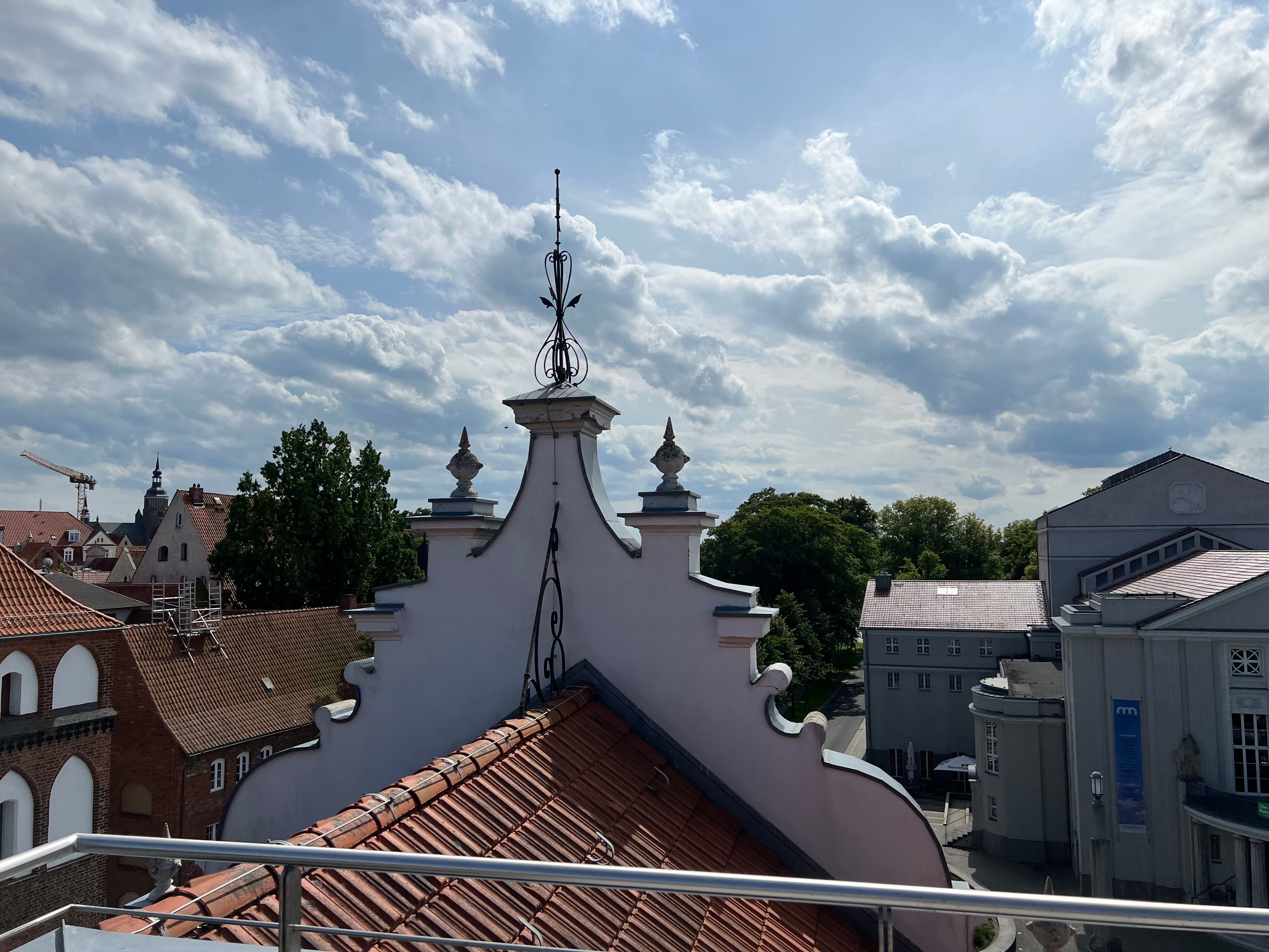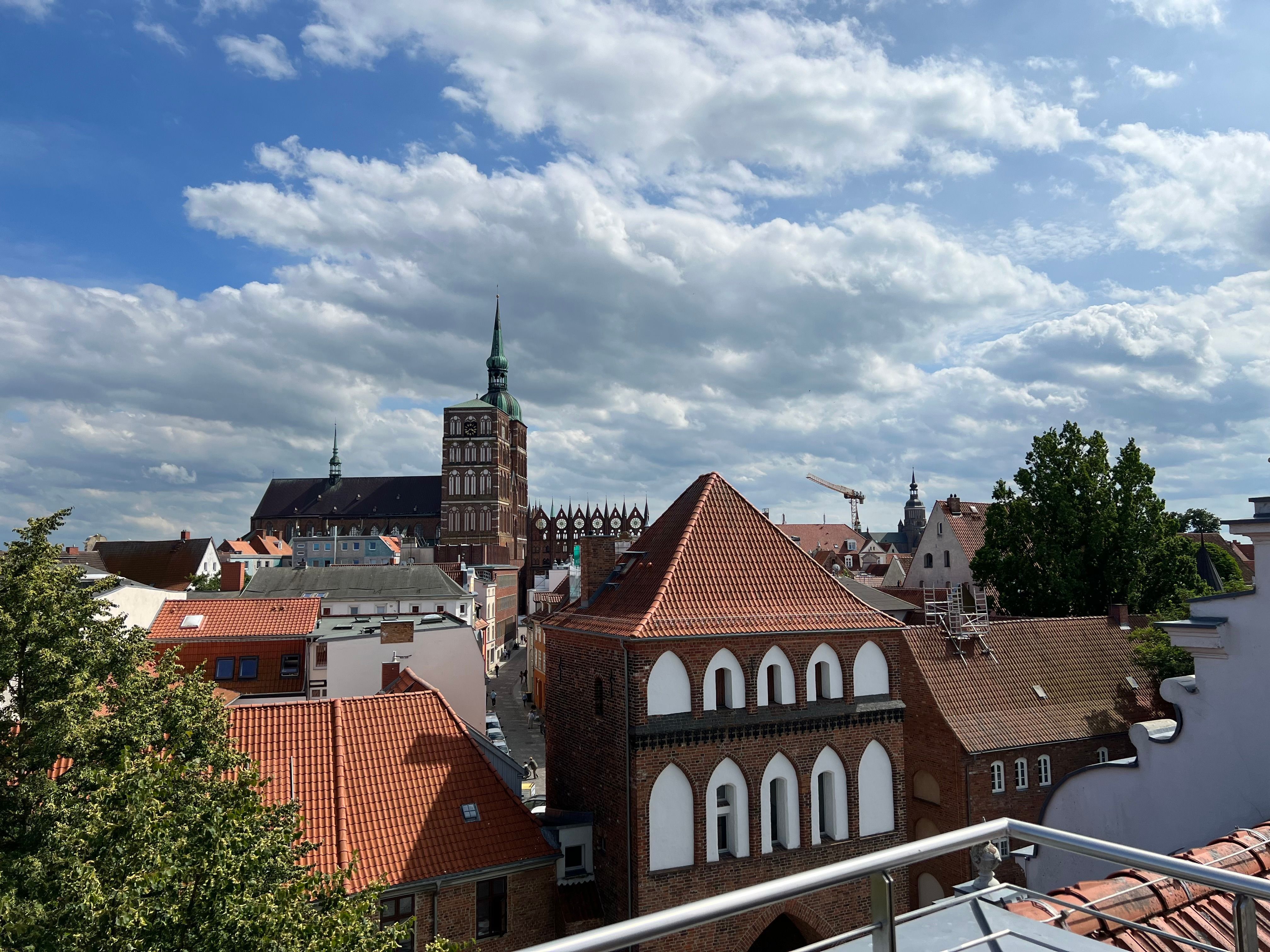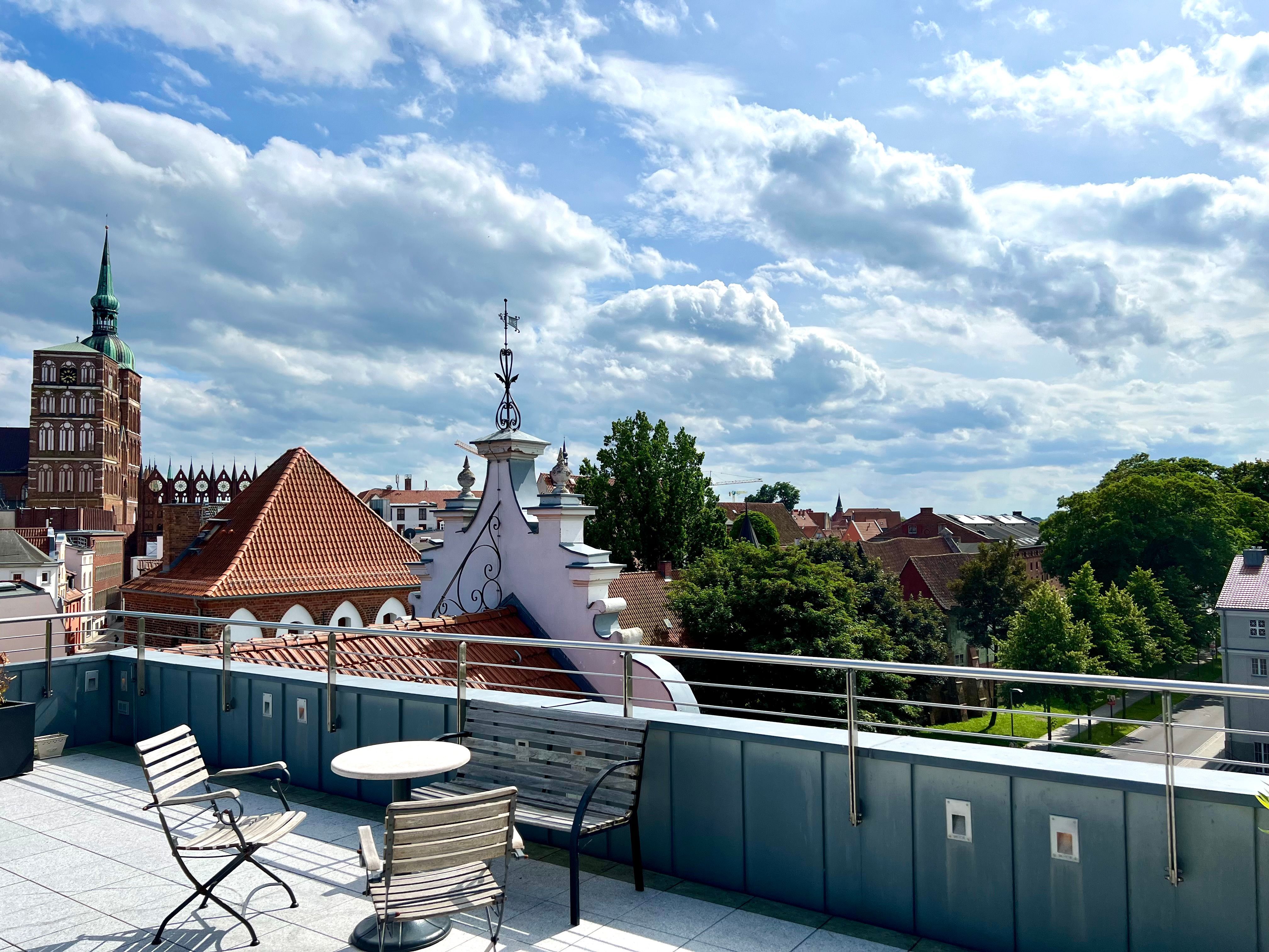 Den Gästen vom Haus 2 steht unsere große Gemeinschaftsdachterrasse im Haus 1 zur Verfügung. Hier haben Sie einen fantastischen Bilck auf das Stralsunder Theater, die Stadtmauer, die Altstadt und den Hafen.