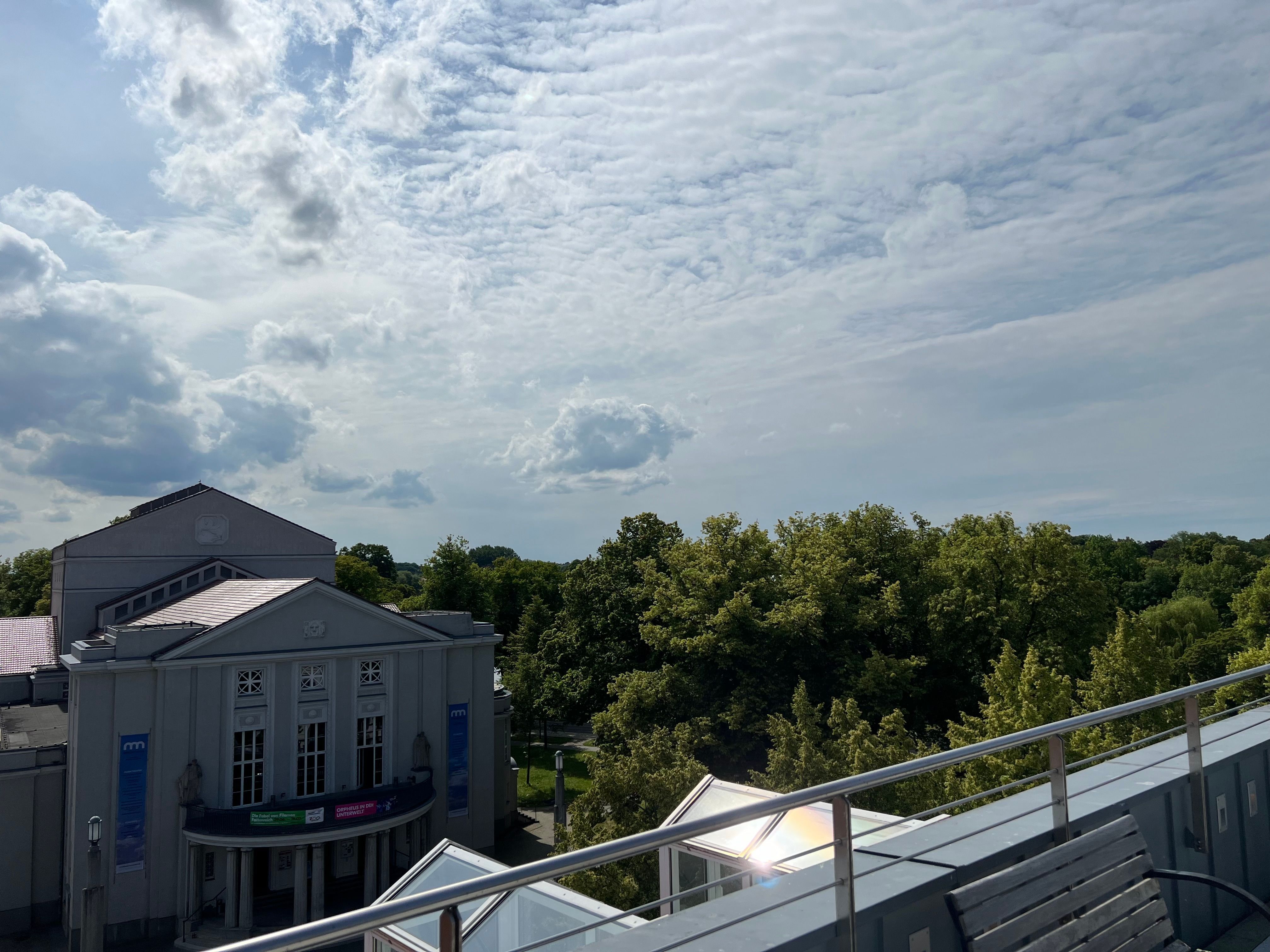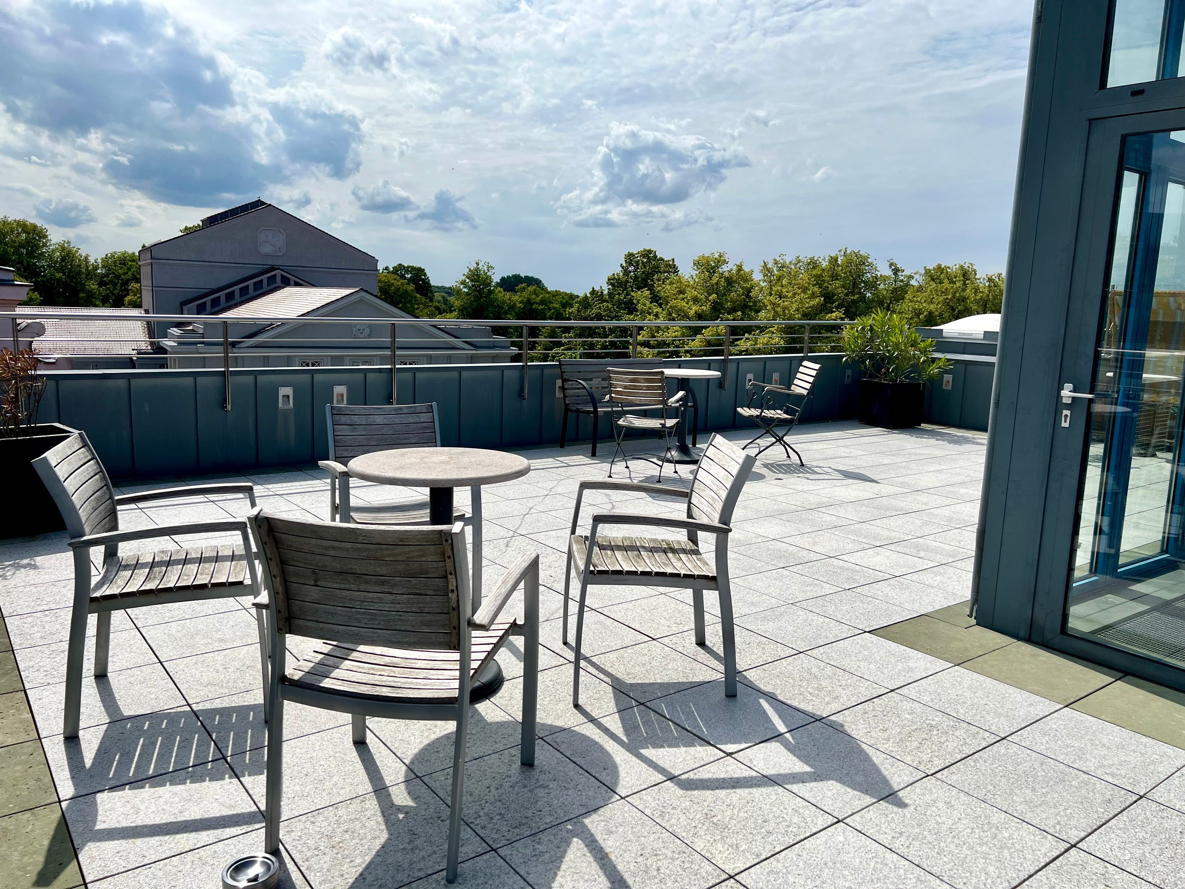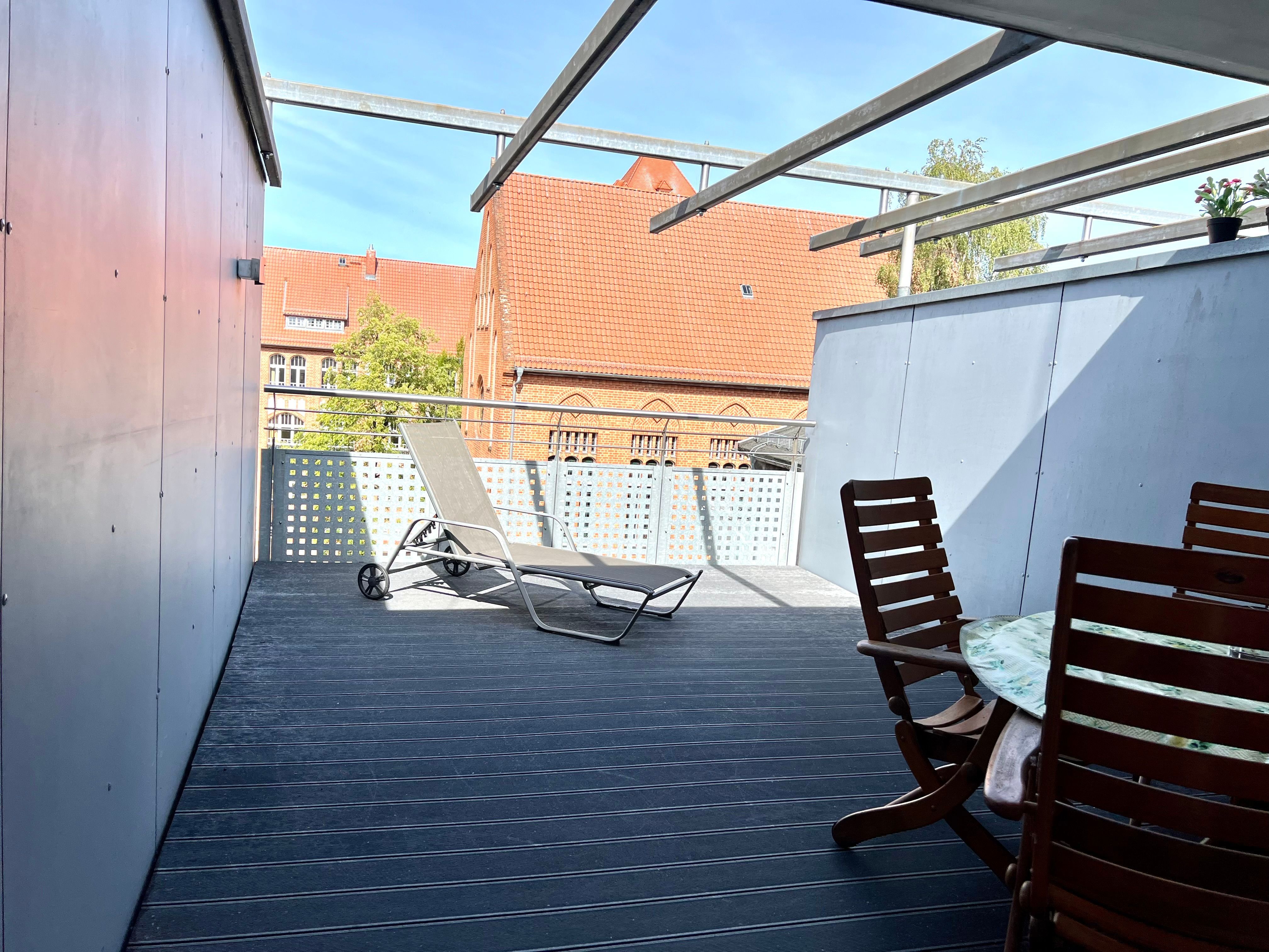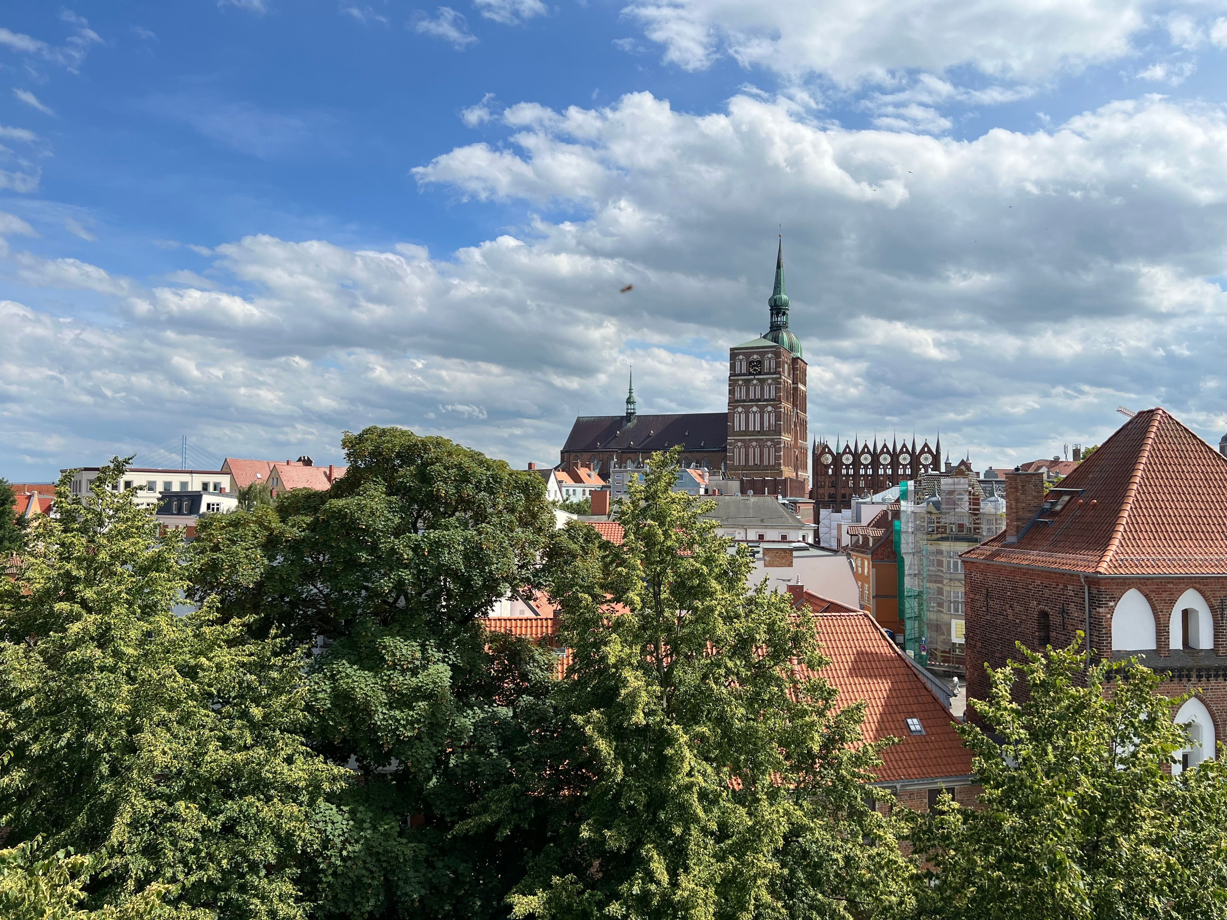 Den Gästen vom Haus 2 steht unsere große Gemeinschaftsdachterrasse im Haus 1 zur Verfügung. Hier haben Sie einen fantastischen Bilck auf das Stralsunder Theater, die Stadtmauer, die Altstadt und den Hafen.