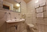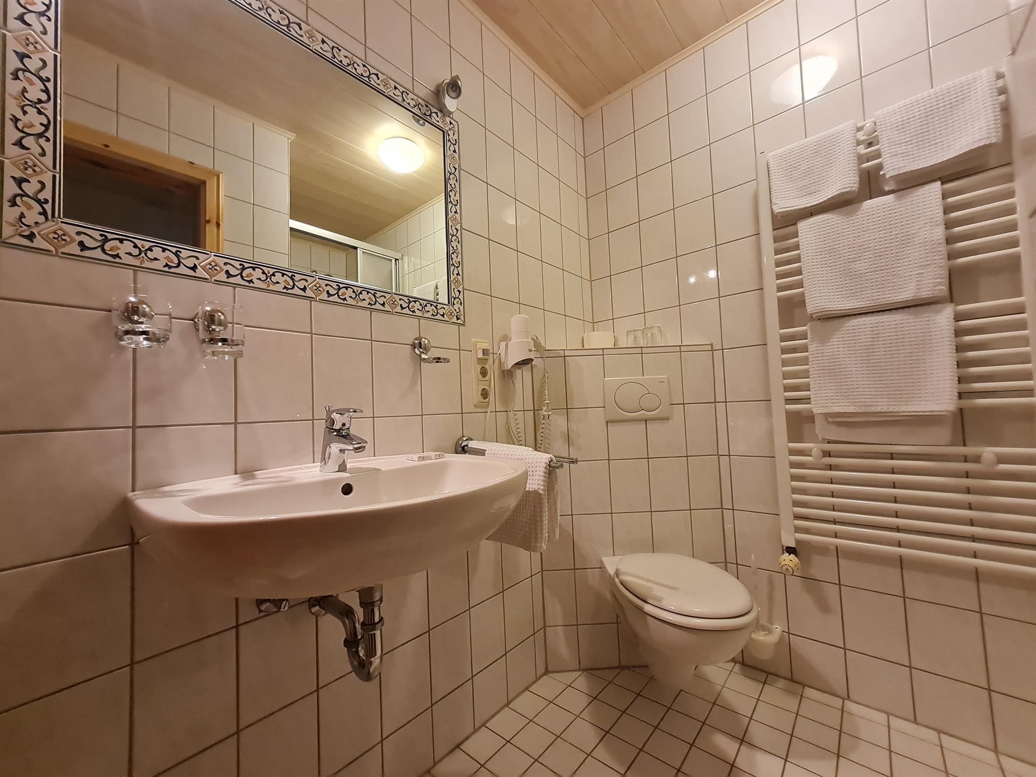 Das Badezimmer verfügt über eine Dusche/WC mit Fön & Kosmetikspiegel.