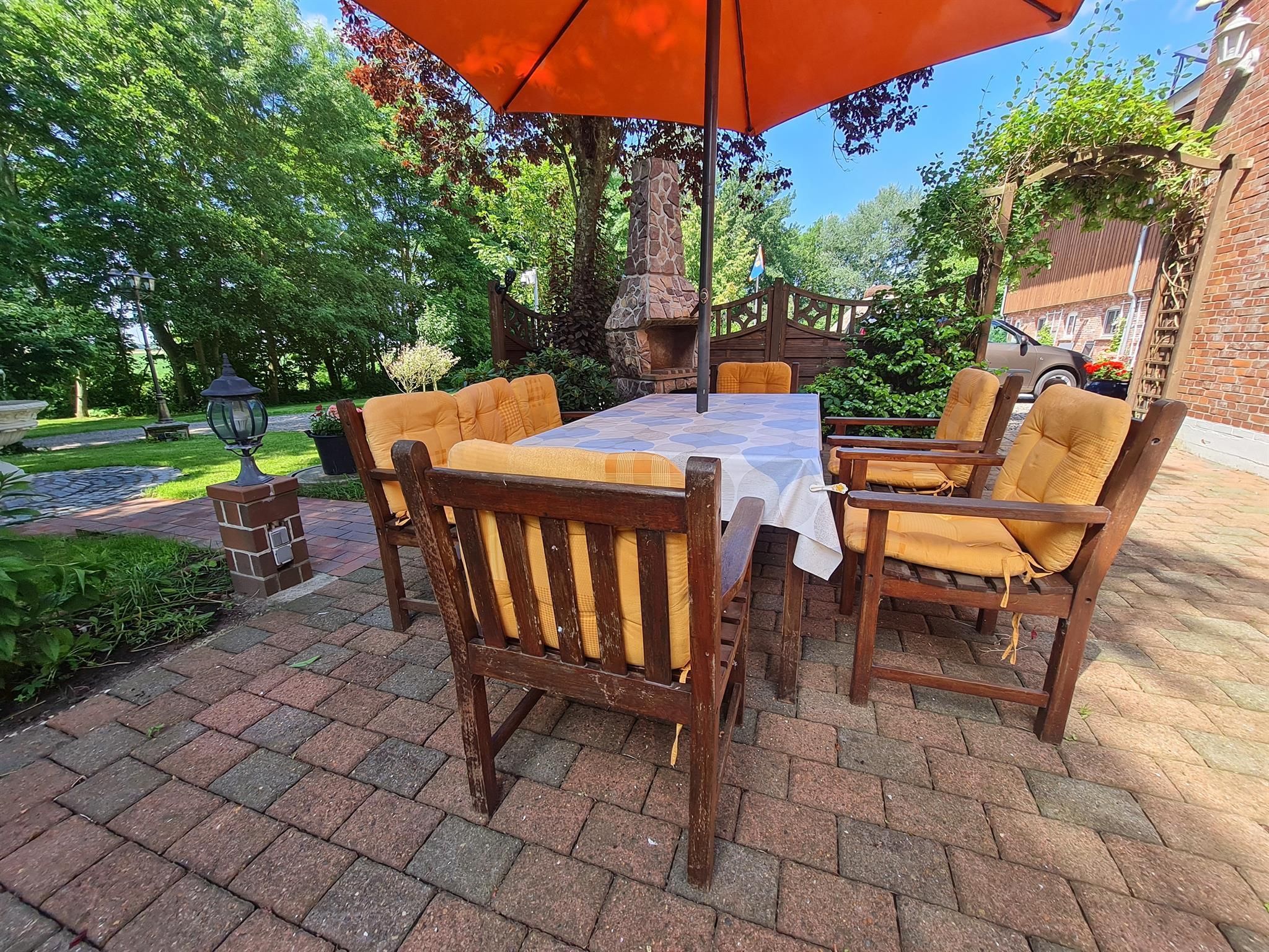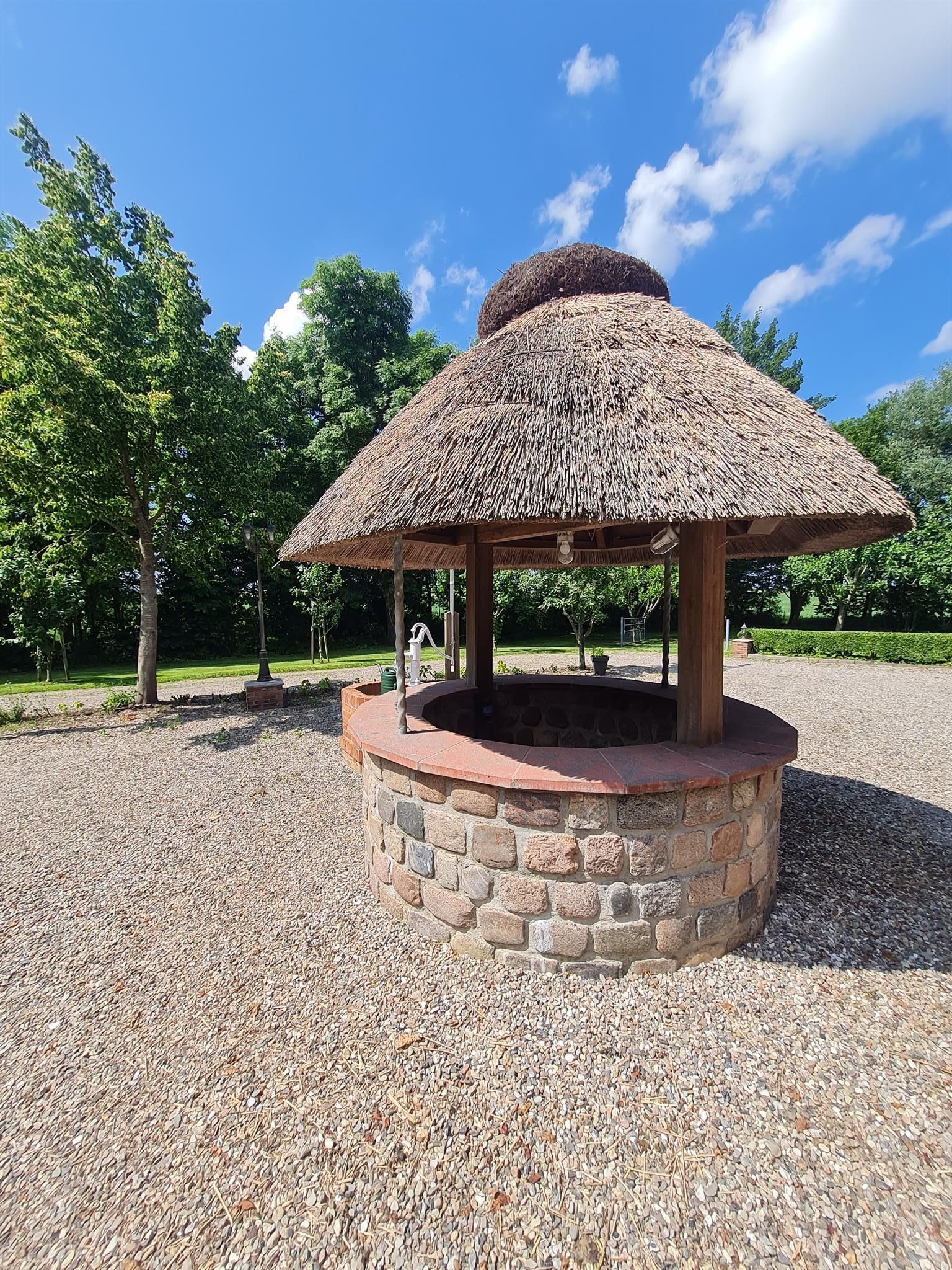 Eine Terassezum Grillen liegt direkt am Haus. Ein Spielplatz mit Trampolin und Fußballtor.