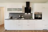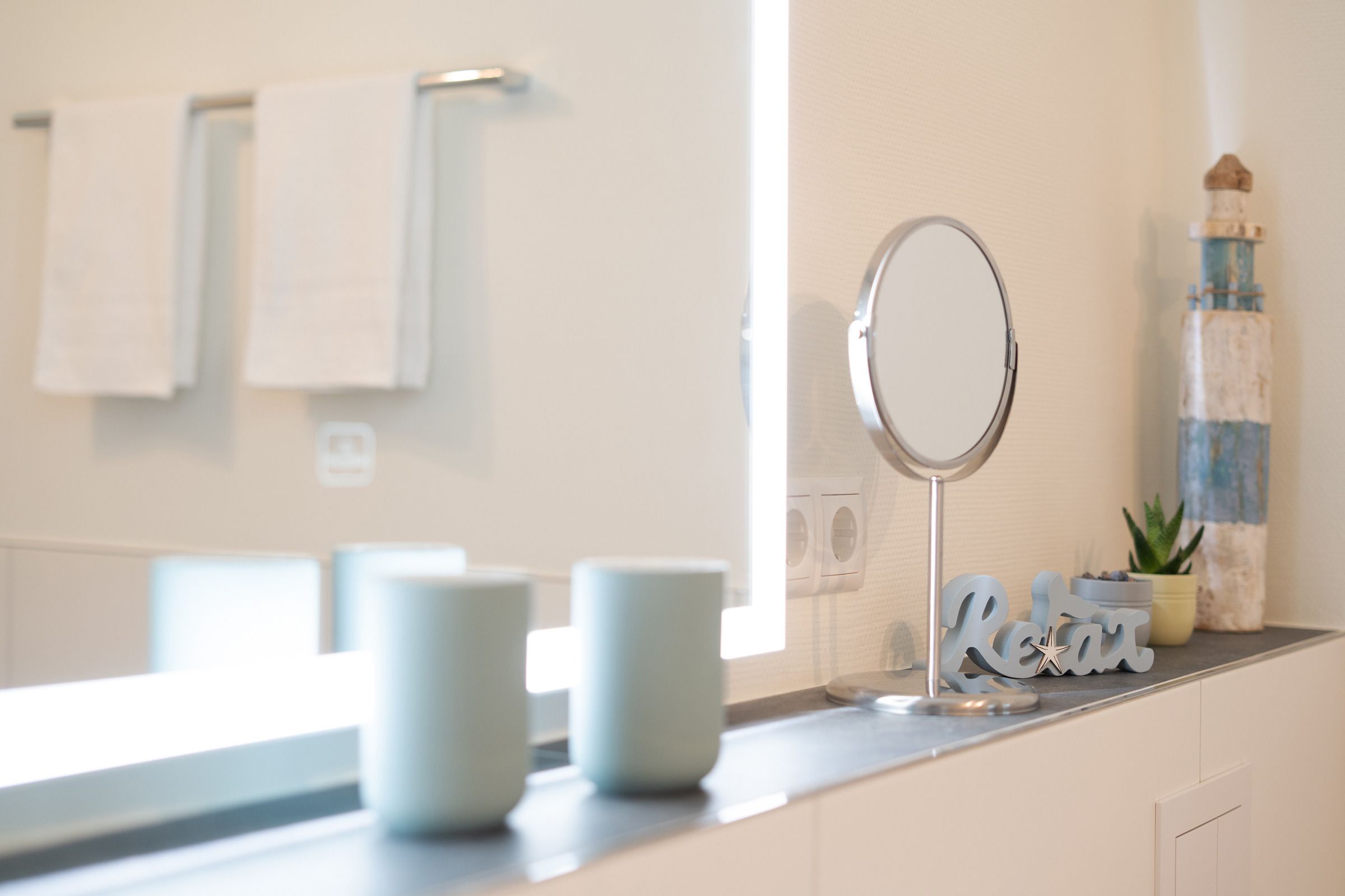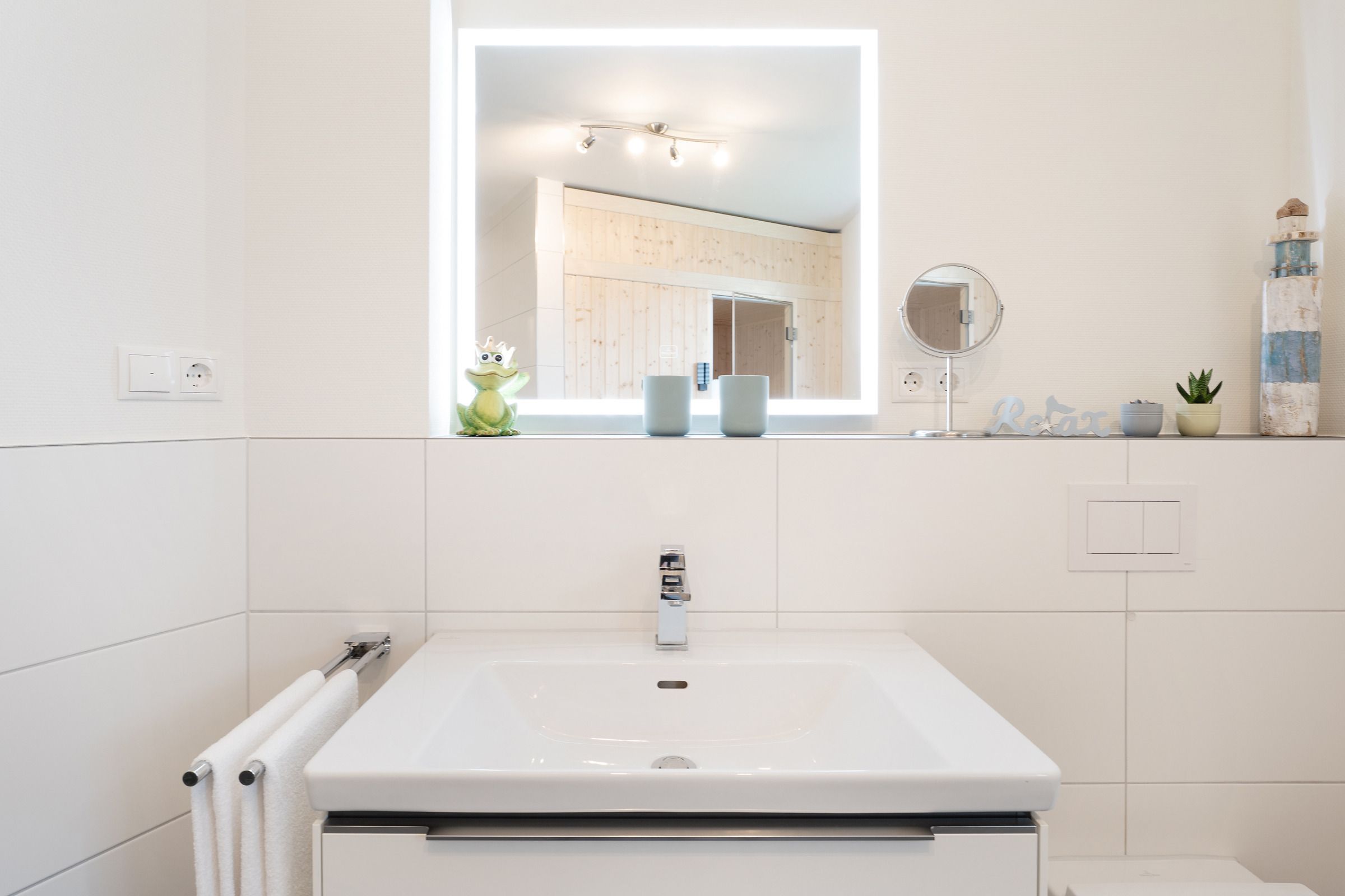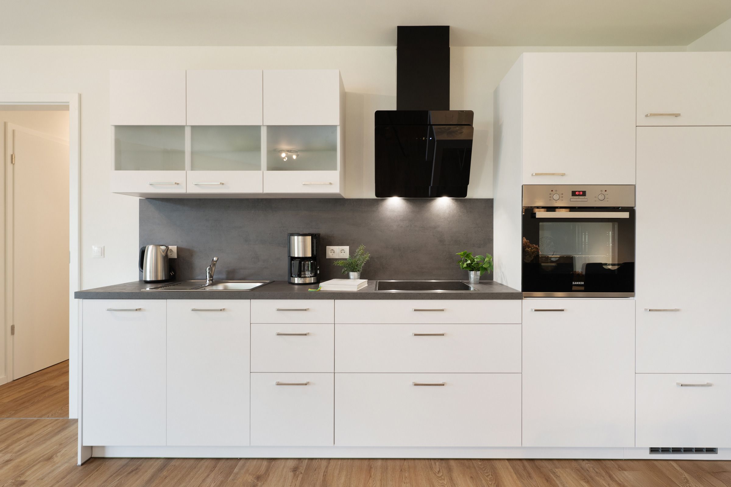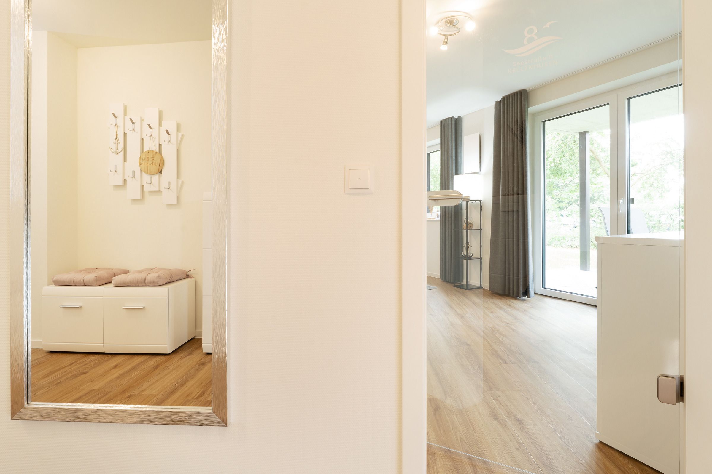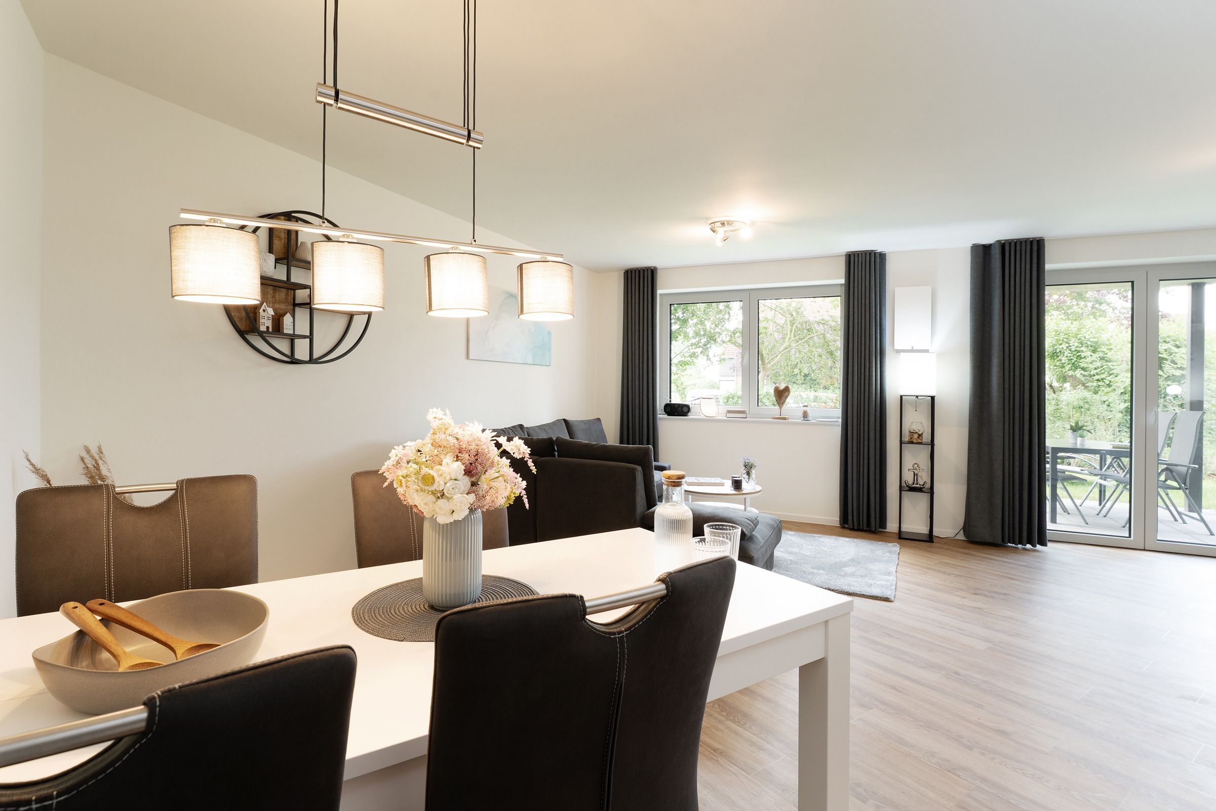 Die Küche ist modern und gut ausgestattet mit Ceran-Kochfeld, Backofen, Mikrowelle, Kühlschrank, Kaffeemaschine, Wasserkocher, Eierkocher und Toaster – hier bleiben keine Wünsche offen. Der angrenzende Essbereich bietet Platz für gemeinsame Mahlzeiten. Auf der Terrasse können Sie in den Gartenmöbeln entspannen und die frische Seeluft genießen.