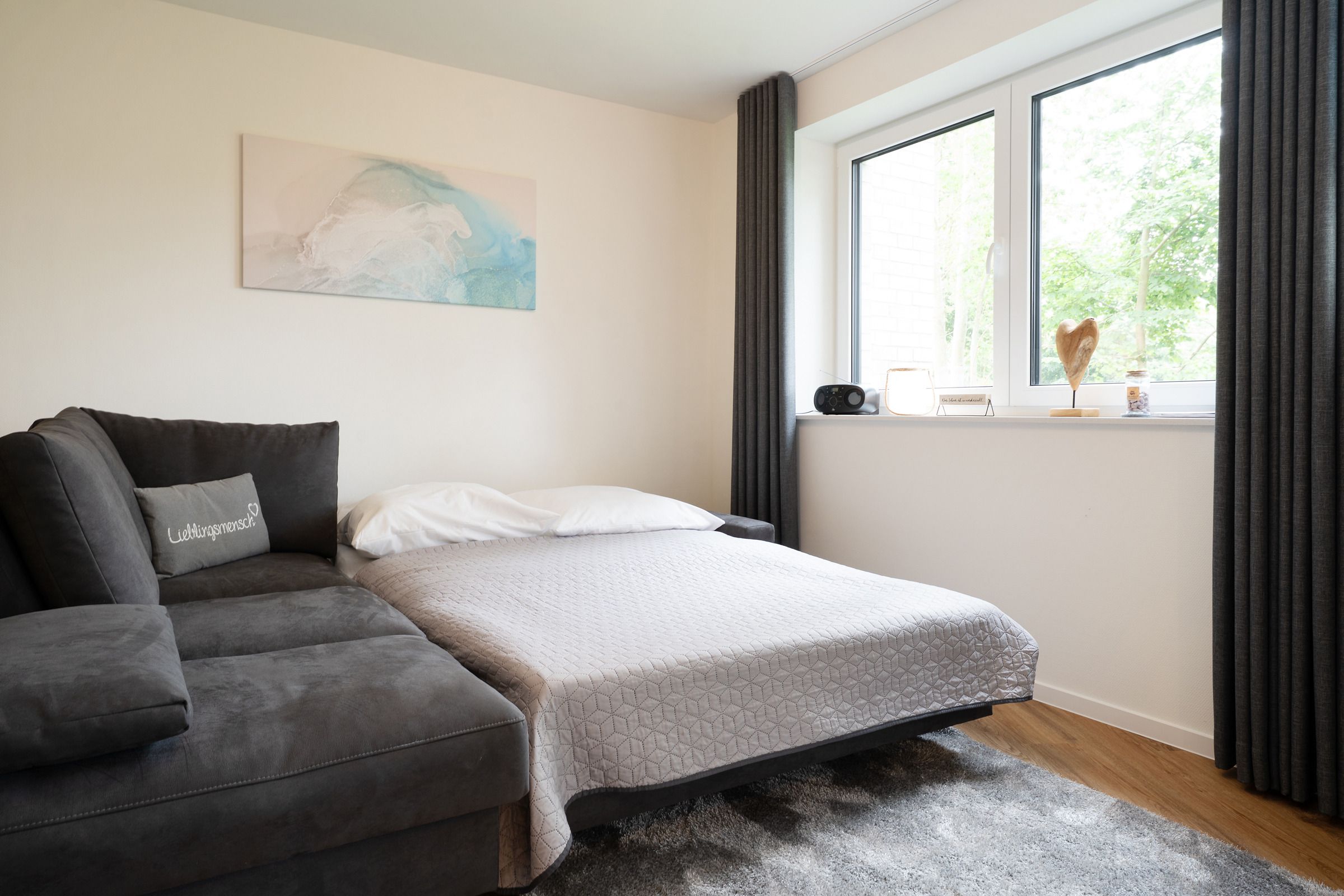 Im Schlafzimmer sorgen ein bequemes Doppelbett und ein Kleiderschrank für erholsamen Schlaf und ausreichend Stauraum. Zwei weitere Gäste kommen auf dem großen, komfortablen Schlafsofa im Wohnzimmer unter. Das moderne Bad ist mit einer bodengleichen Dusche einem WC und einem Haartrockner ausgestattet. Die perfekte Erholung wird von einer Sauna abgerundet.