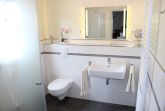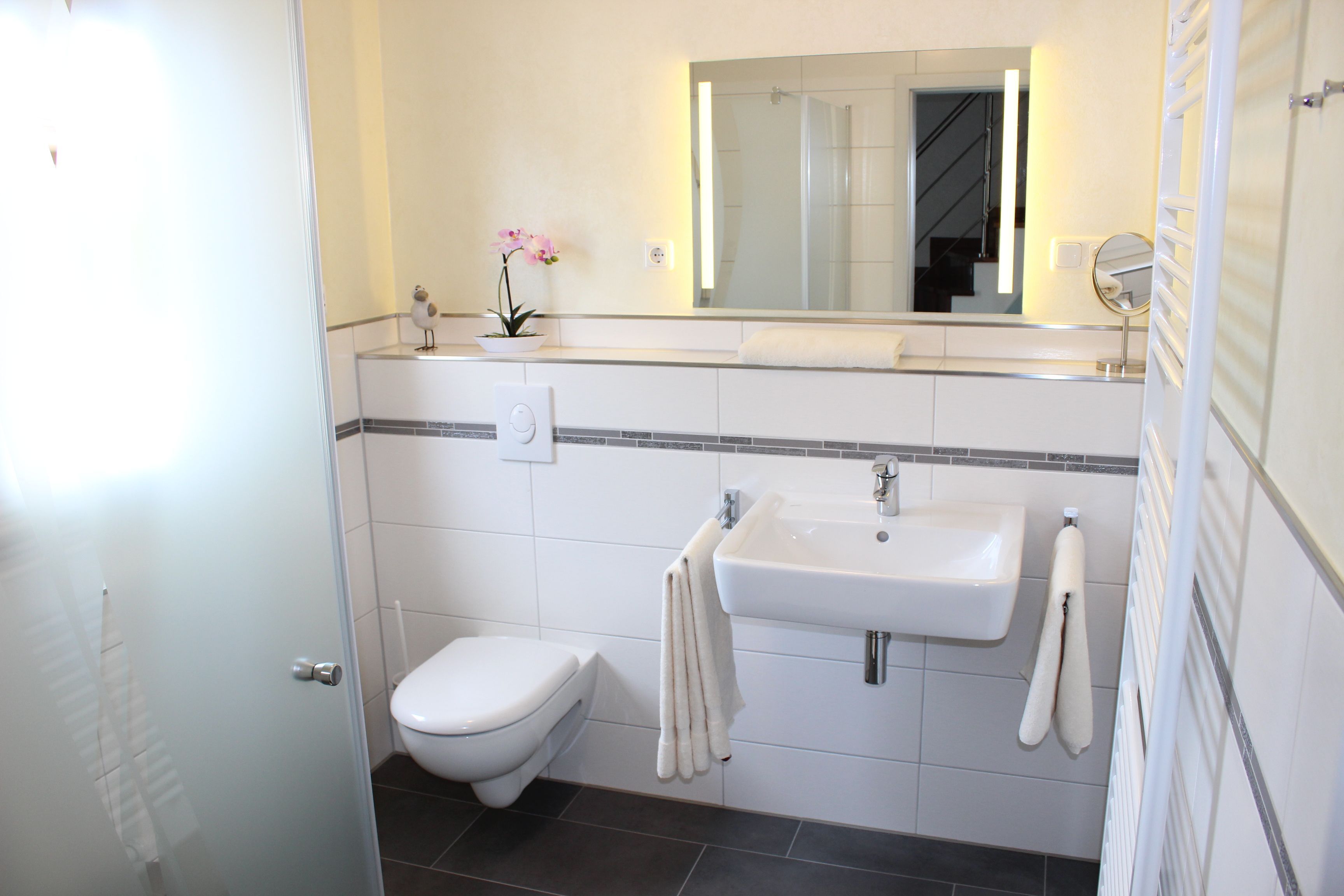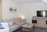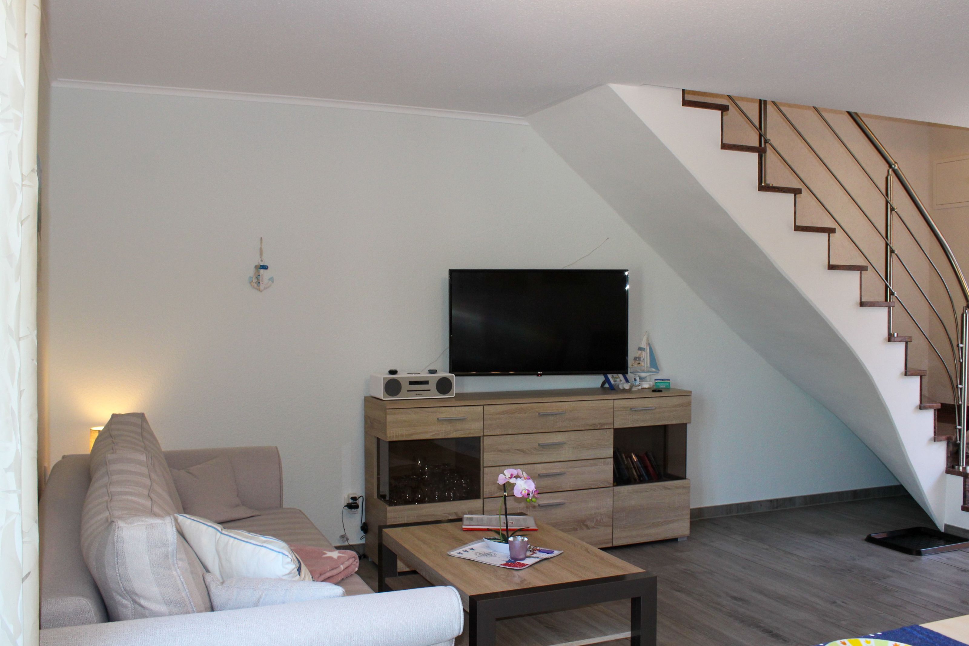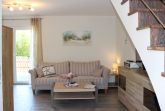 Am Esstisch bieten hochwertige Polsterstühle besonderen Sitzkomfort beim Genießen Ihrer Mahlzeit, Planungsrunden für den nächsten Urlaubstag oder einer Partie Mensch-ärgere-Dich-nicht. Den Wohnbereich komplettiert eine modern-behagliche Sitzgruppe. Hier haben Sie Zugang zu Medien wie LED-Fernseher mit Sat-Empfang, Radio und Wlan. Die Couch ist ausziehbar und kann als Aufbettung für eine Person genutzt werden. Ebenfalls im Erdgeschoss befindet sich das schicke Badezimmer mit Dusche, WC und Fußbodenheizung.