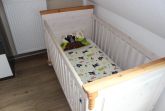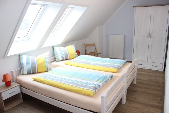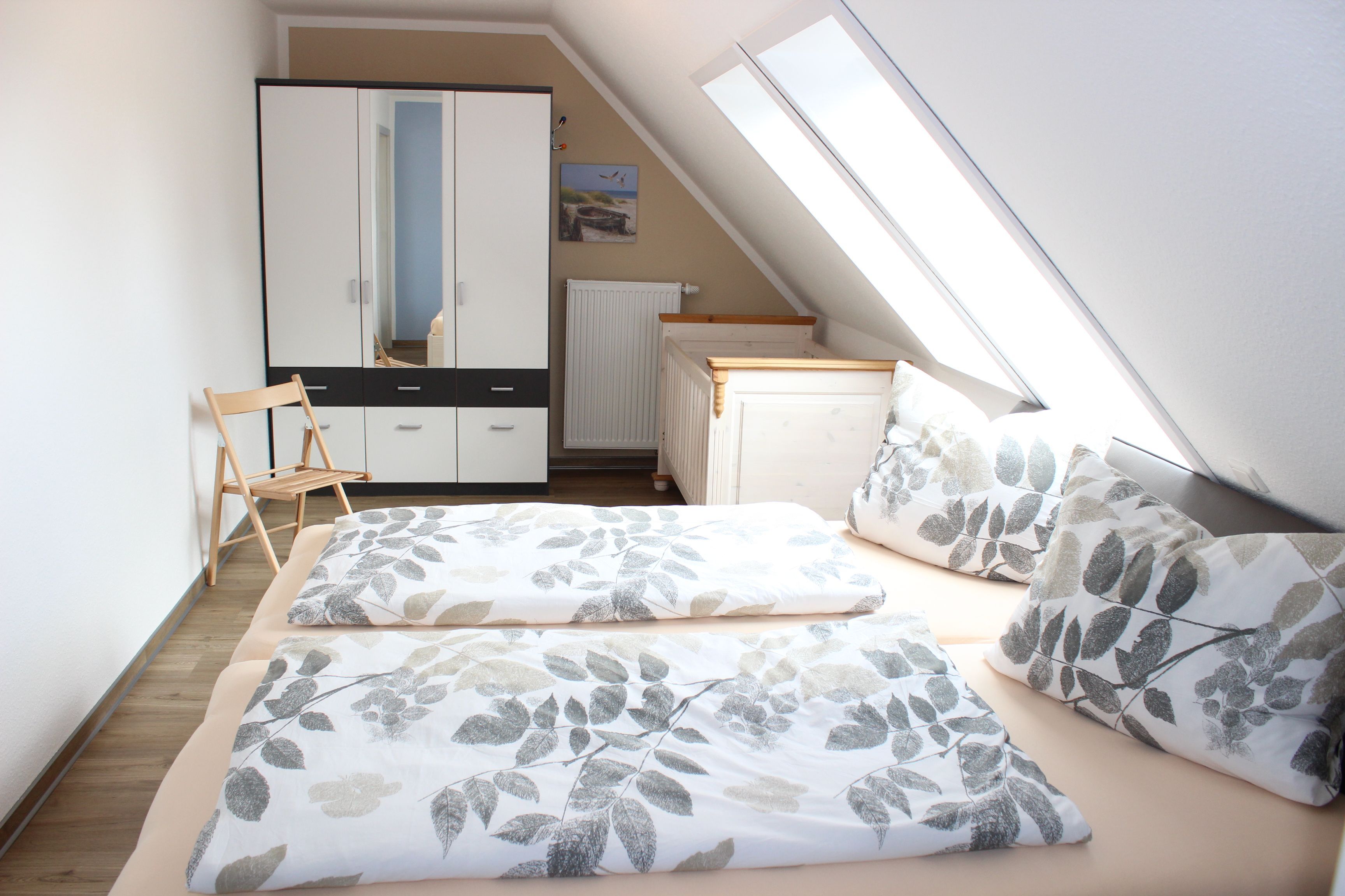 Gegenüber vom Bad führt eine Treppe ins Obergeschoss, wo die beiden Schlafräume liegen. Im größeren befindet sich ein Doppelbett sowie ein fest installiertes Gitterbett für Ihren Nachwuchs; nebenan stehen zwei Einzelbetten. Die Betten beziehen wir für Sie, fühlen Sie sich bei Anreise einfach zuhause! In beiden Zimmern gibt es Kleiderschränke mit verschiedenen Abteilen, sodass Ihnen genügend Stauraum für die Unterbringung von Lieblingskleidern und persönlichen Gegenständen zur Verfügung steht. Fenster durchbrechen die Dachschrägen - so fungiert der Usedomer Sternenhimmel als natürliches Nachtlicht!