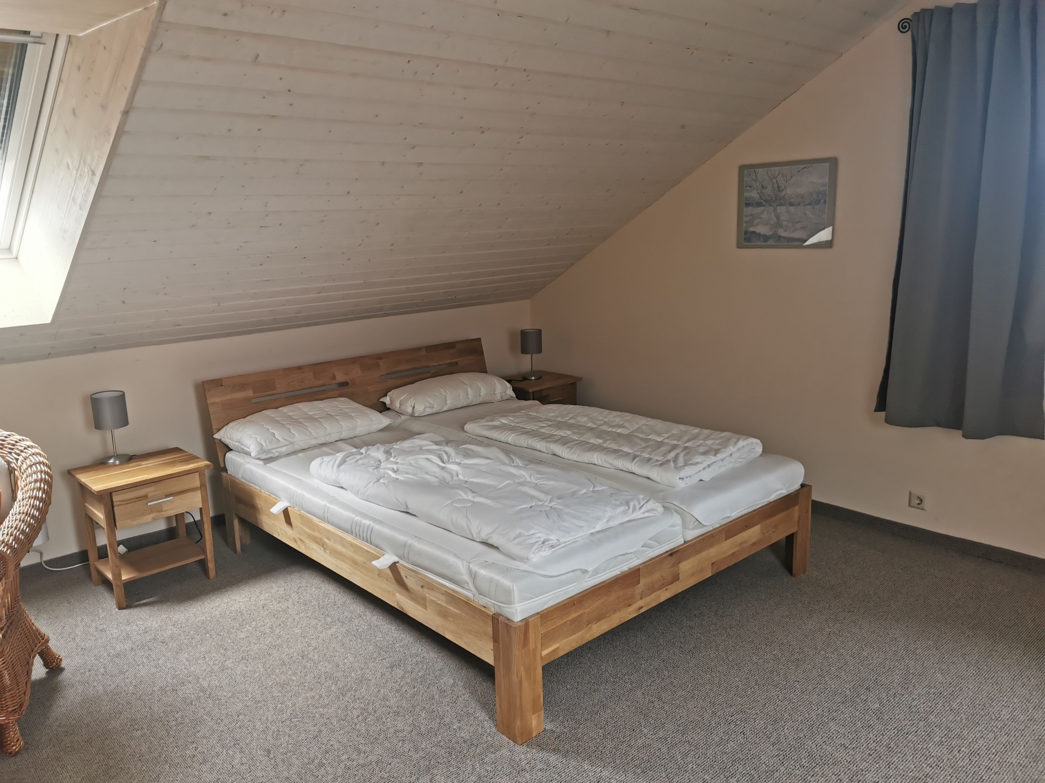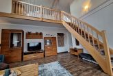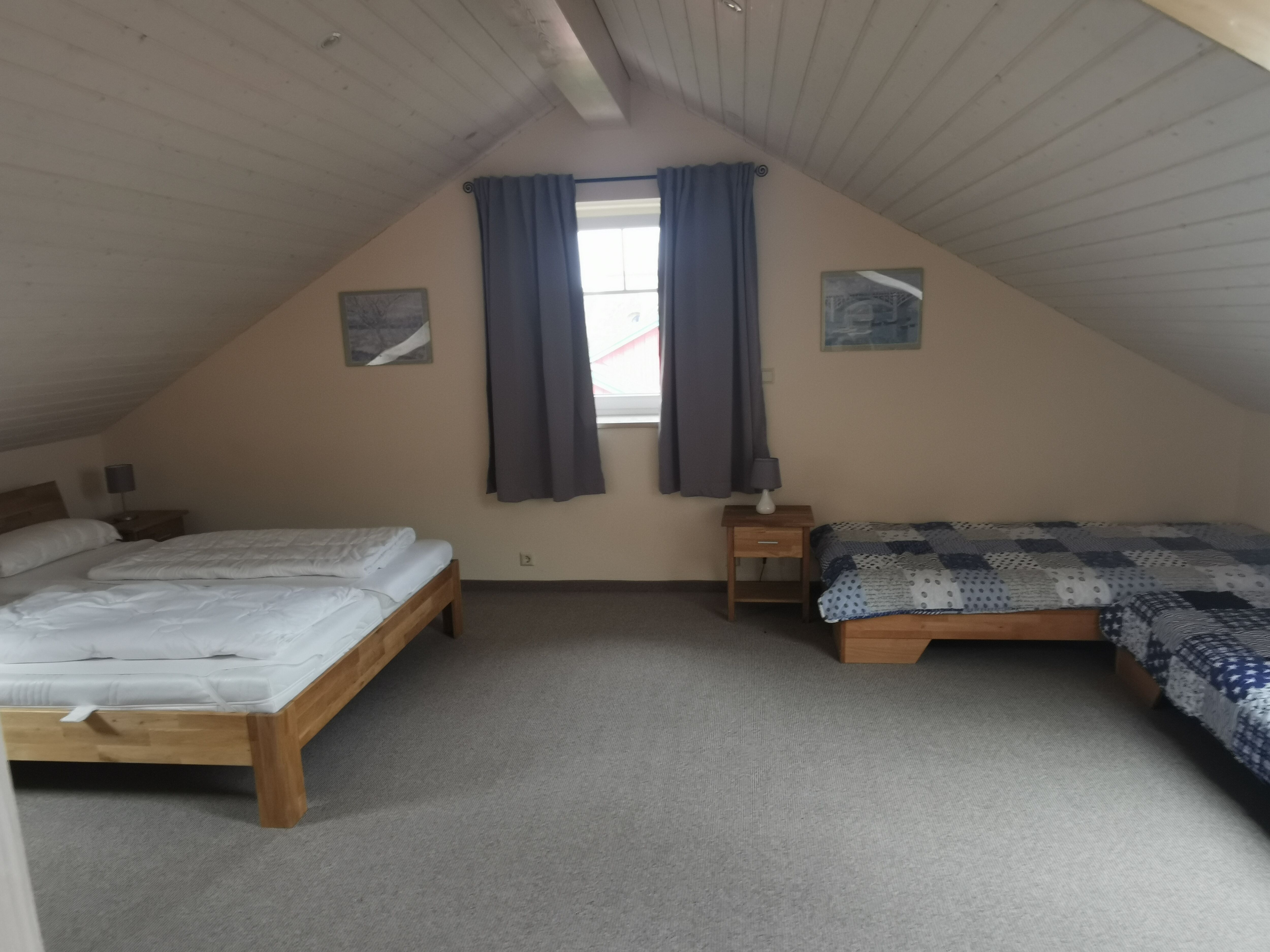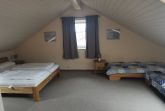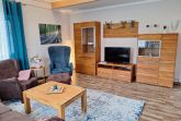 Das große und geräumige Wohnzimmer verfügt über eine große Sitzecke und 1 Sessel, sowie einer Anrichte und Flach-TV mit Stereo-Anlage. Über die Treppe gelangt man zur Schlafempore. Hier befindet sich ein Doppelbett, sowie 2 Einzelbetten. Ablagemöglichkeiten für Kleidung sind in mehreren Kommoden mit Türen bzw. Schubladen, sowie einem Kleiderständer. Ein Tisch mit Sesseln eignet sich bestens zum Spielen für Kinder. Ein kleines Mini-Zimmer verfügt über ein weiteres Einzelbett.