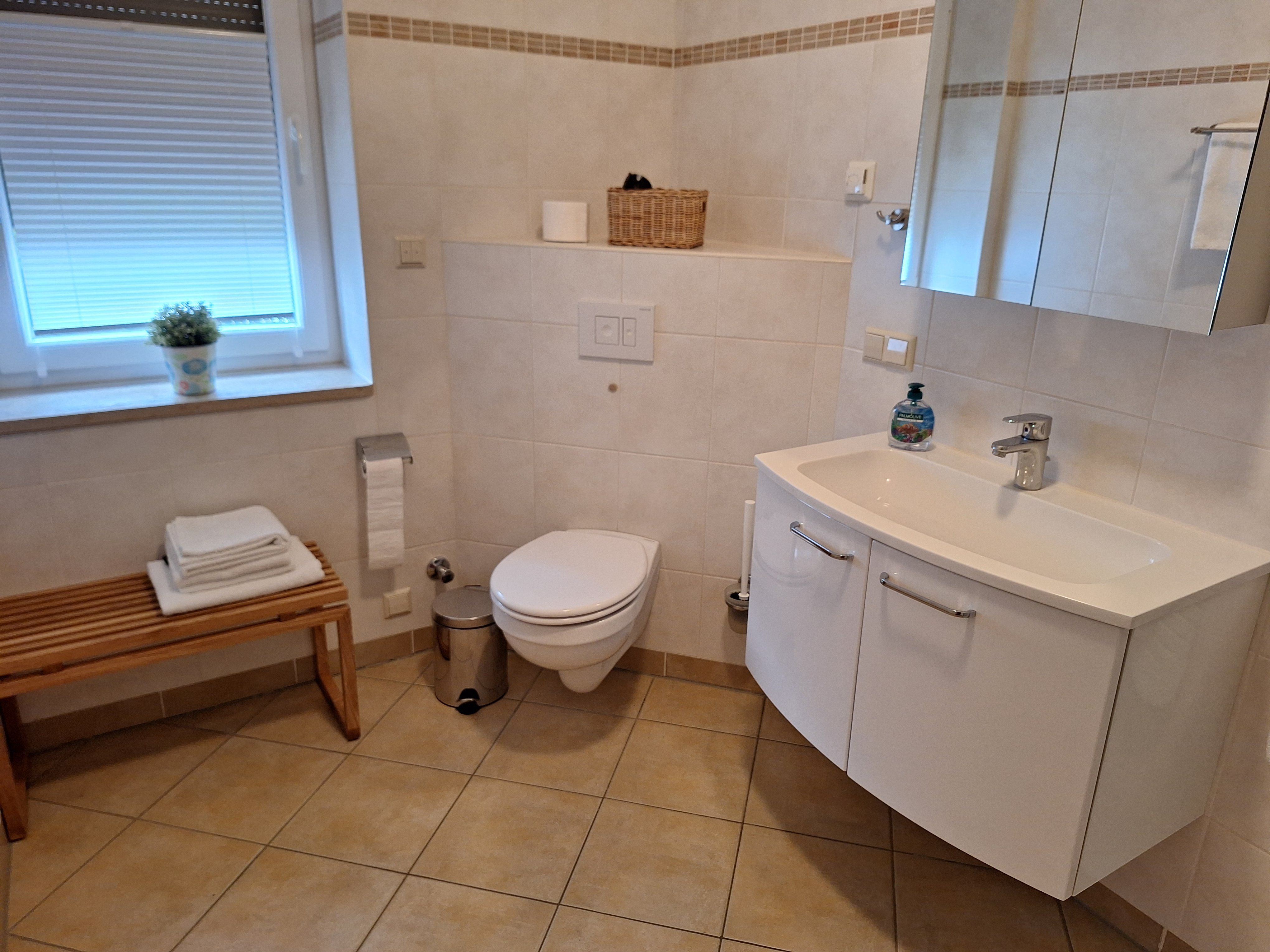 Das geräumige Tageslicht-Bad verfügt über Dusche, WC, Waschbecken, Haartrockner etc. Für Kleinkinder sind ein Reisebettchen und ein Hochstuhl vorhanden. Gartenmöbel und Grill stehen zur Verfügung und laden zur Nutzung auf der sonnigen Terrasse ein.