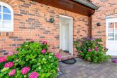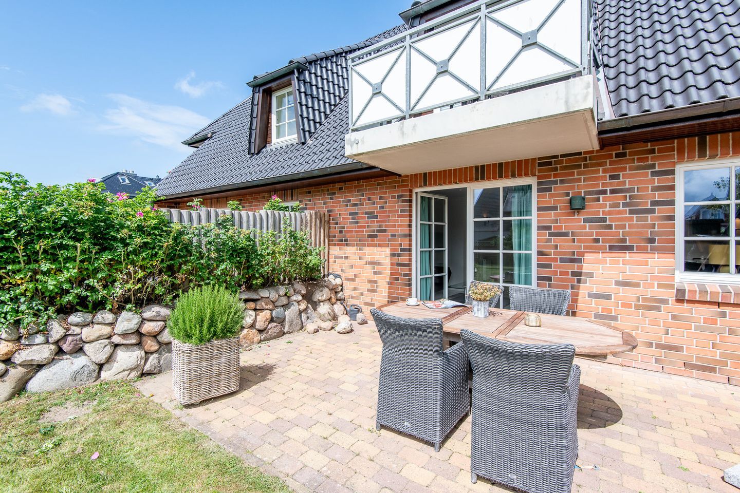 Ein echtes Highlight ist der großzügige, eingefriedete Garten, der Ihnen zur alleinigen Nutzung zur Verfügung steht. Hier erwarten Sie ein Sylt-Strandkorb, ein großer Esstisch, bequeme Gartenmöbel und ein Sonnenschirm – perfekt für sonnige Frühstücke oder laue Abende unter freiem Himmel. Ihre Fahrräder können Sie sicher hinter dem Haus abstellen.