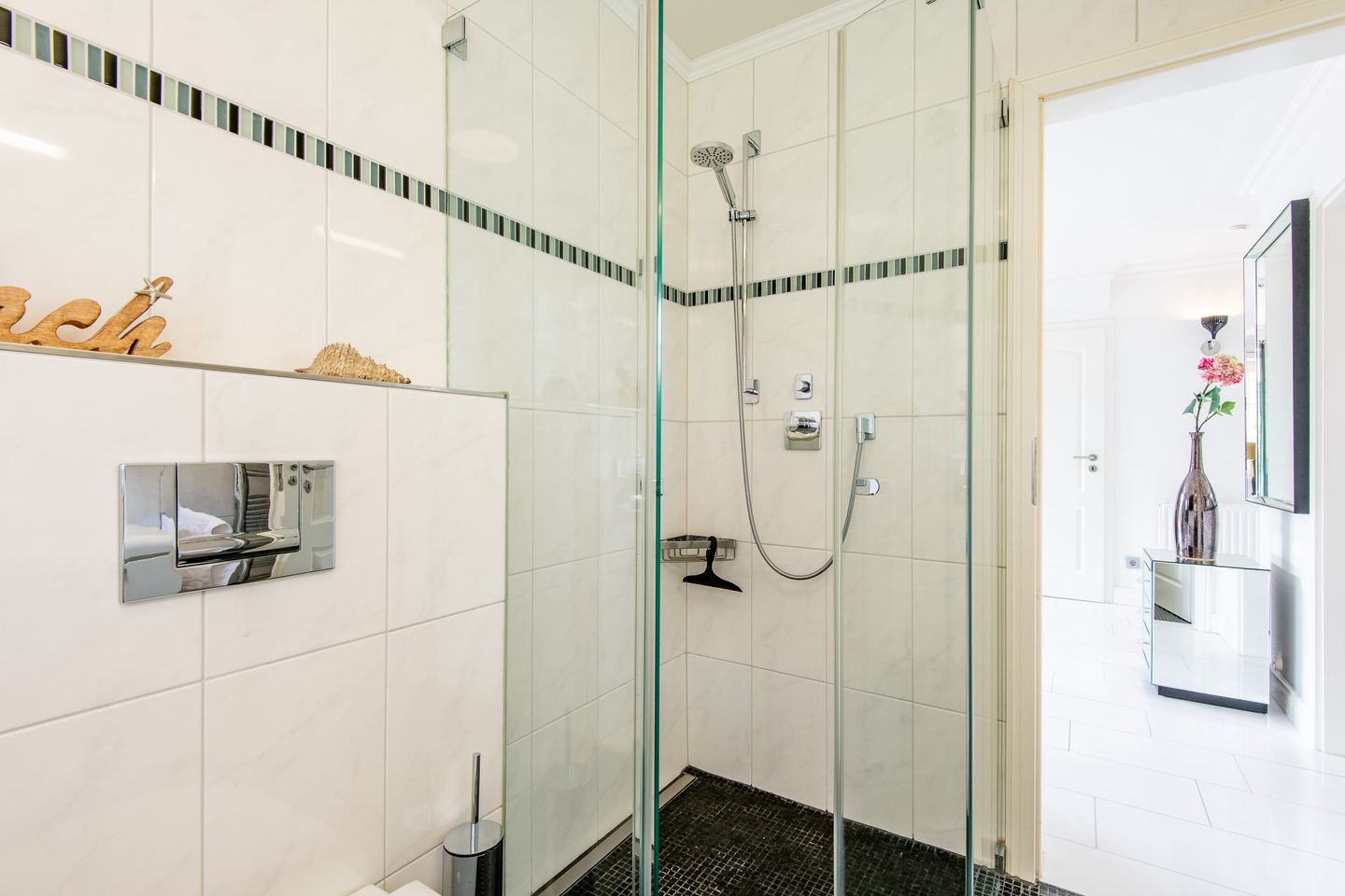 Das Tageslichtbad ist mit Dusche, WC, Waschtisch und Fön ausgestattet und bietet zusätzlich eine Waschmaschine – praktisch für längere Aufenthalte oder Strandtage mit viel Sand.