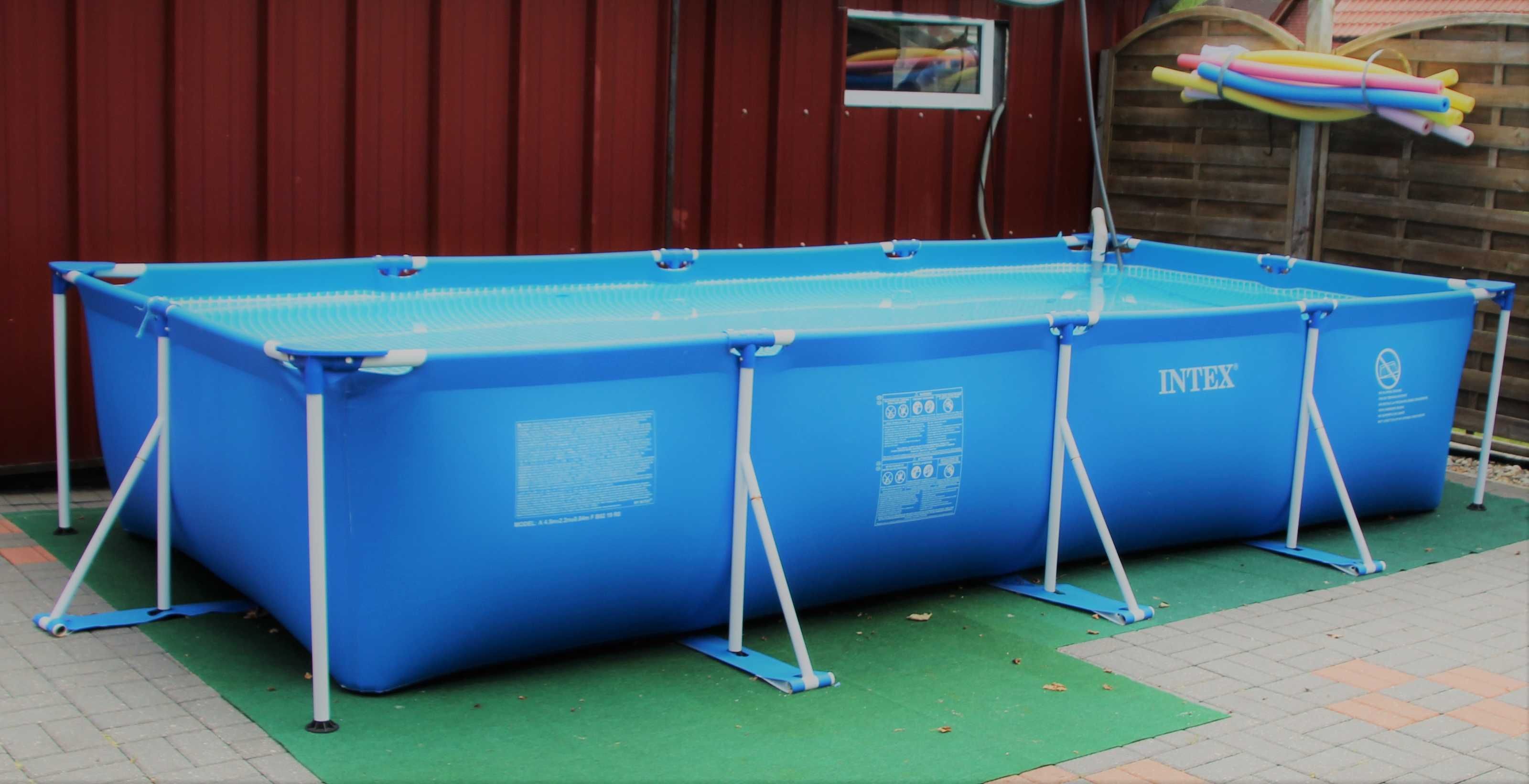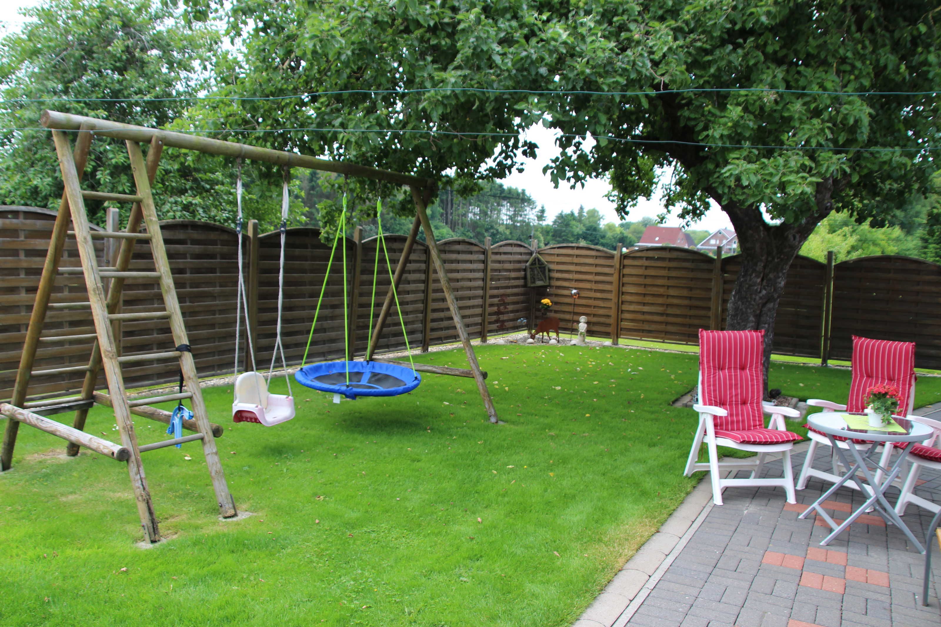 Eine Terrasse /Garten mit Gartenmöbeln Spielbereich und Pool lädt zum Verweilen ein.