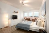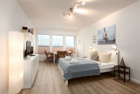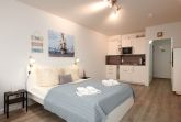 Klein und fein - mit viel Liebe ist der Wohn/Schlafbereich dieser zauberhaften Wohnung eingerichtet. Am Fenster befindet sich ein gemütlicher Essplatz, von dem Sie einen traumhaften Blick über den Hafen von Laboe und die Kieler Förde haben. Die moderne Küchenzeile ist mit einem Induktionsherd, einem Backofen, einer Mikrowelle und einem Kühlschrank mit Gefrierfach ausgestattet. Herrlich träumen werden Sie in dem bequemen Doppelbett (160x200cm). Auch von dort aus haben Sie das Wasser gut im Blick. Im Flur steht Ihnen ein Kleiderschrank, eine Kommode und eine Garderobe zur Verfügung. Das innenliegende Duschbad ist hell gefliest.