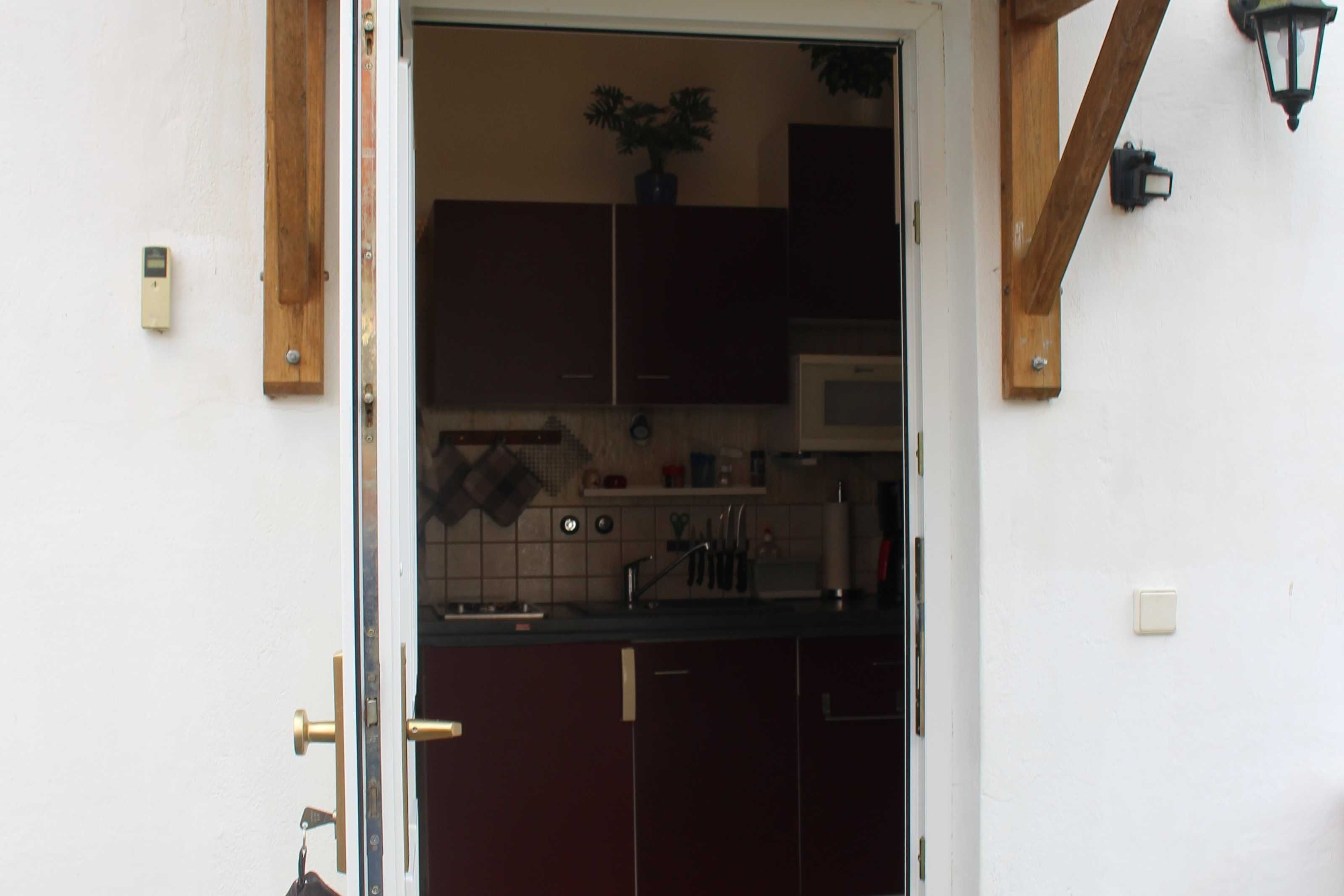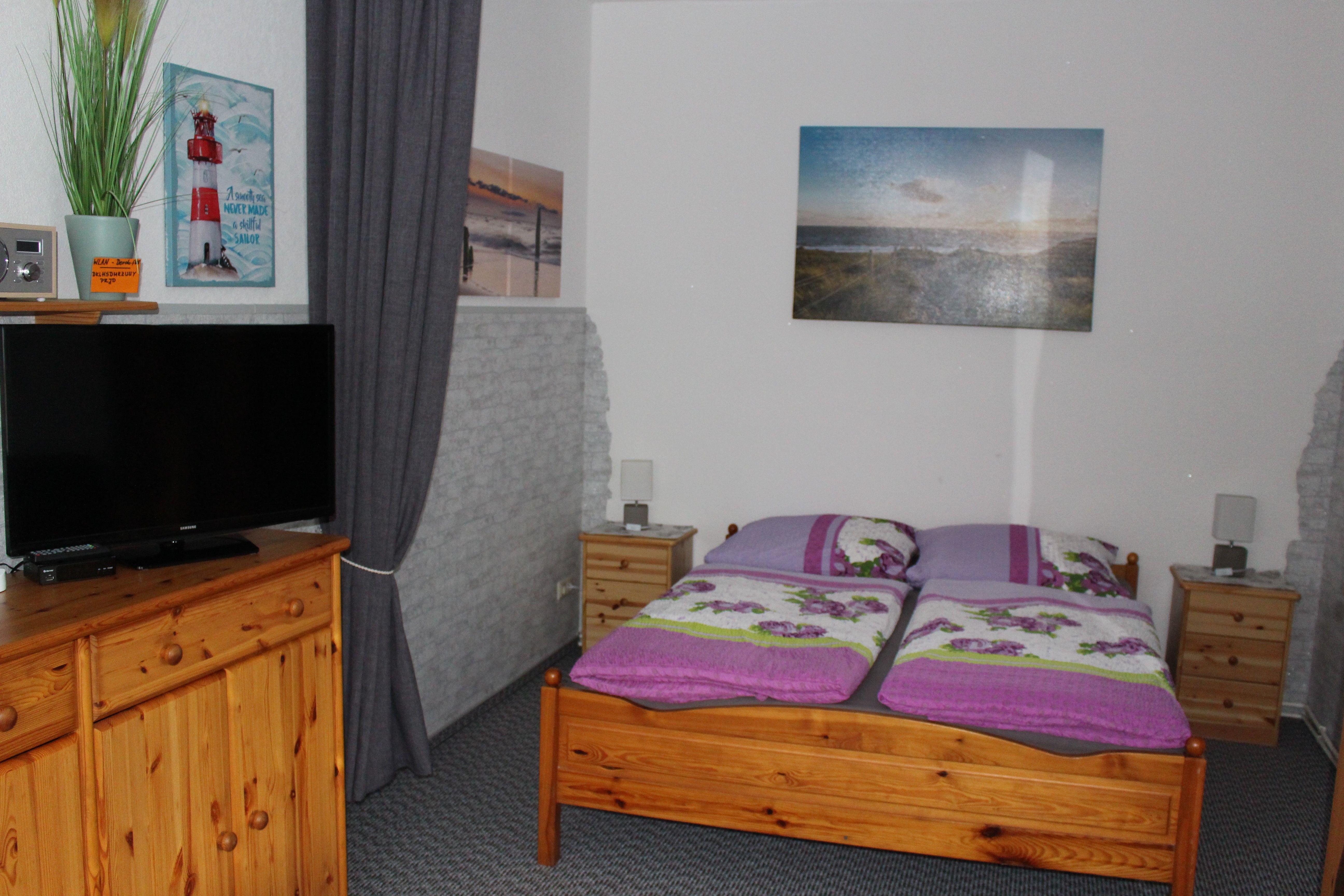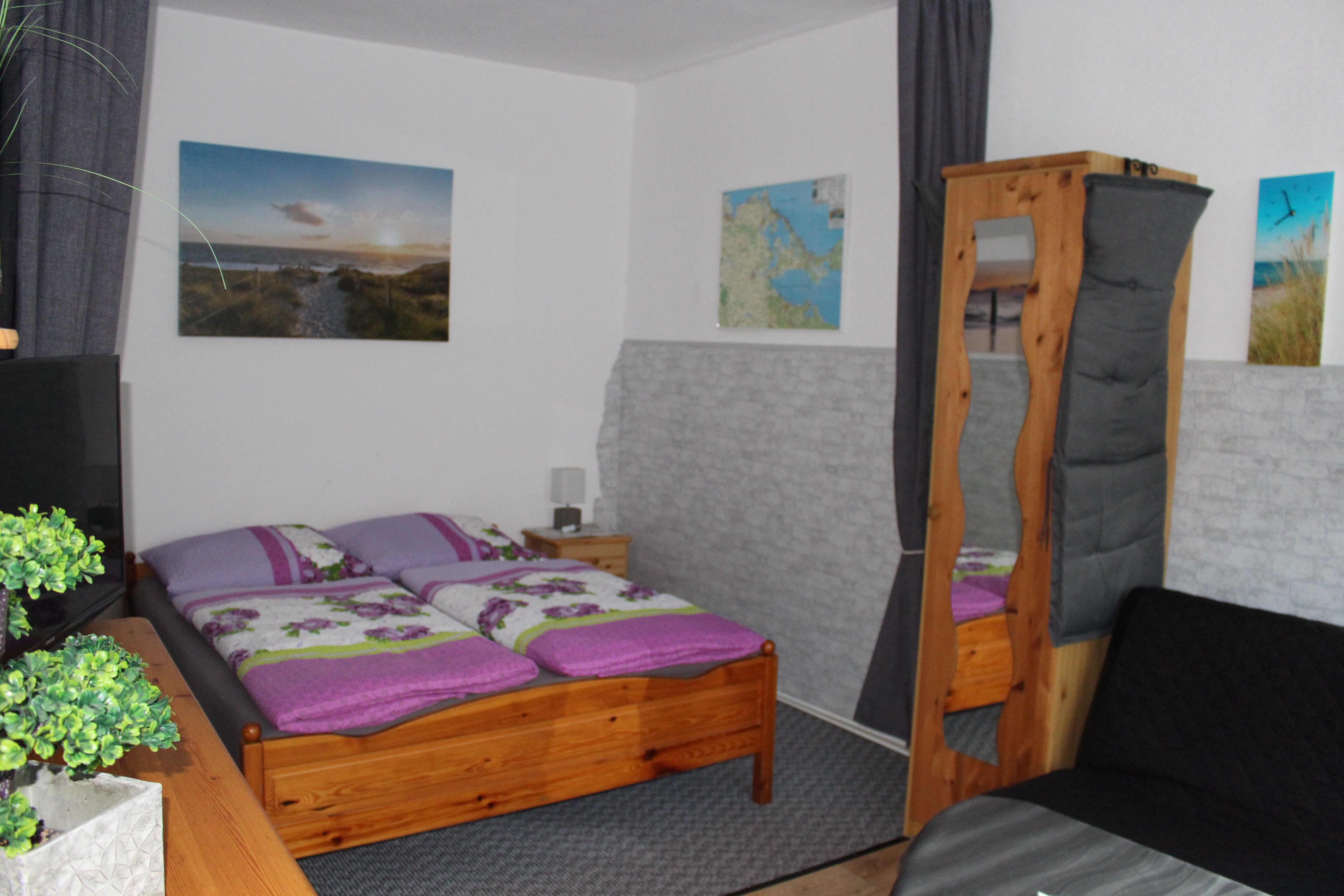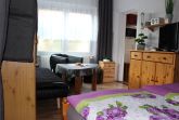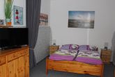 1 Raum Ferienwohnung, kombinierter Wohn- und Schlafraum (24 qm) mit TV, Radio, Doppelbett und Sitzgarnitur. Der Schlafbereich ist mit Teppichboden und der Wohnbereich mit Laminat ausgelegt. Der Flur und der Küchenbereich sind gefliest. Pantry-Küche mit Kochgelegenheit, Kühlschrank, Kaffeemaschine und Minibackofen. Gefliestes Bad mit Dusche und WC. PKW-Stellplatz am Haus. Bettwäsche und Geschirrtücher werden durch Vermieter gestellt, Handtücher bitte mitbringen. Eine Aufbettung mit Zustellbett für Kinder bis 17 Jahren möglich.Gartenmöbel und Grillgelegenheit vorhanden. Der Vermieter wohnt im Haupthaus und ist Halter von 2 Dalmatiner, die Fremden gegenüber sehr aufgeschlossen sind.
