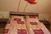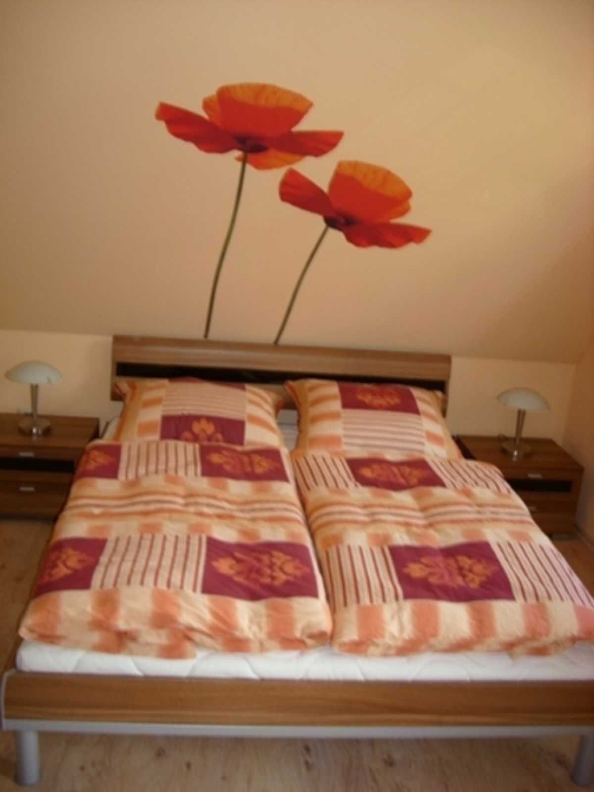 Im Dachgeschoss ist ein Schlafraum mit Doppelbett und großem Kleiderschrank,