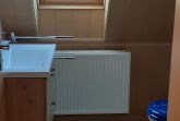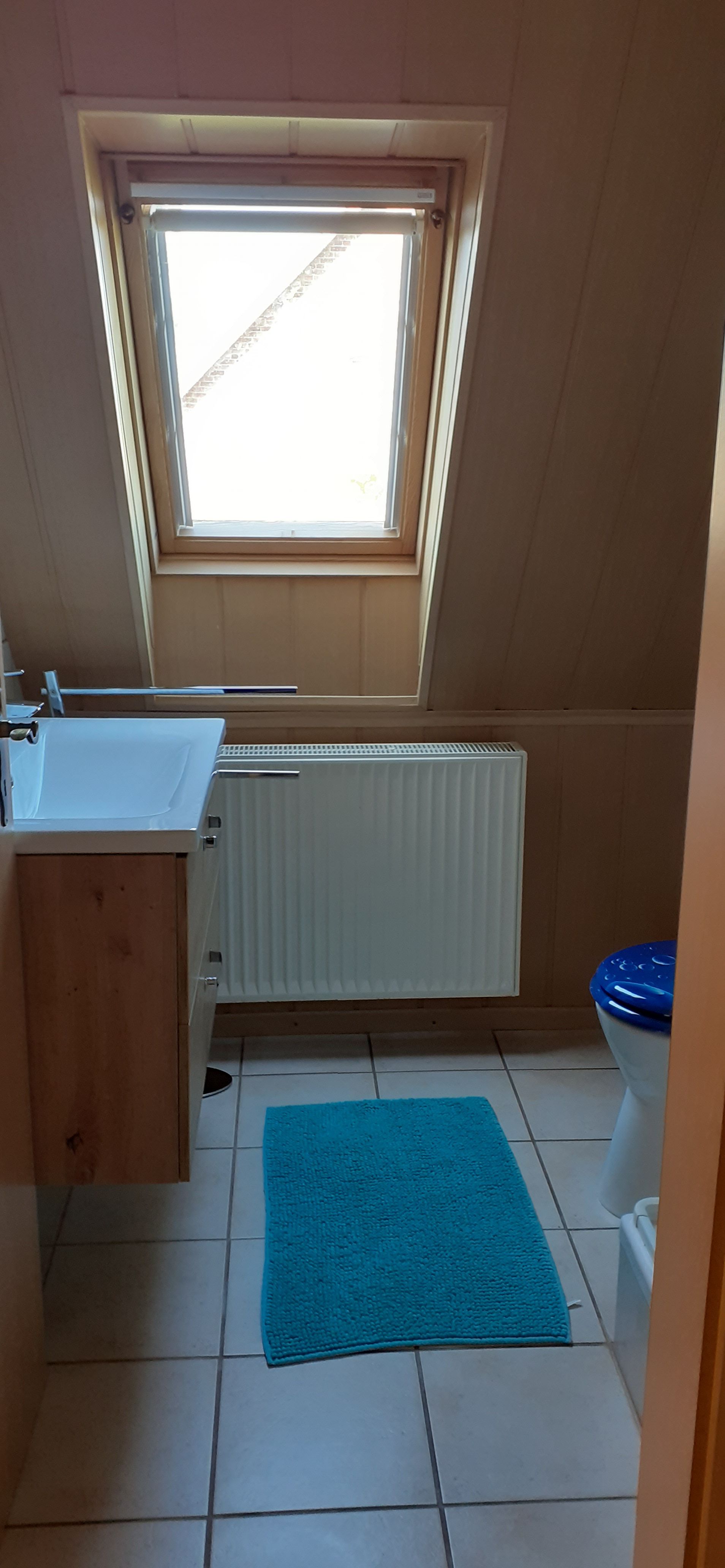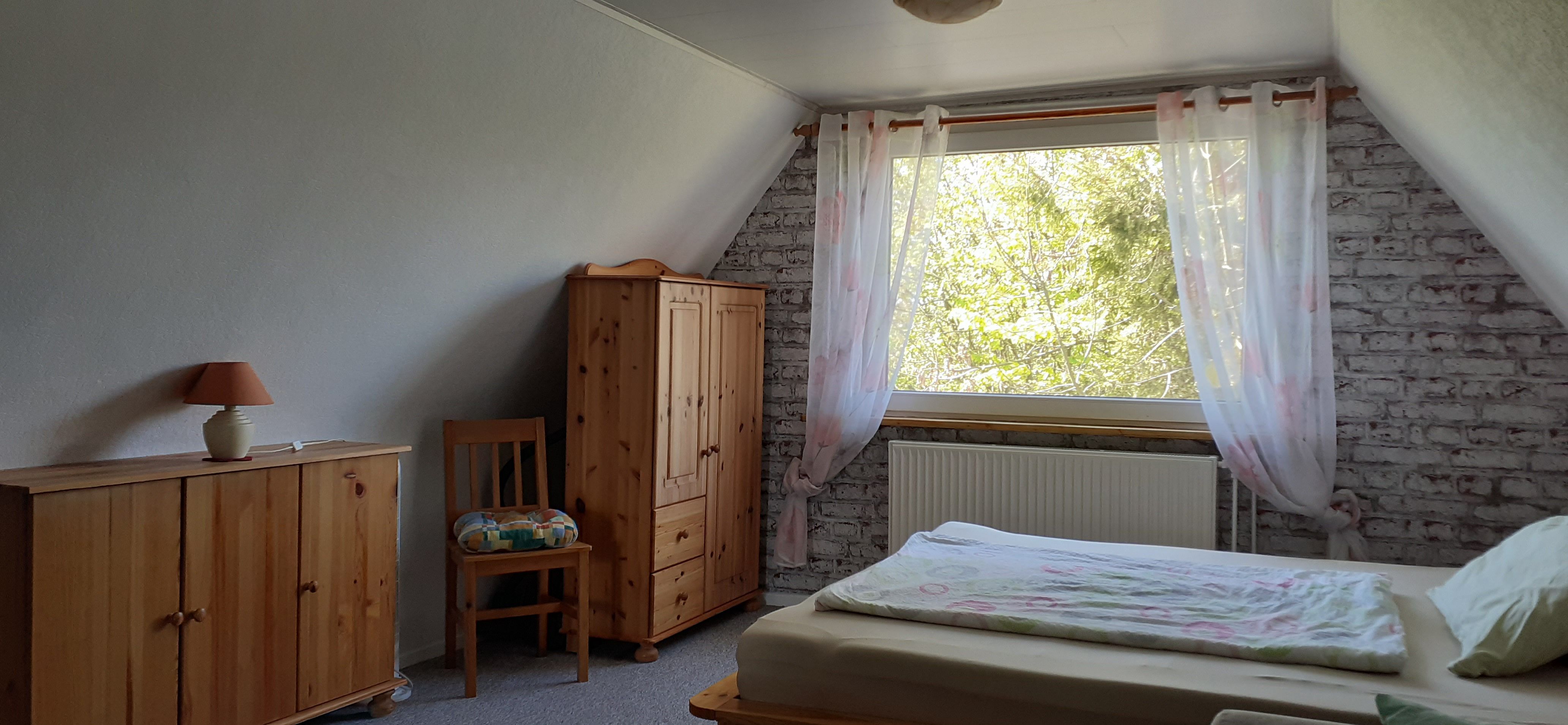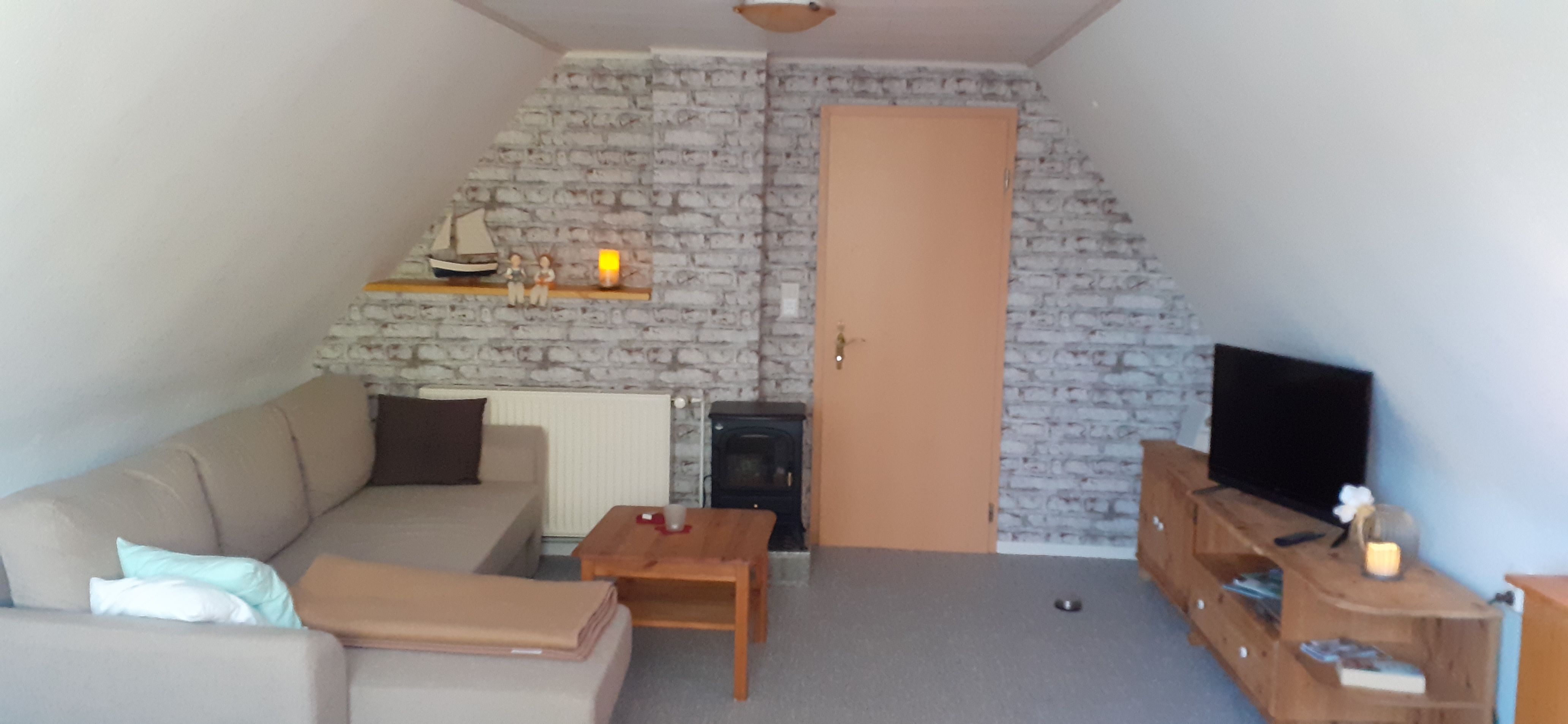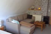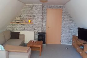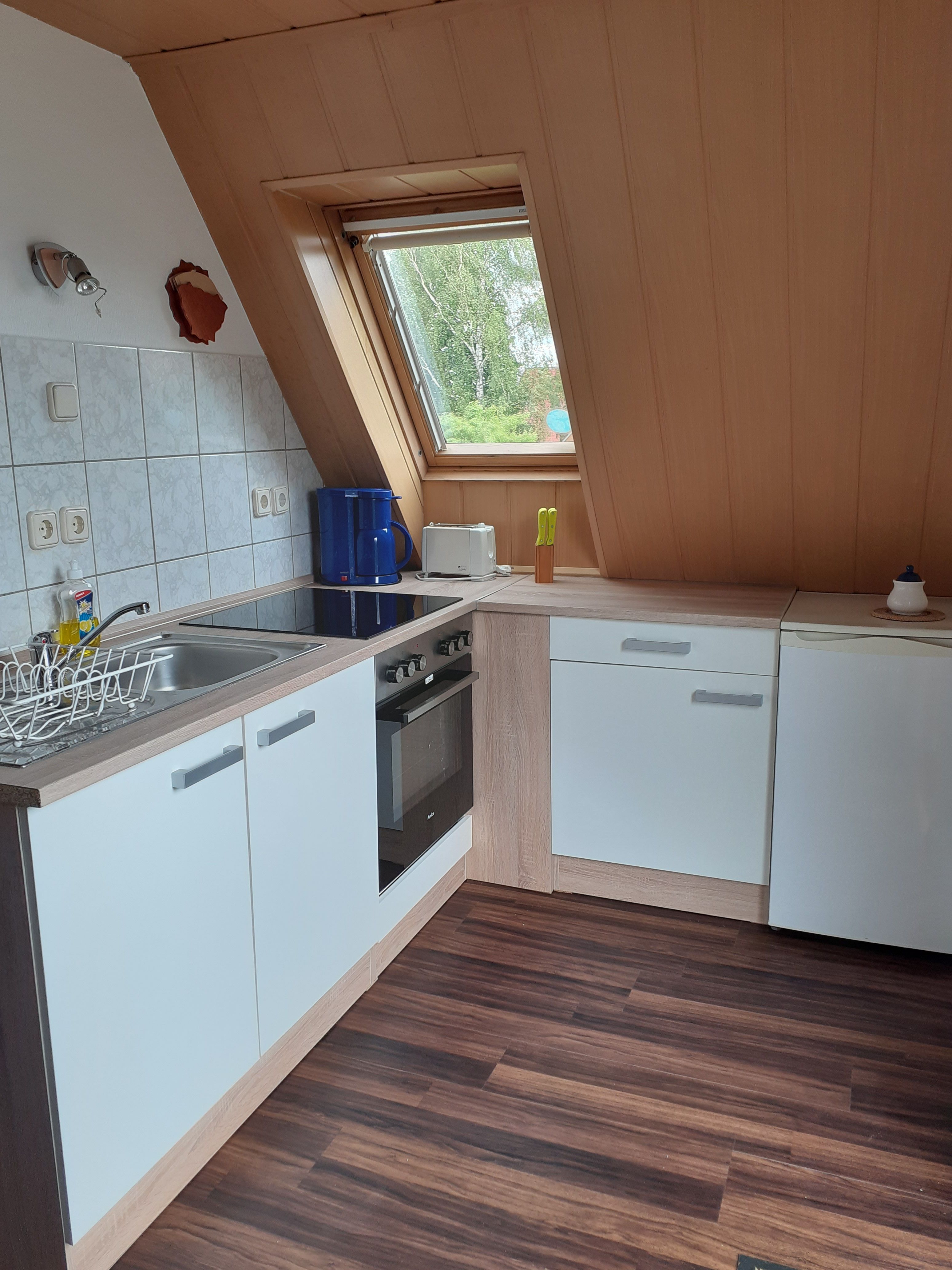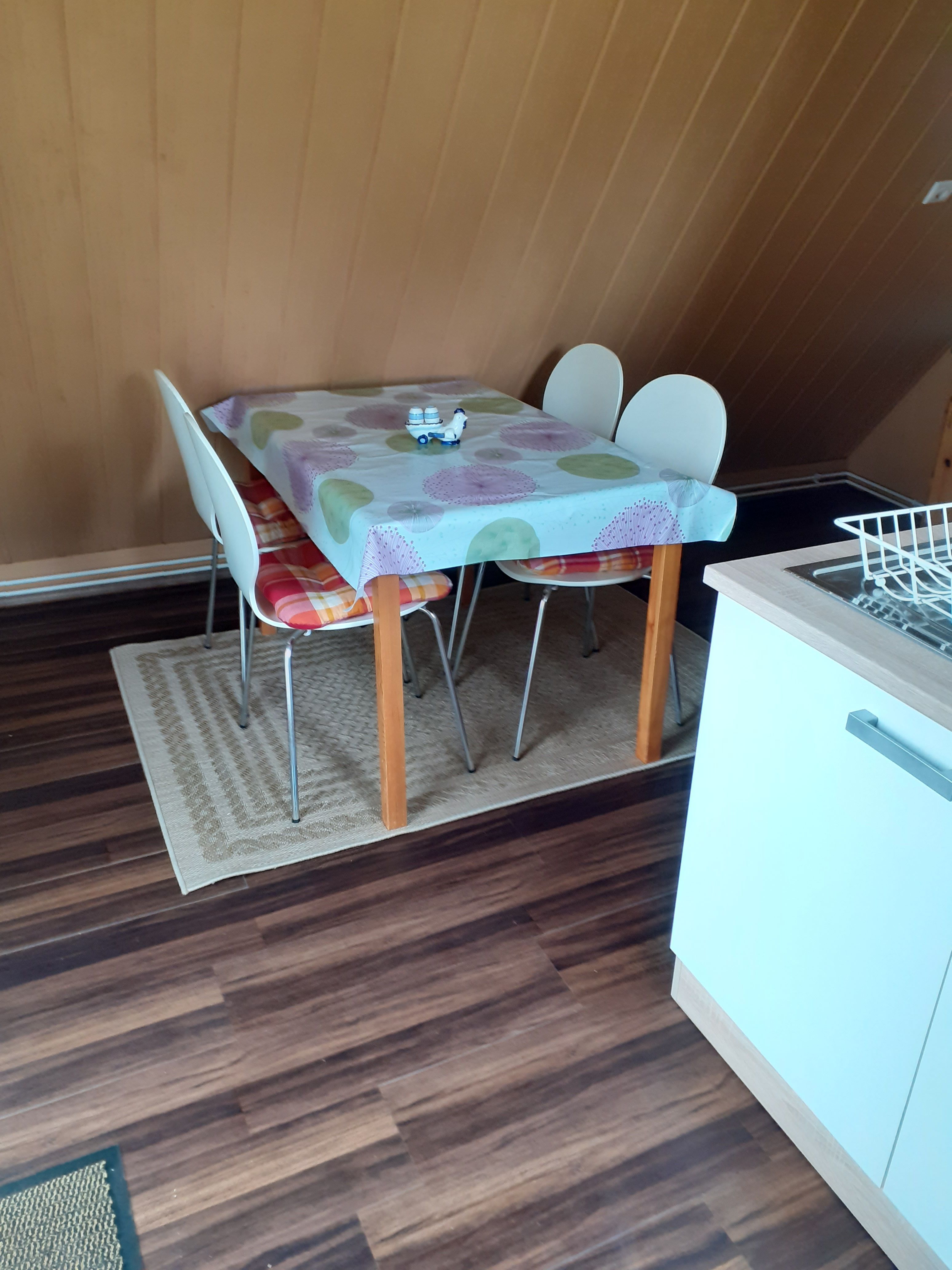 Kleine gemütliche Fewo (ca 35 m² - komb. Wohn-/Schlafzimmer, Küche, Bad) bis 3 Personen im Dachgeschoss unseres Nebengebäudes, erreichbar über eine Wendeltreppe. Das kombinierte Zimmer ist ausgestattet mit Doppelbett und Eckcouch(Aufbettung)sowie TV und CD-Anlage . In der Küche befinden sich Essecke, E-Herd, Kühlschrank, Kaffeemaschine, Toaster und ausreichend Geschirr. Eine Sitzecke im Garten lädt zu schönen Sommerabenden im Freien ein (Grillausleih möglich).