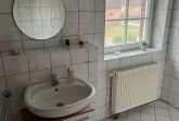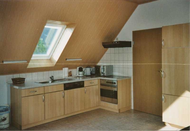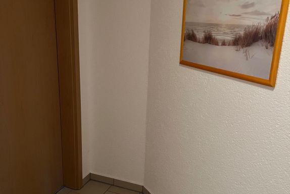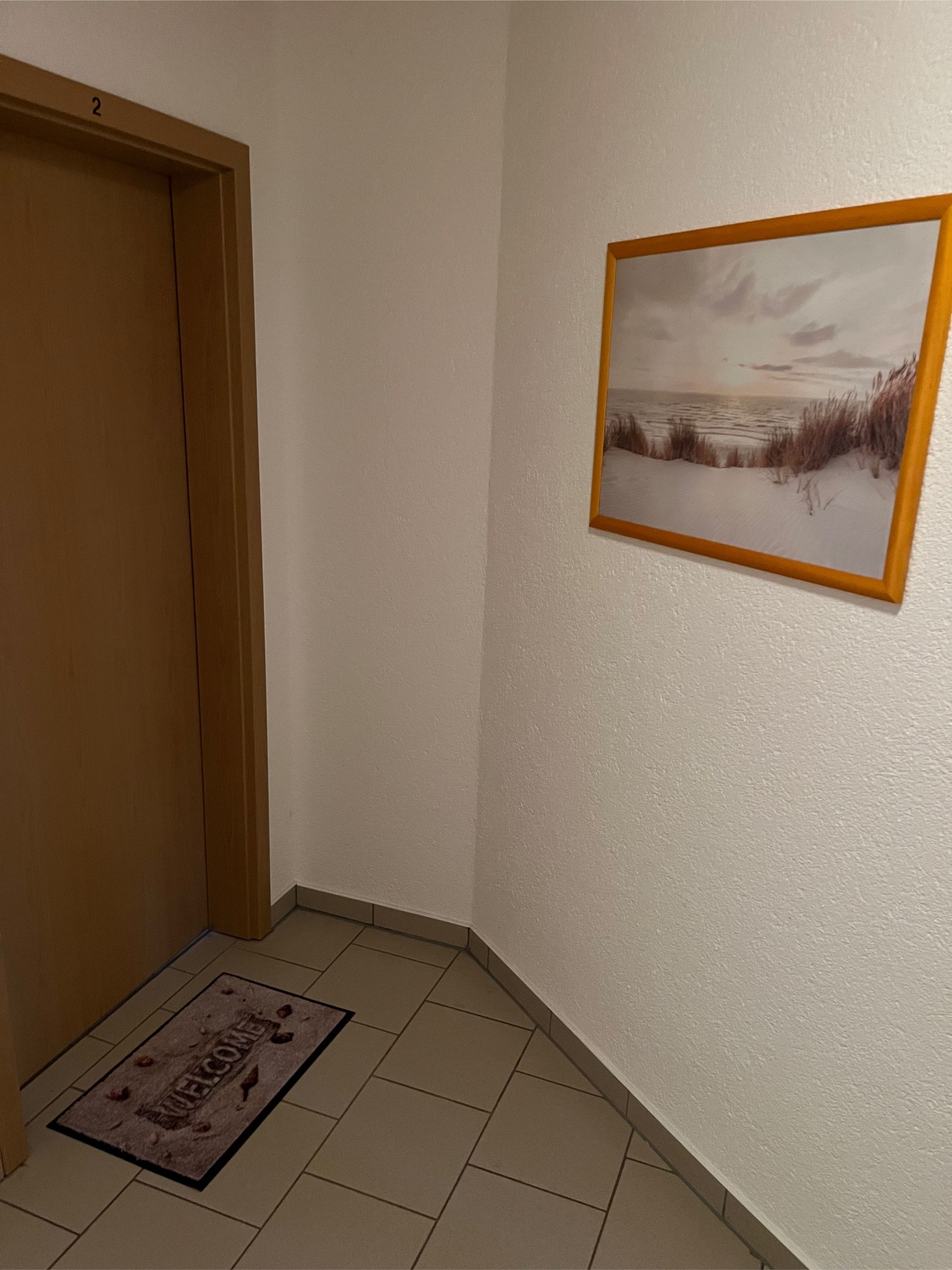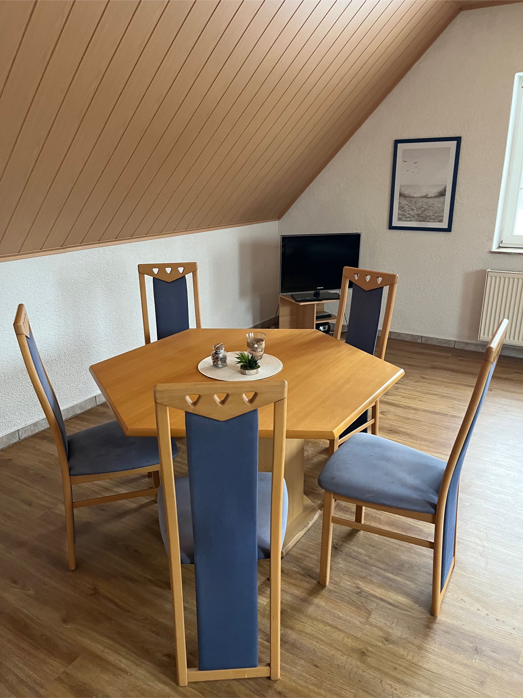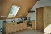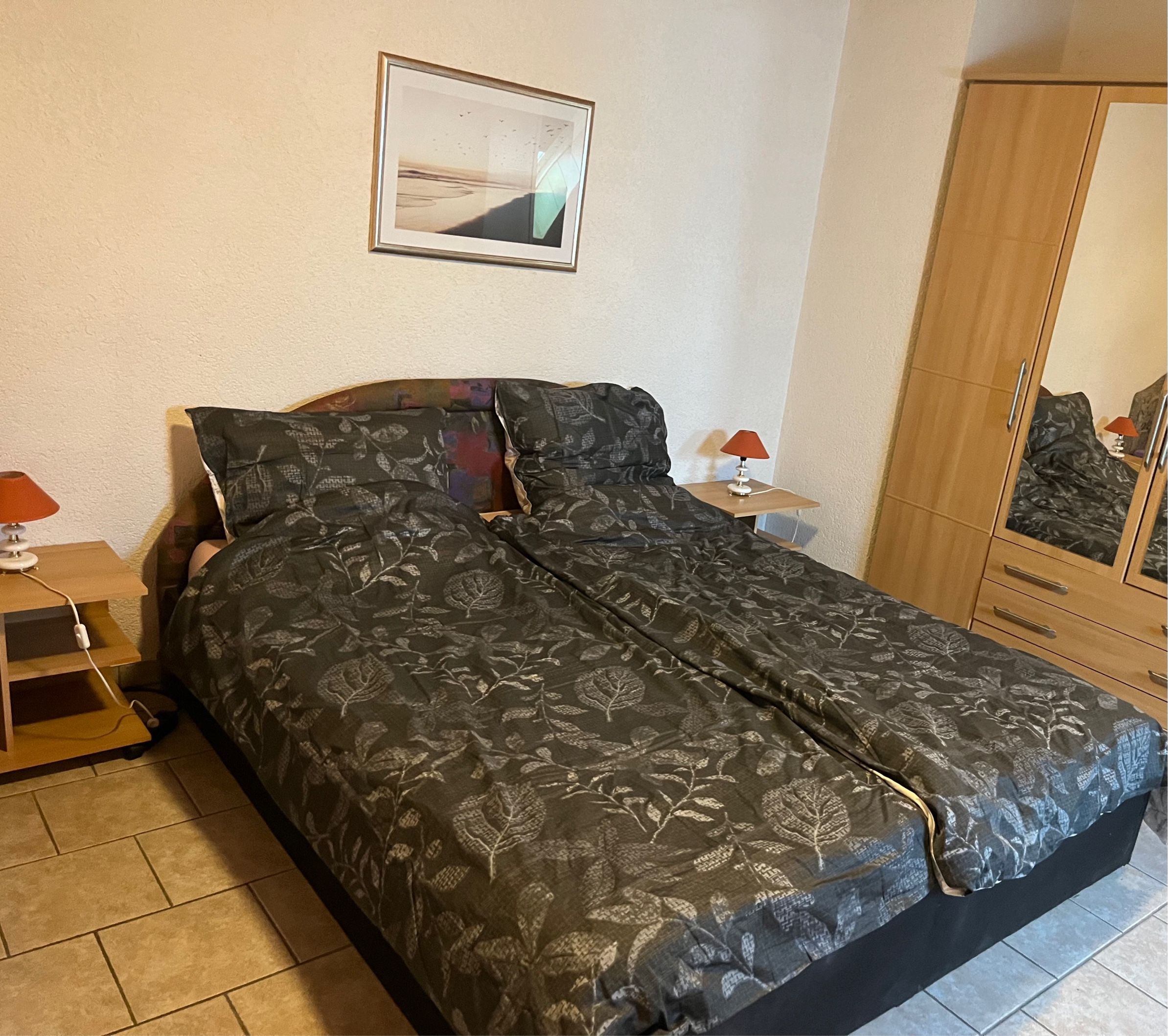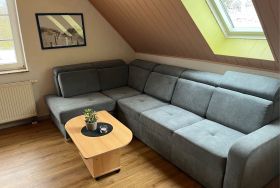 2-Zimmer Ferienwohnung bis 5 Personen. 70 qm groß. Wohnraum mit Schlafcouch (Leder). Schlafraum mit Doppelbett und Einzelbett. Küchenzeile, WC und Dusche.