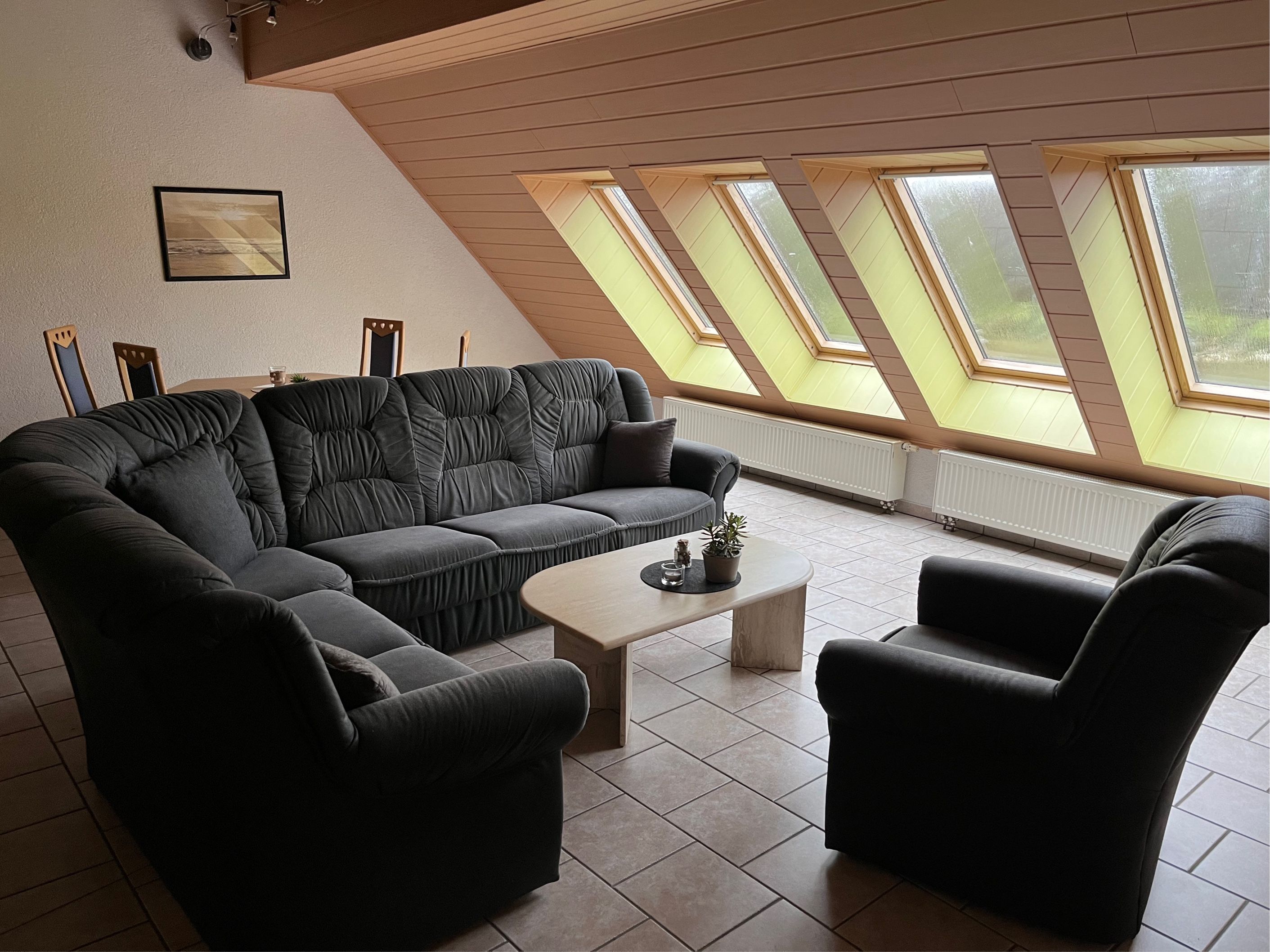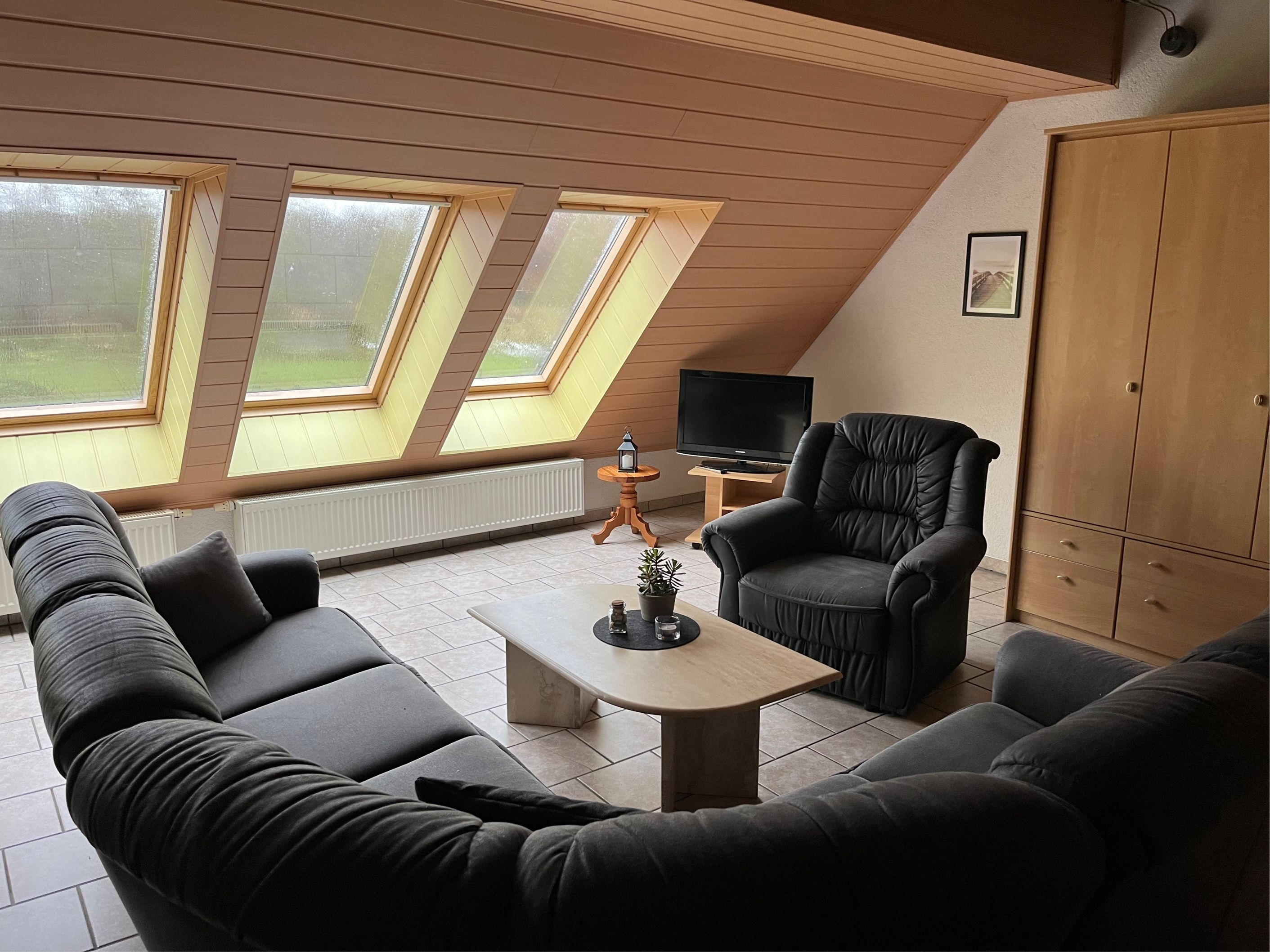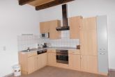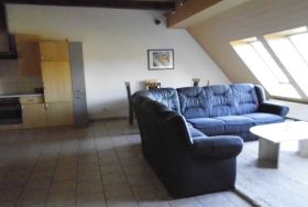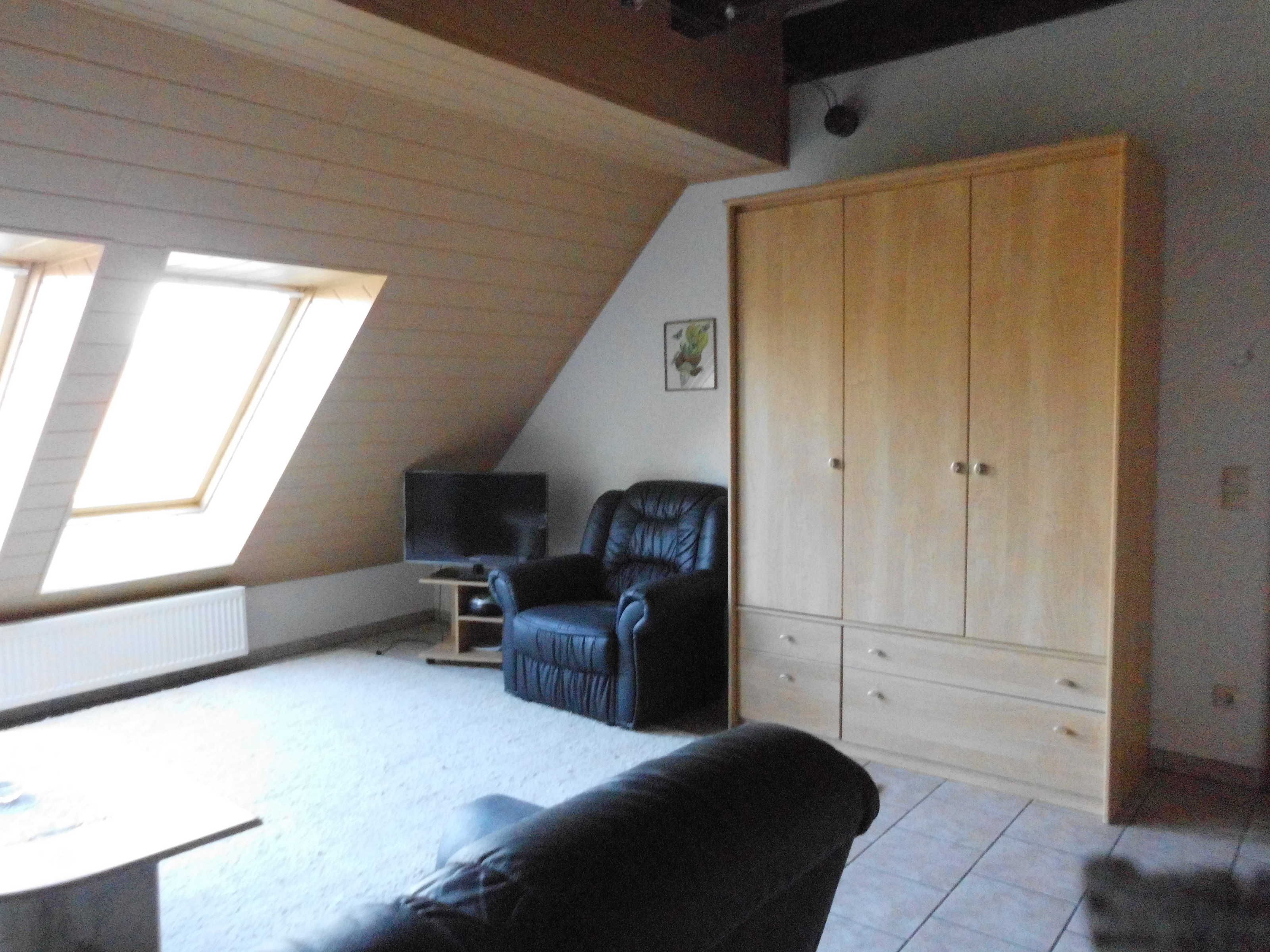 Maisonettenwohnung 70 qm groß. Wohnraum mit Schlafcouch (Leder), kleine Treppe für Empore mit Doppelbett, Küchenzeile, WC und Dusche.