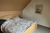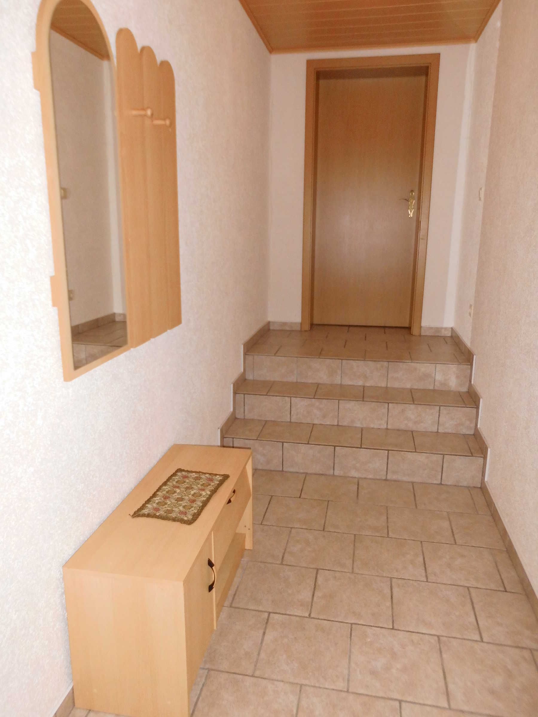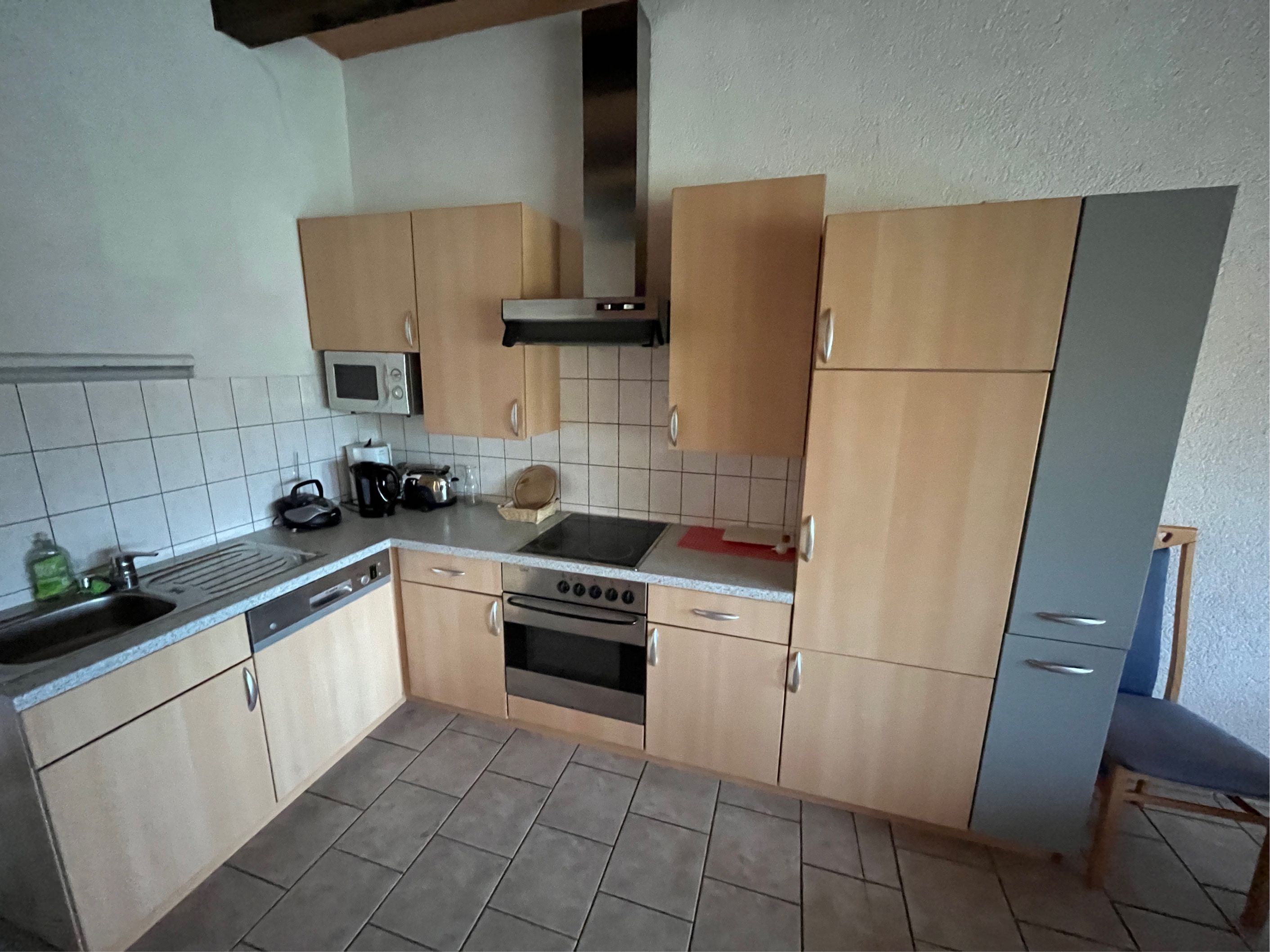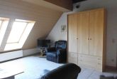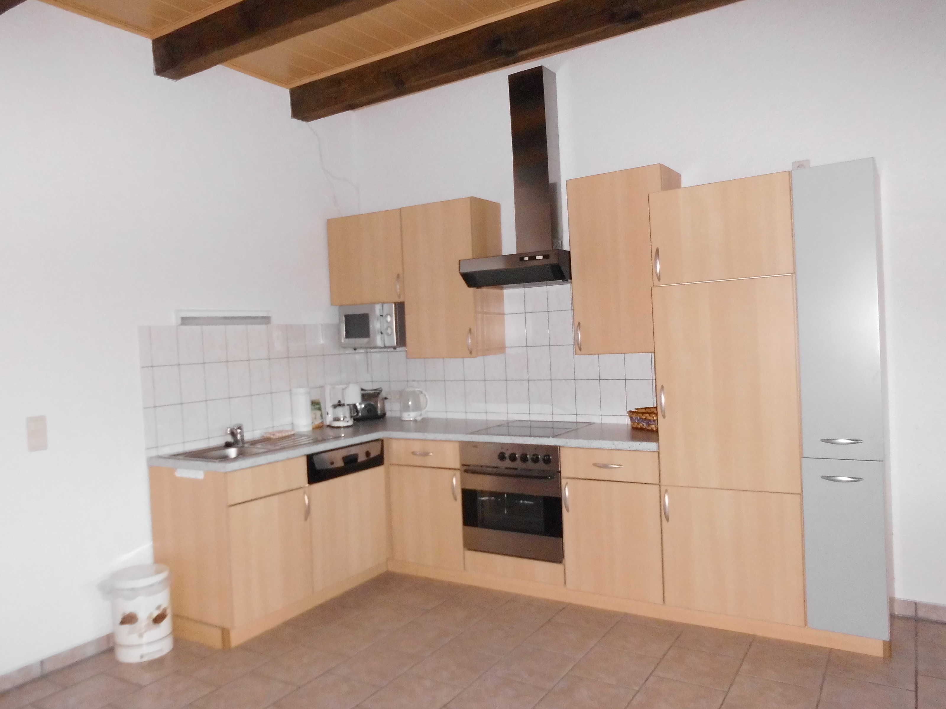 Maisonettenwohnung 70 qm groß. Wohnraum mit Schlafcouch (Leder), kleine Treppe für Empore mit Doppelbett, Küchenzeile, WC und Dusche.