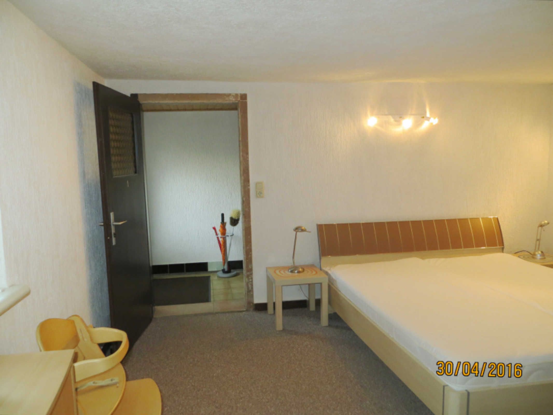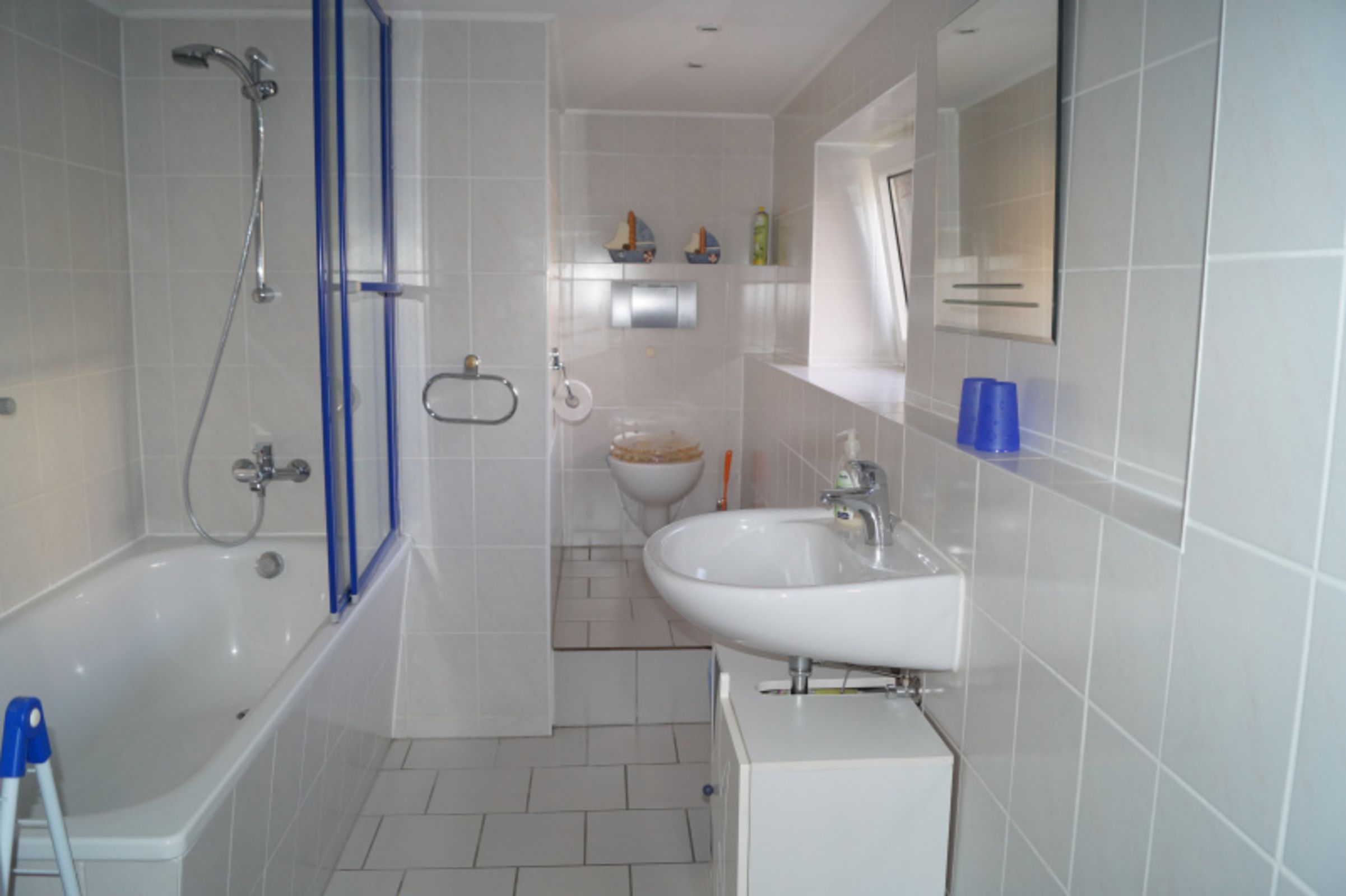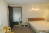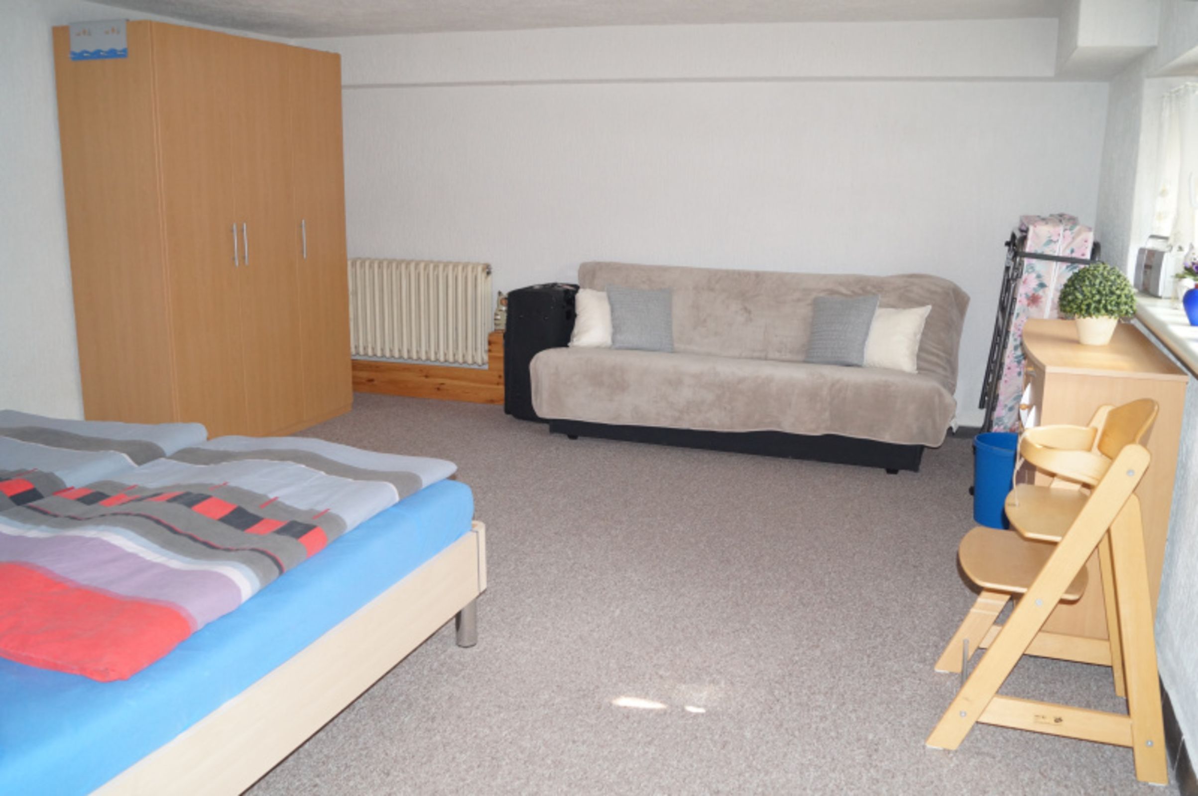 Das Bad mit Fenster ist gefliest und verfügt über ein Waschbecken, ein WC und eine Badewanne. Das Schlafzimmer ist ausgestattet mit einem Doppelbett, einem Sideboard, einer Schlafcouch (als Aufbettung nutzbar) und einem Kleiderschrank. Hier ist auch genügend Platz für die Aufstellung des Babyreisebettes.