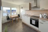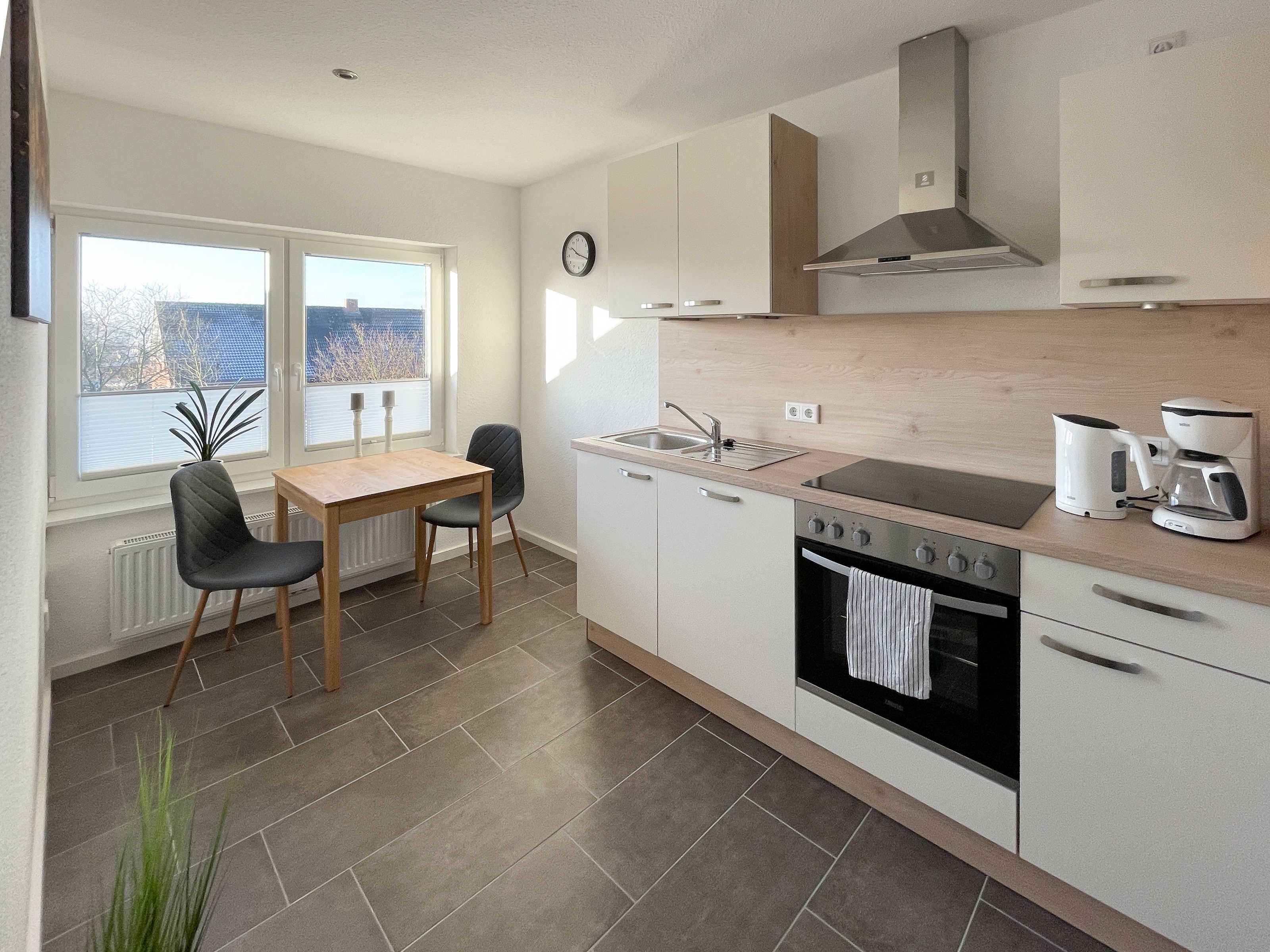 • Küche mit Spülmaschine, Backofen und kleinem Esstisch