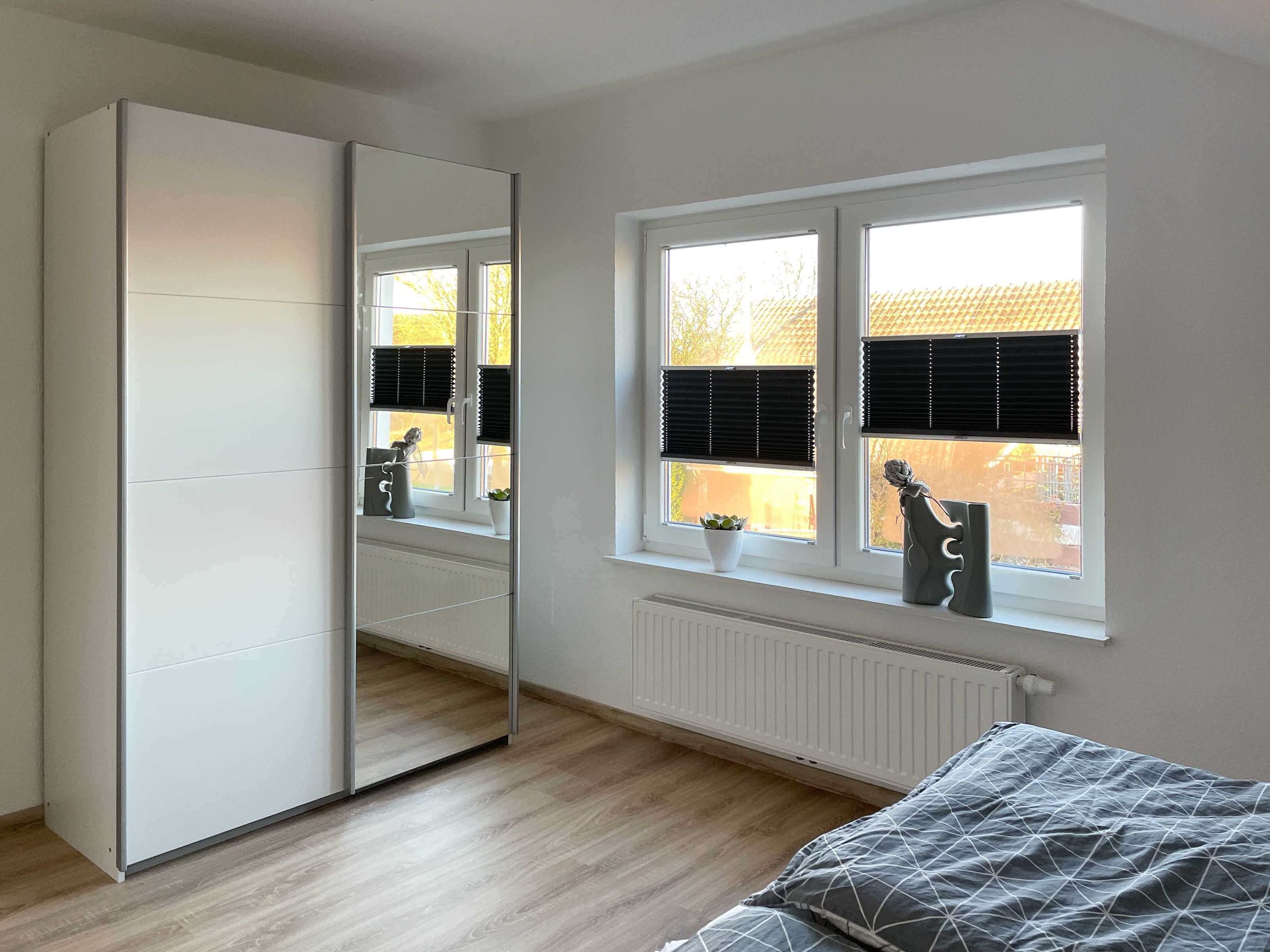 • Schlafzimmer mit Doppelbett und Kleiderschrank