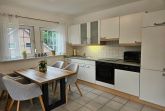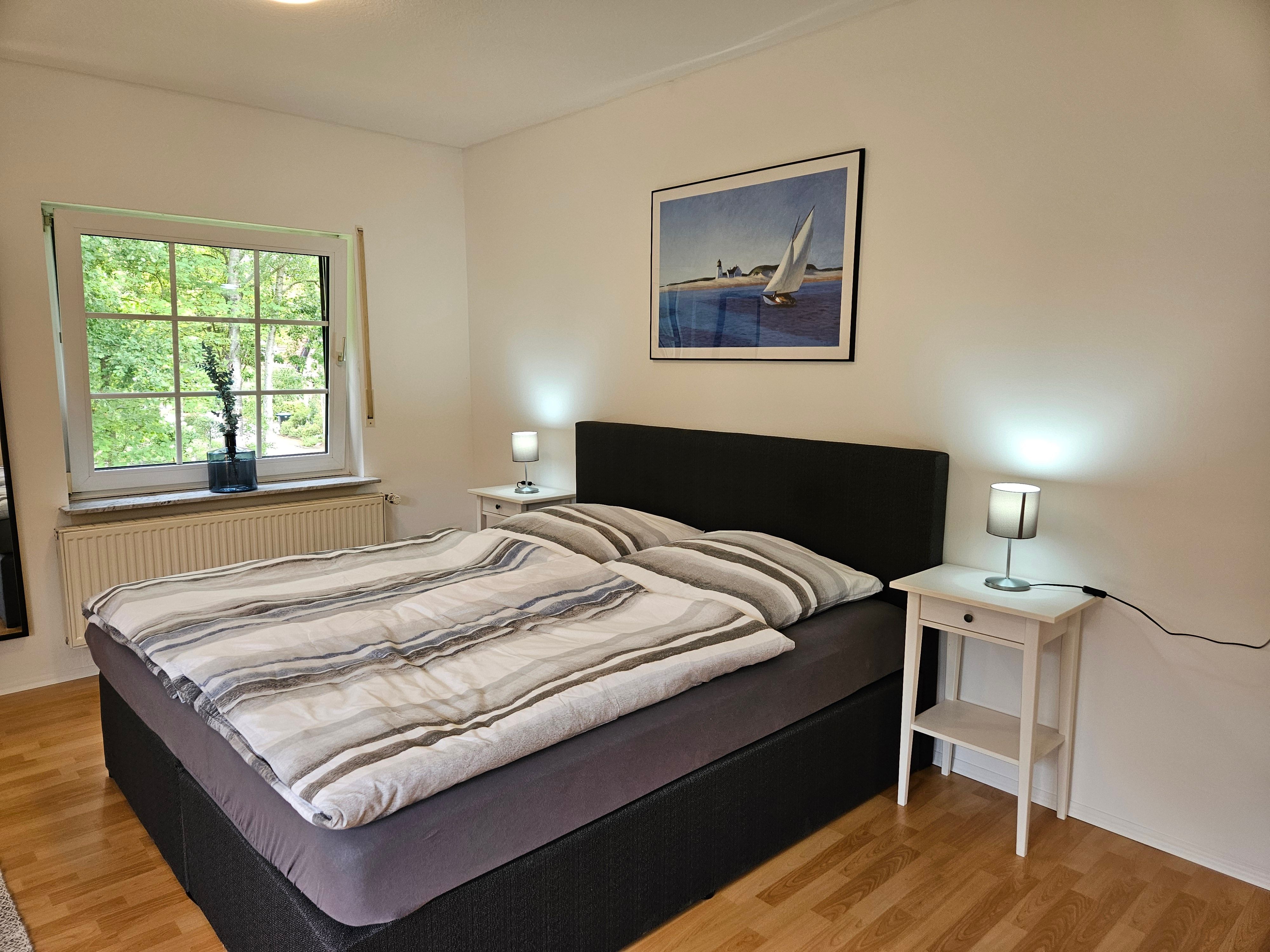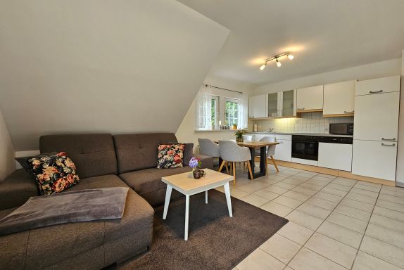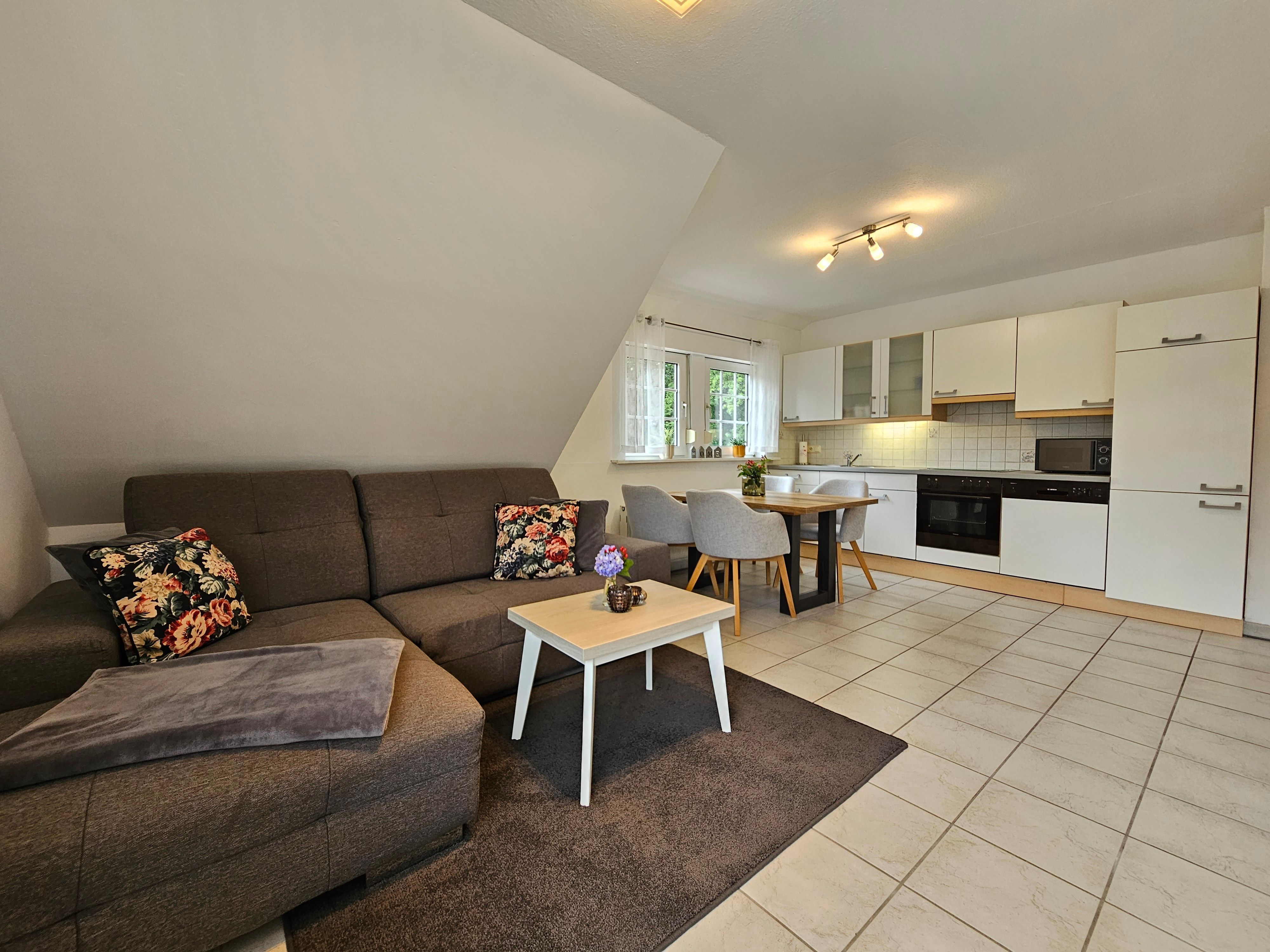 Die Wohnung verfügt über ein separates Schlafzimmer mit einem gemütlichen Doppelbett sowie einen großzügigen Wohn- und Schlafraum, der mit einem bequemen Schlafsofa ausgestattet ist perfekt als zusätzliche Schlafmöglichkeit. Der angrenzende offene Küchenbereich ist komplett ausgestattet und bietet alles, was man für einen entspannten Aufenthalt braucht: Backofen, Kühlschrank mit Gefrierfach, Mikrowelle, Spülmaschine, Kaffeemaschine, Wasserkocher und weiteres Kochzubehör.