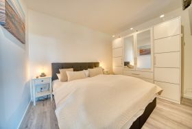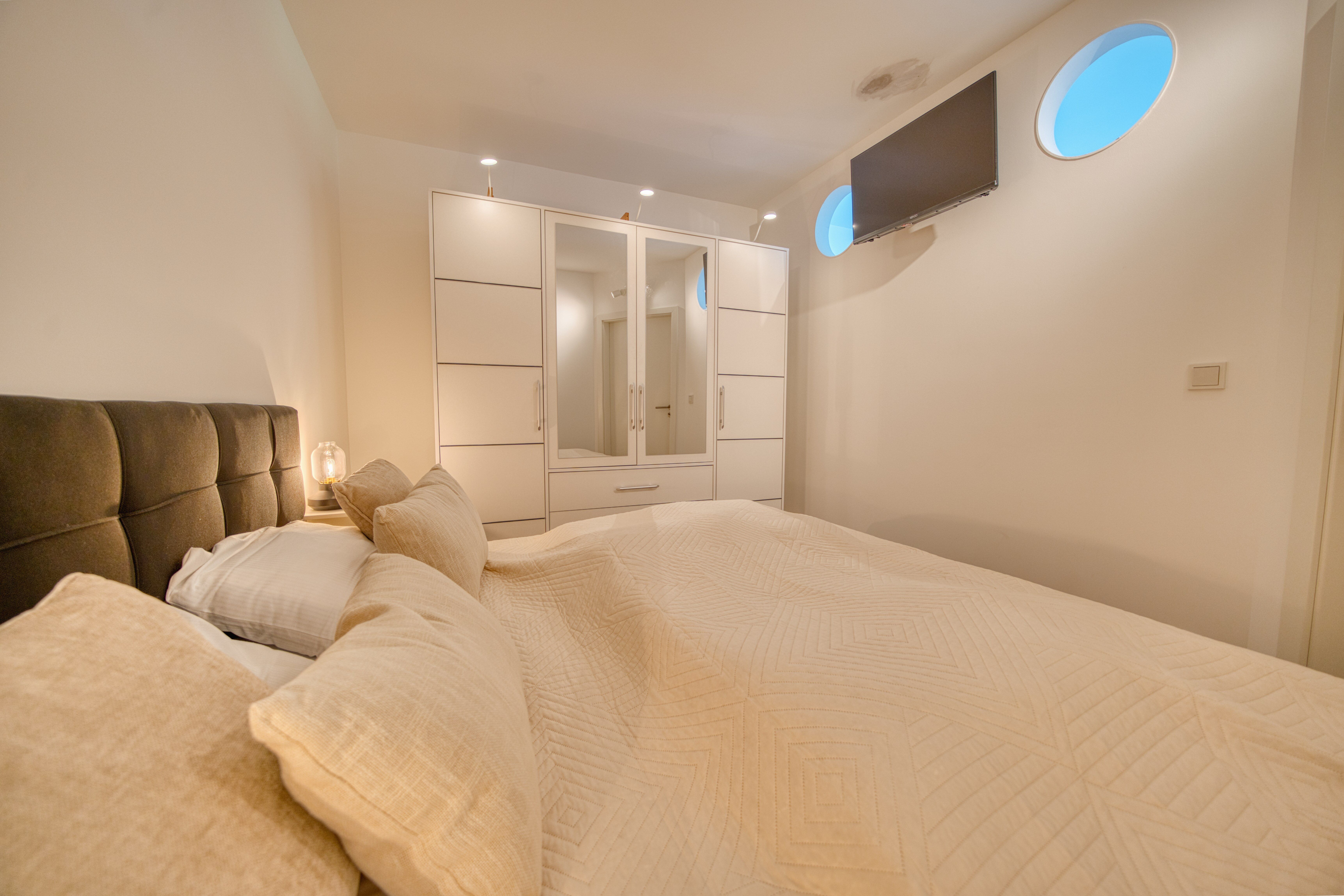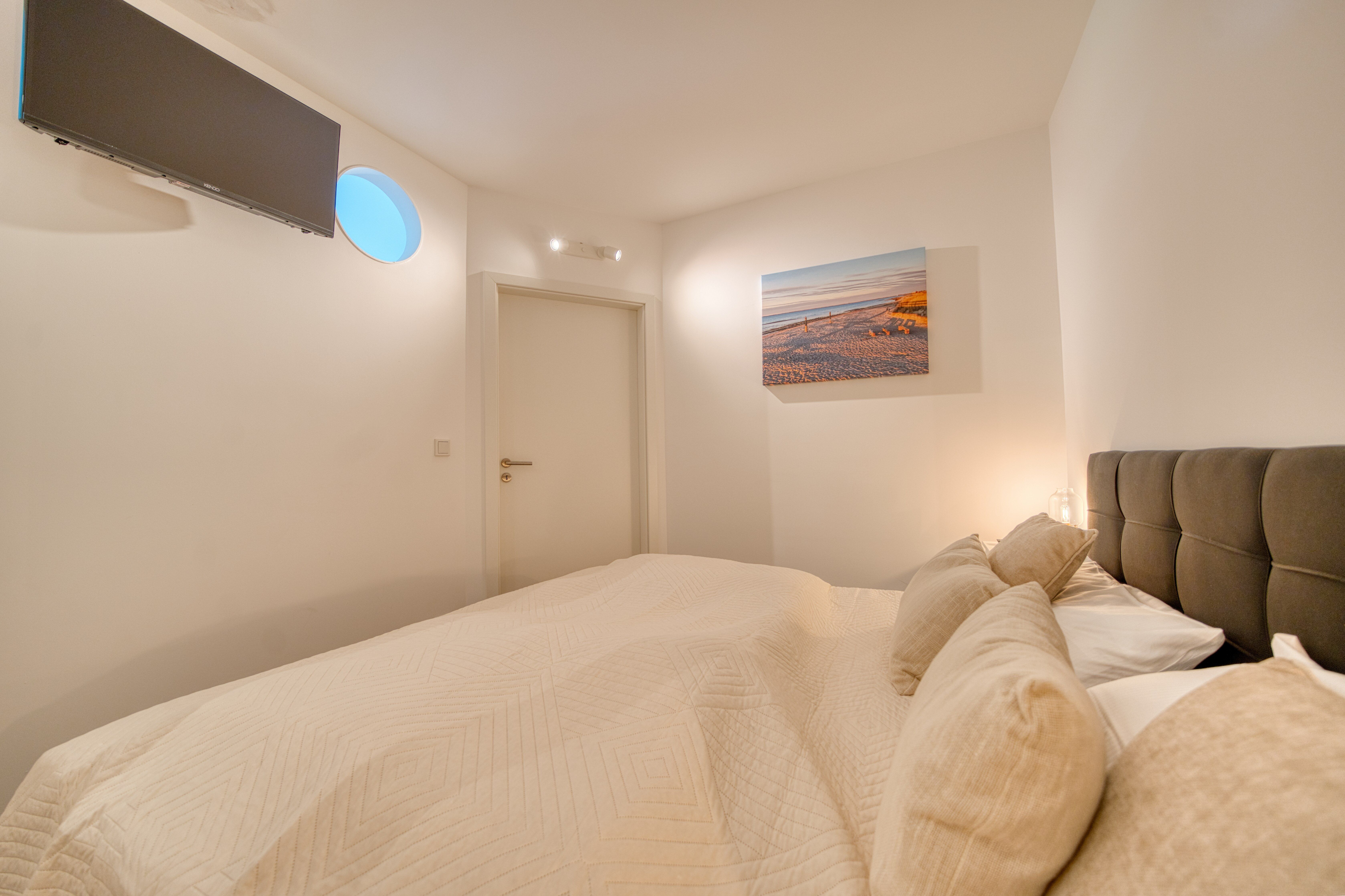 Der separate Elternschlafbereich bietet ein gemütliches Doppelbett und einen eigenen Fernseher für entspannte Abende.