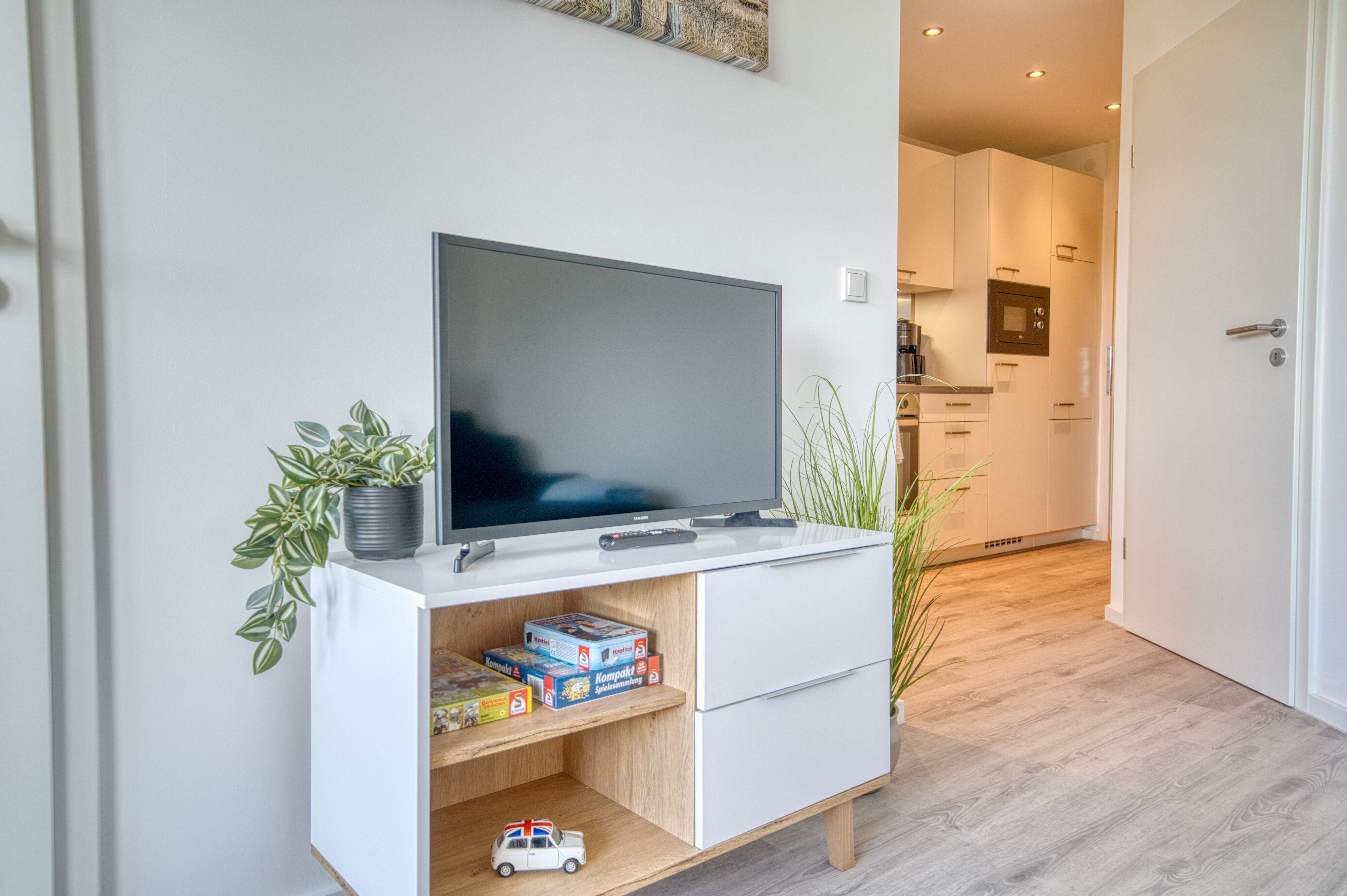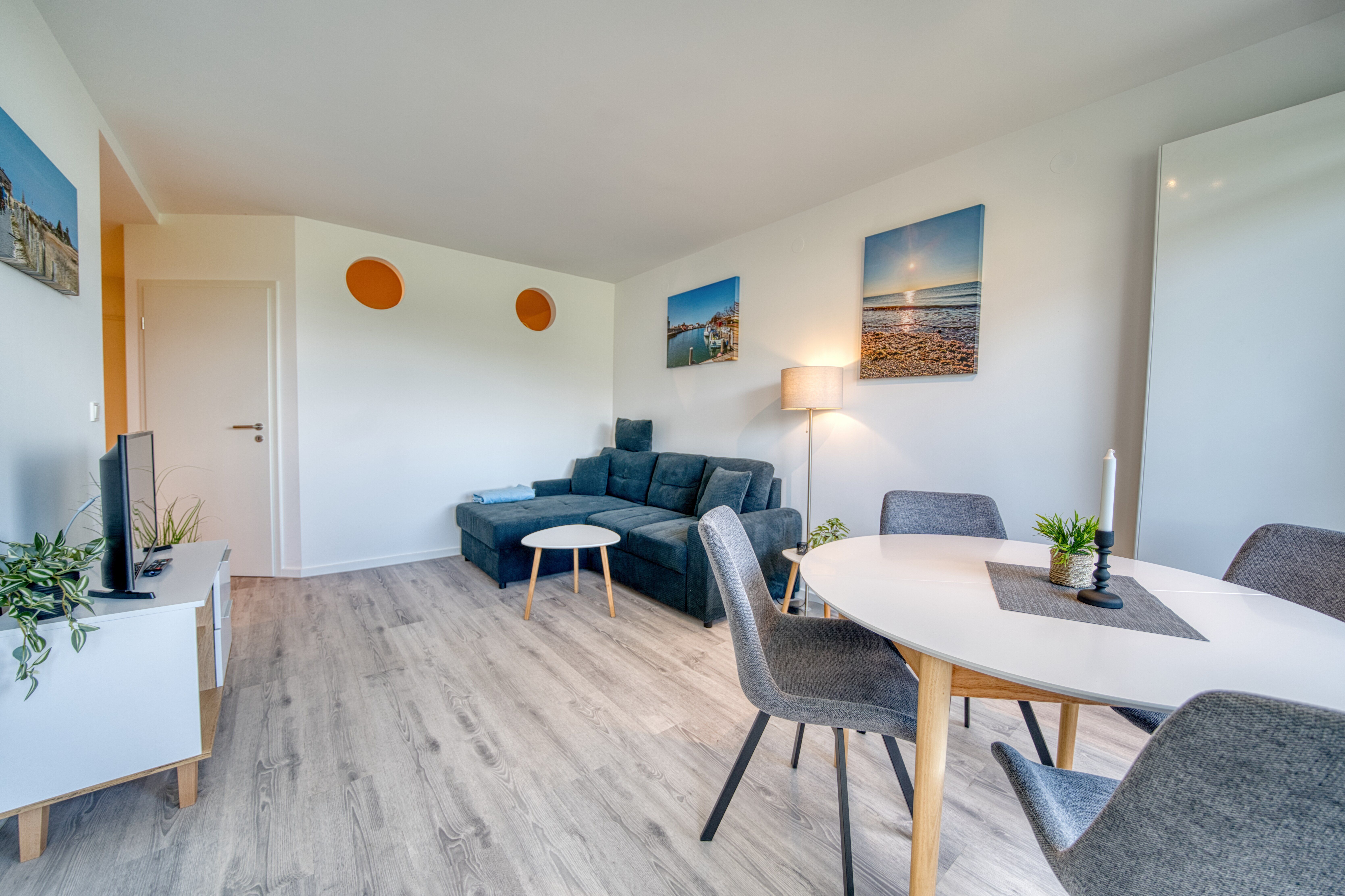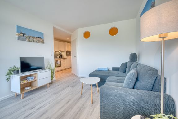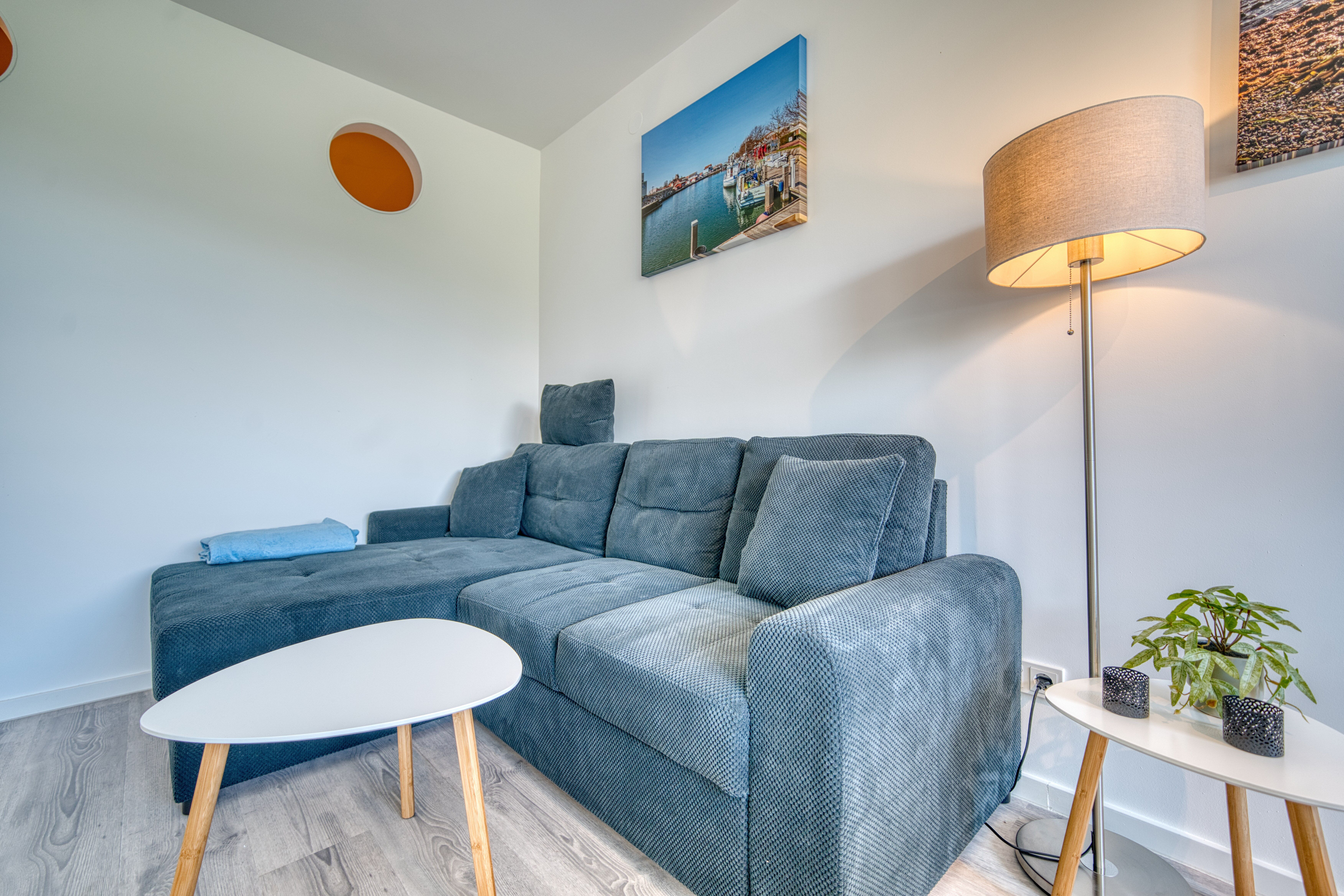 Im offenen Wohnbereich erwarten Sie eine bequeme Couch und ein Flachbildfernseher perfekt zum Abschalten.