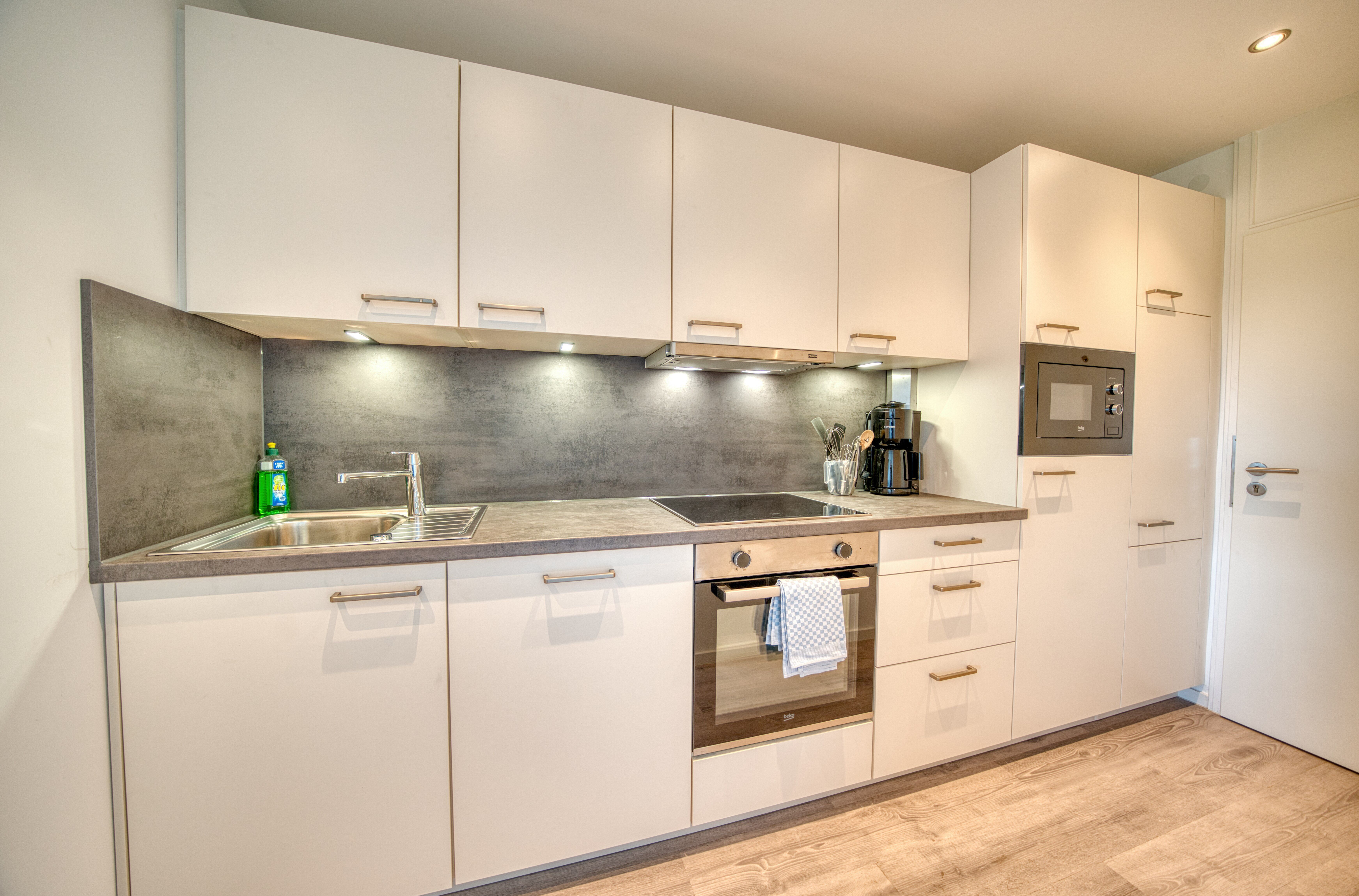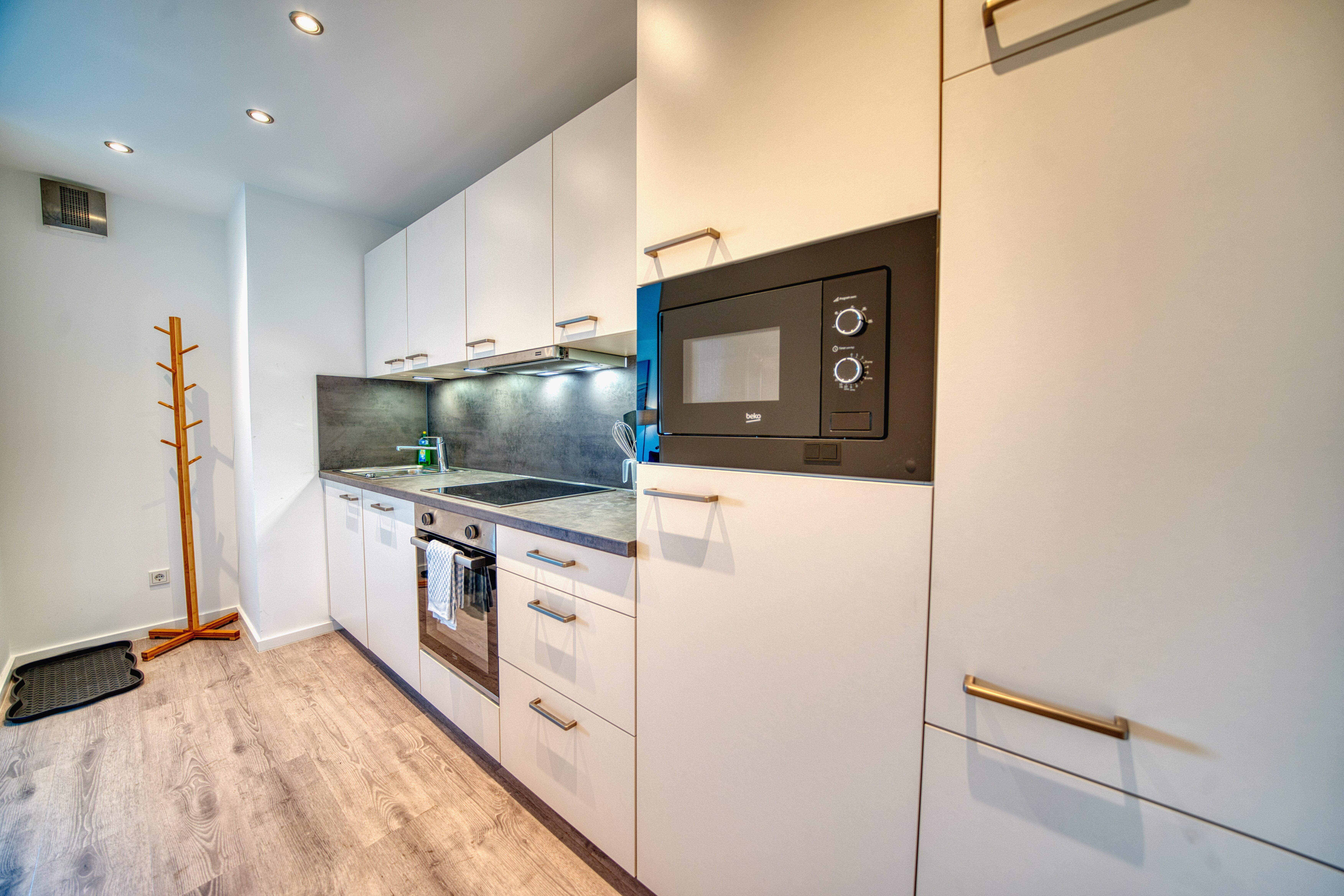 Eine voll ausgestattete Küche im Eingangsbereich mit Spülmaschine, Backofen, Mikrowelle, Ceranfeld, Kühlschrank mit Gefrierfach und Kaffeemaschine macht das Kochen zum Vergnügen.