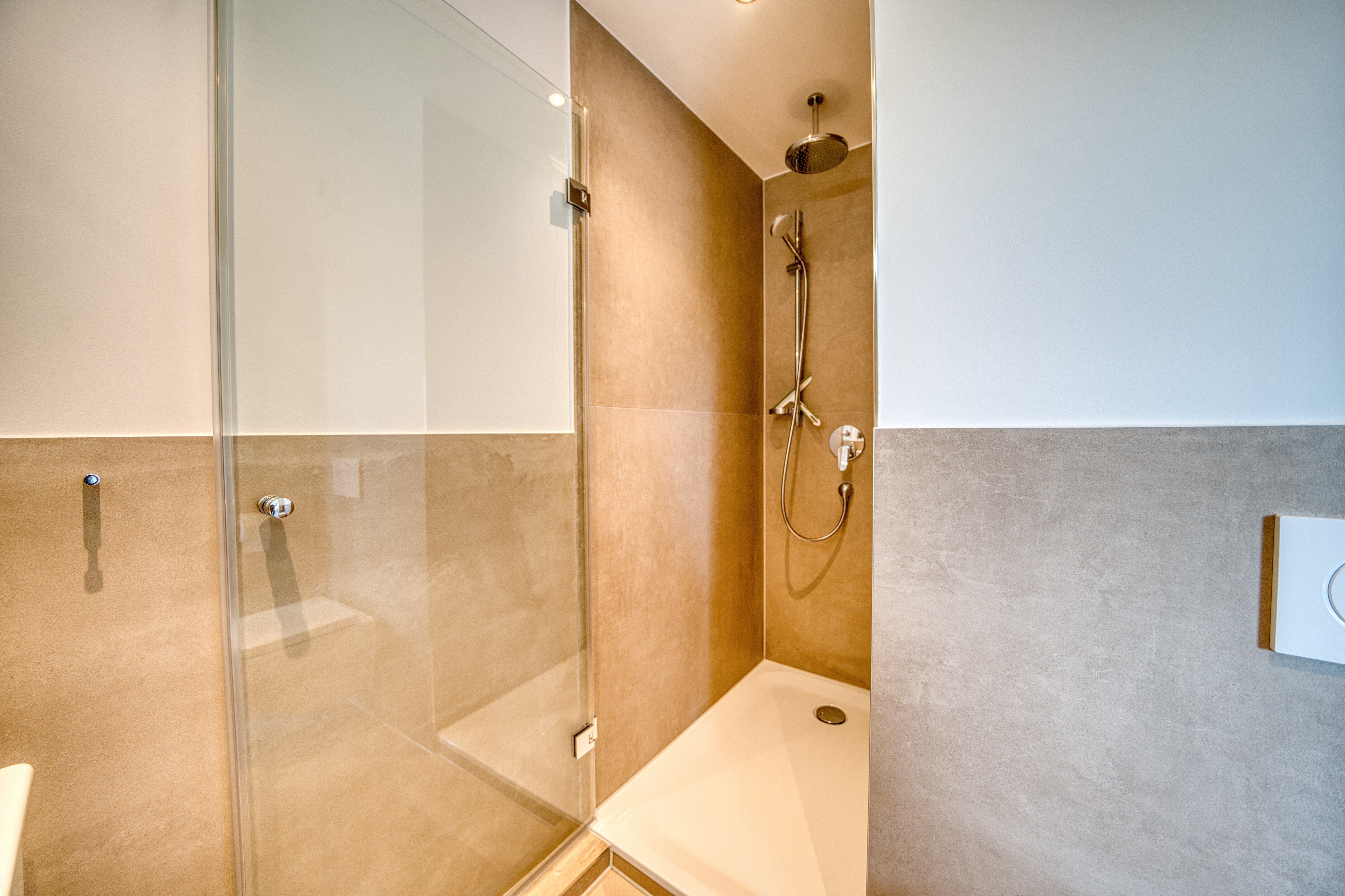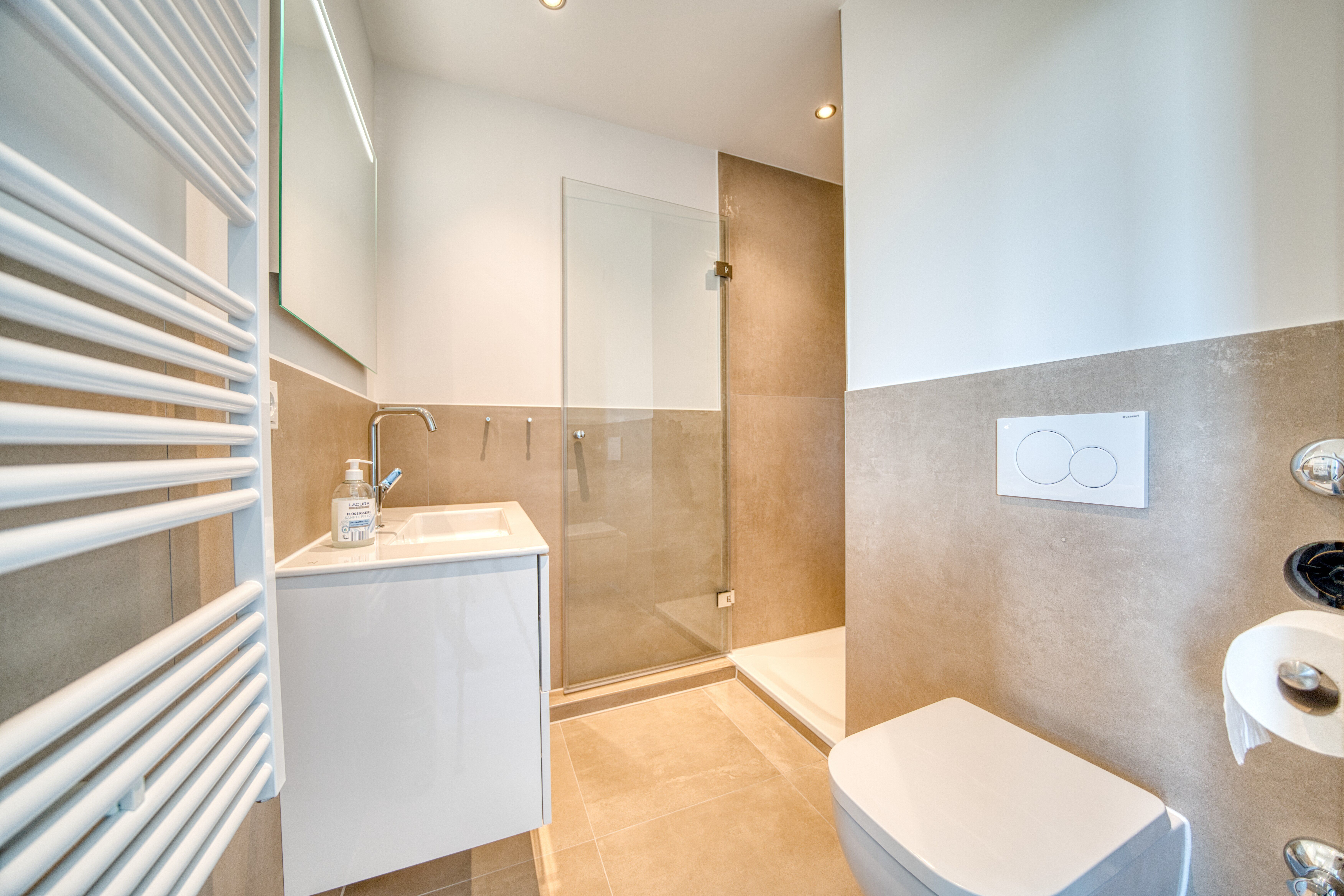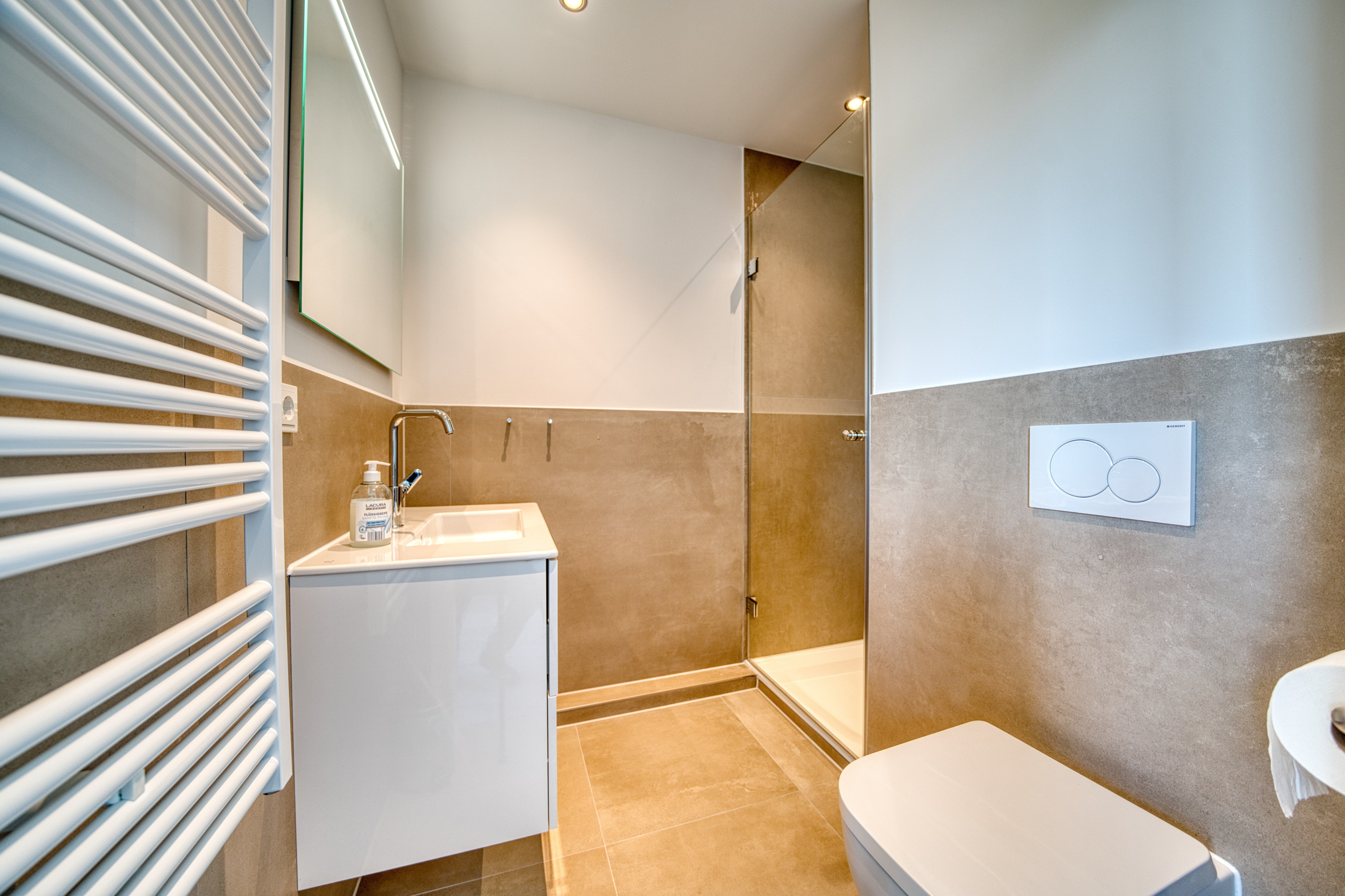Das Badezimmer punktet mit einer großzügigen Dusche, moderner Ausstattung und viel Helligkeit hier startet der Tag mit einem Lächeln.