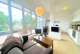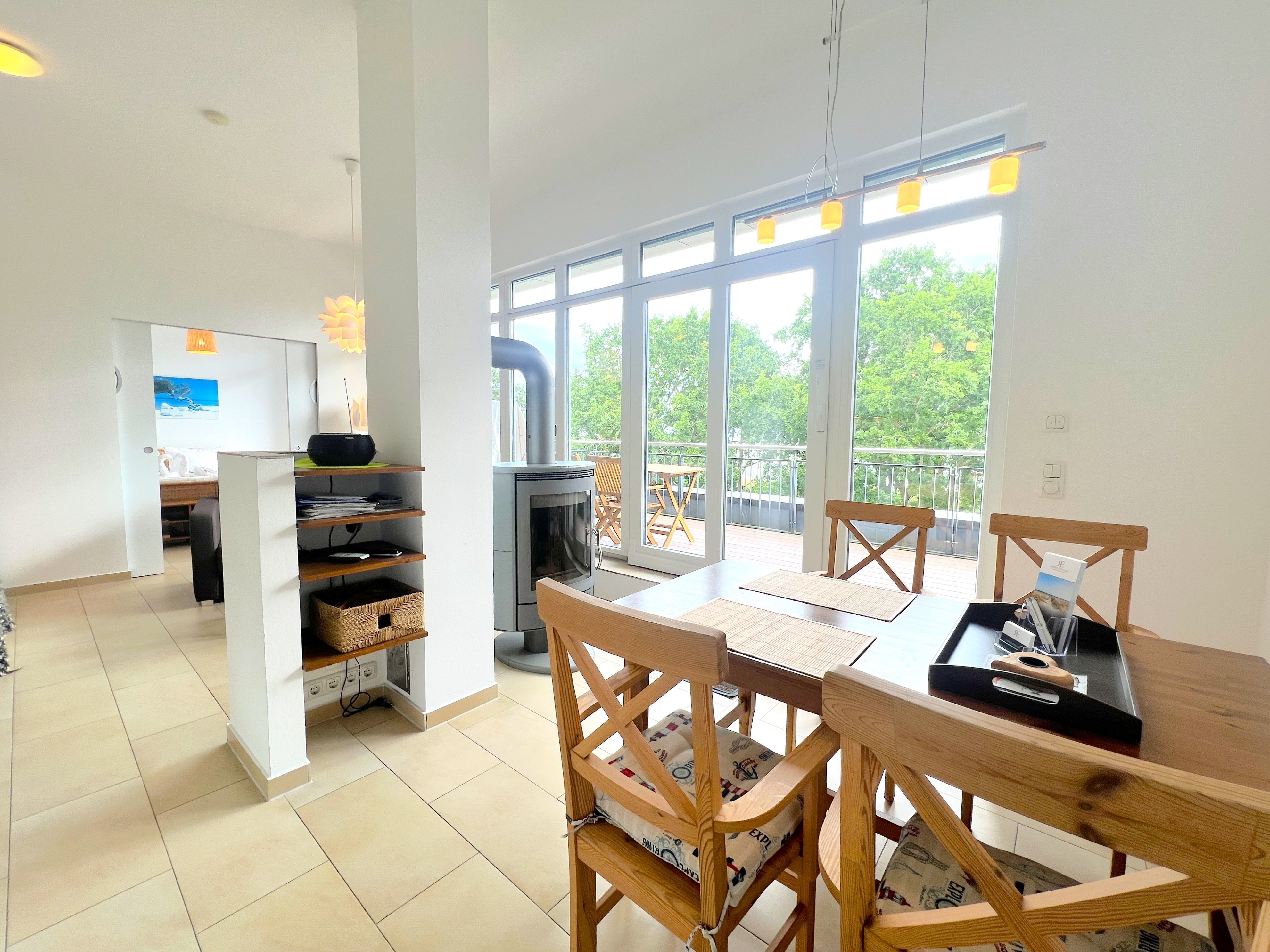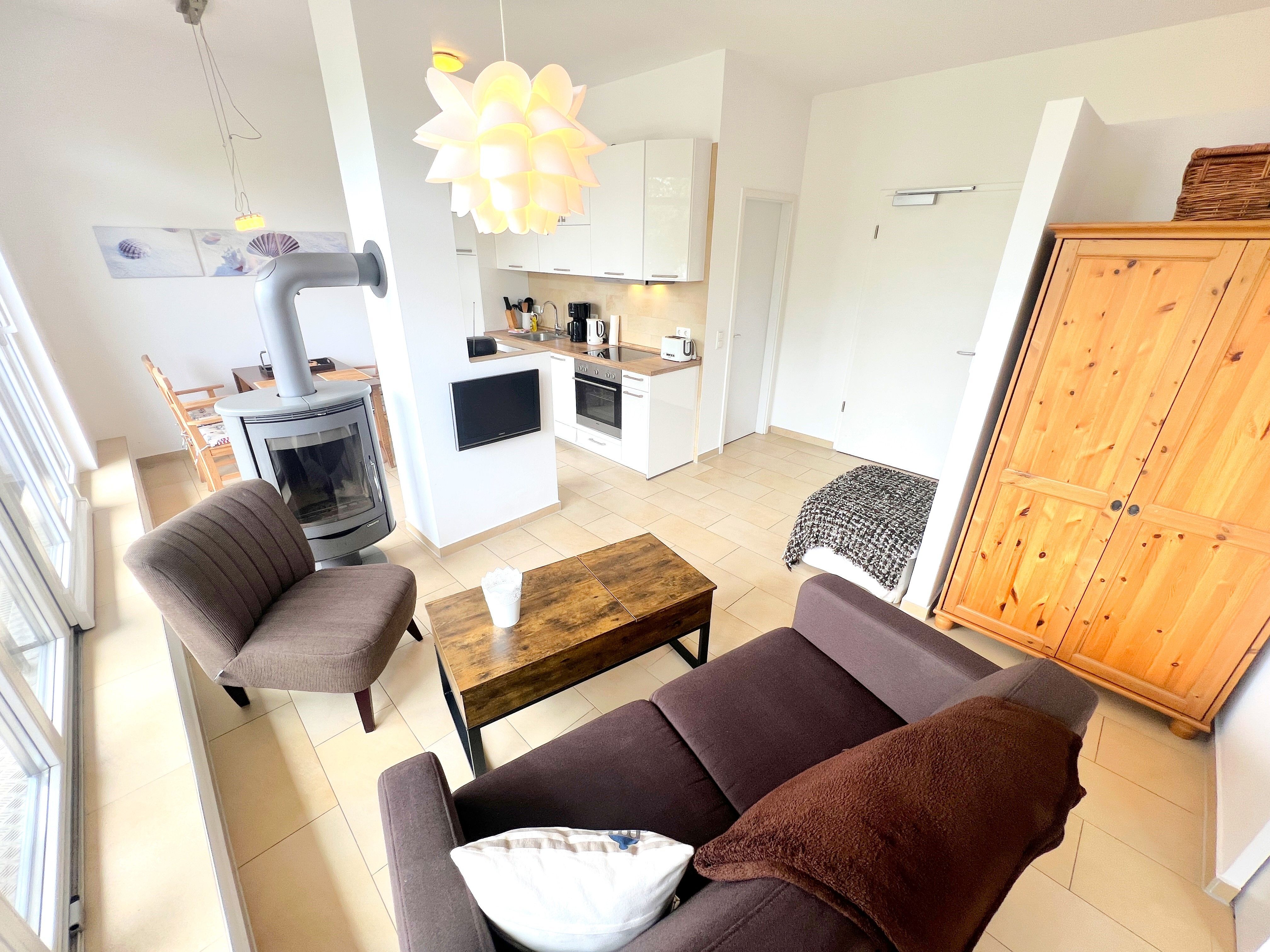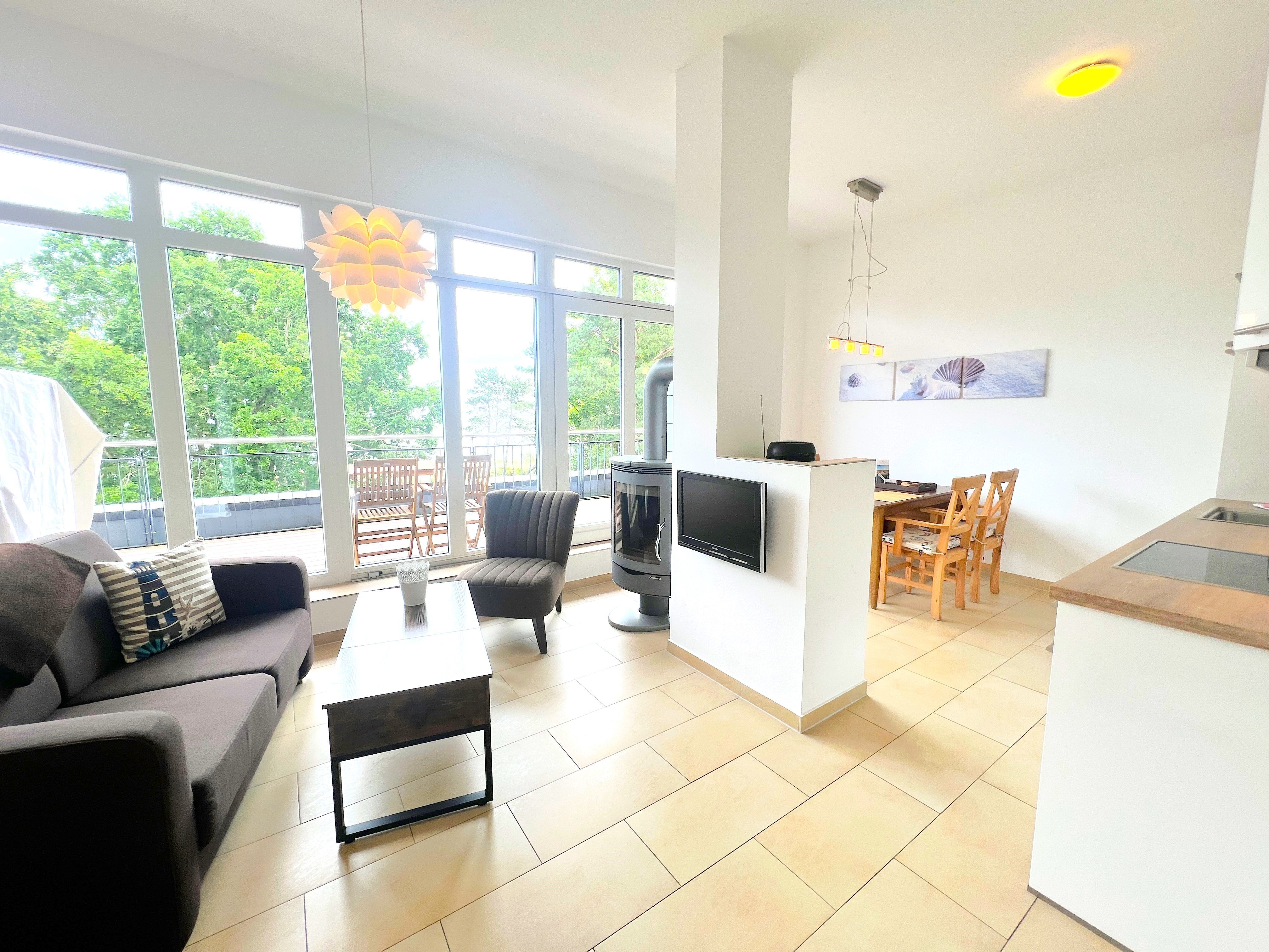 Das Herzstück der Wohnung ist der lichtdurchflutete Wohnbereich mit schwenkbarem Kaminofen, der sich flexibel zur Sitzecke oder zum Essplatz ausrichten lässt und so jederzeit für eine behagliche Atmosphäre sorgt. Von hier aus betreten Sie den außergewöhnlich großen Balkon, der sich über die gesamte Breite der Wohnung erstreckt. Hier erwartet Sie nicht nur ein traumhafter Meerblick, sondern auch ein eigener Strandkorb perfekt für entspannte Stunden mit Meeresrauschen.