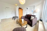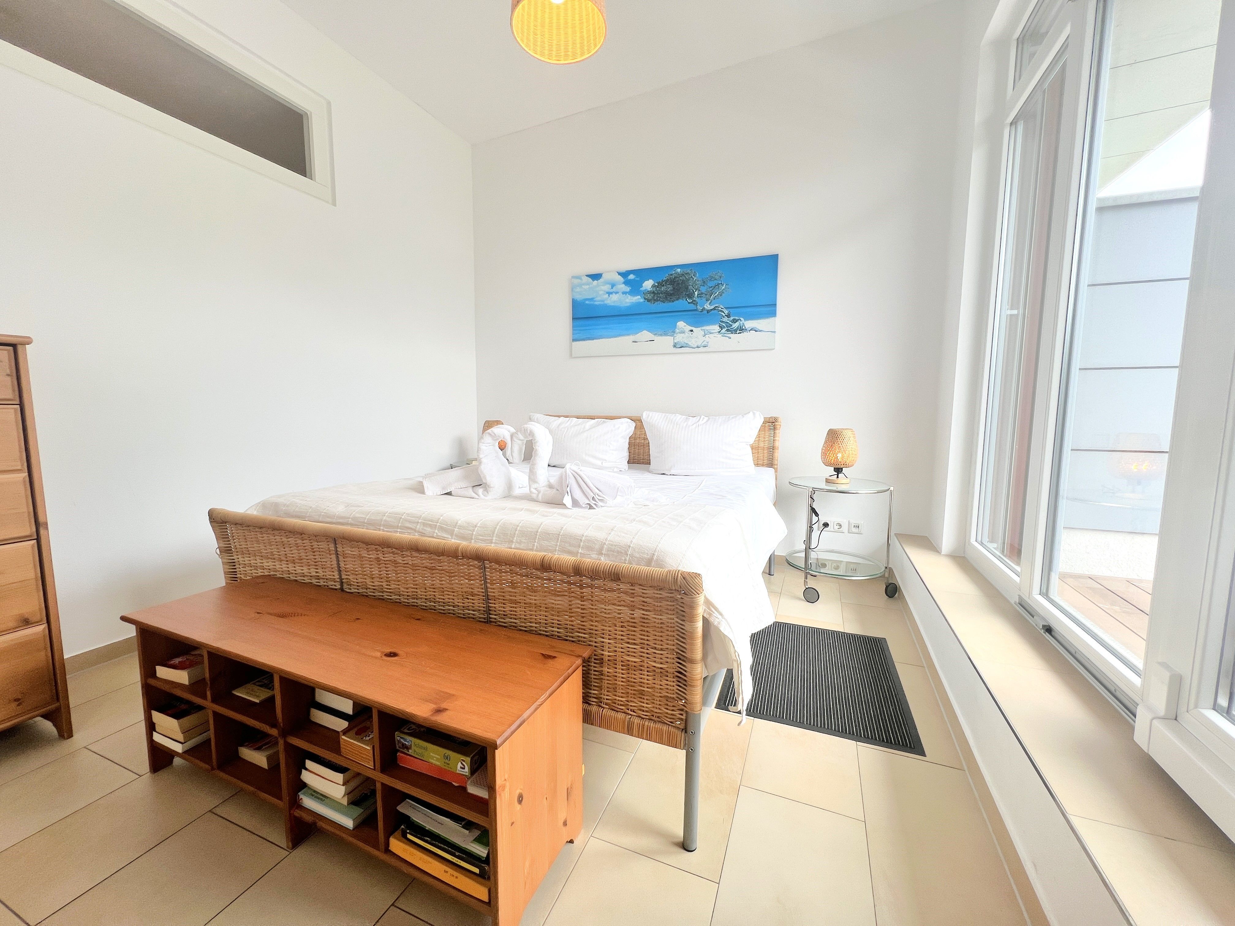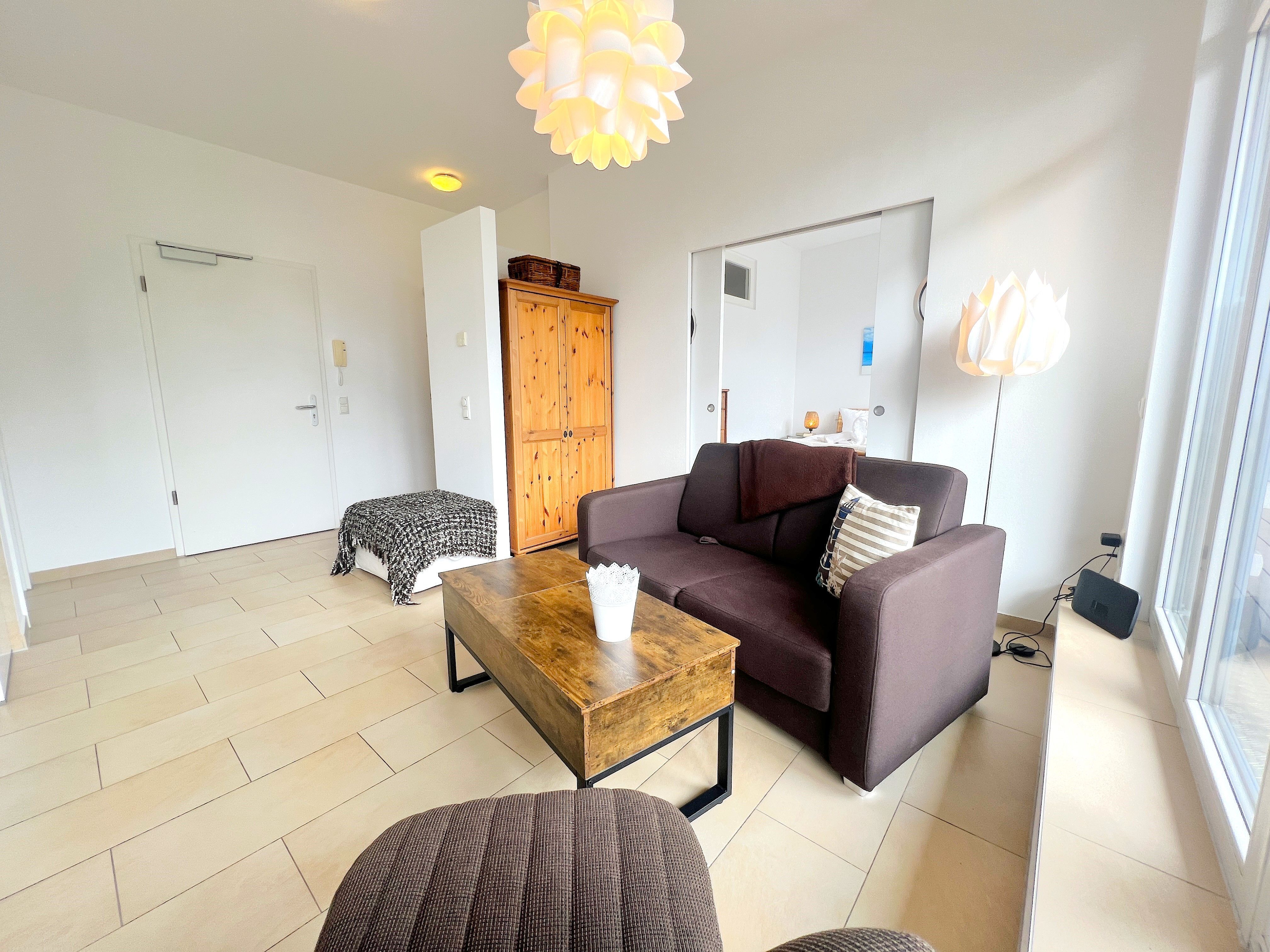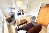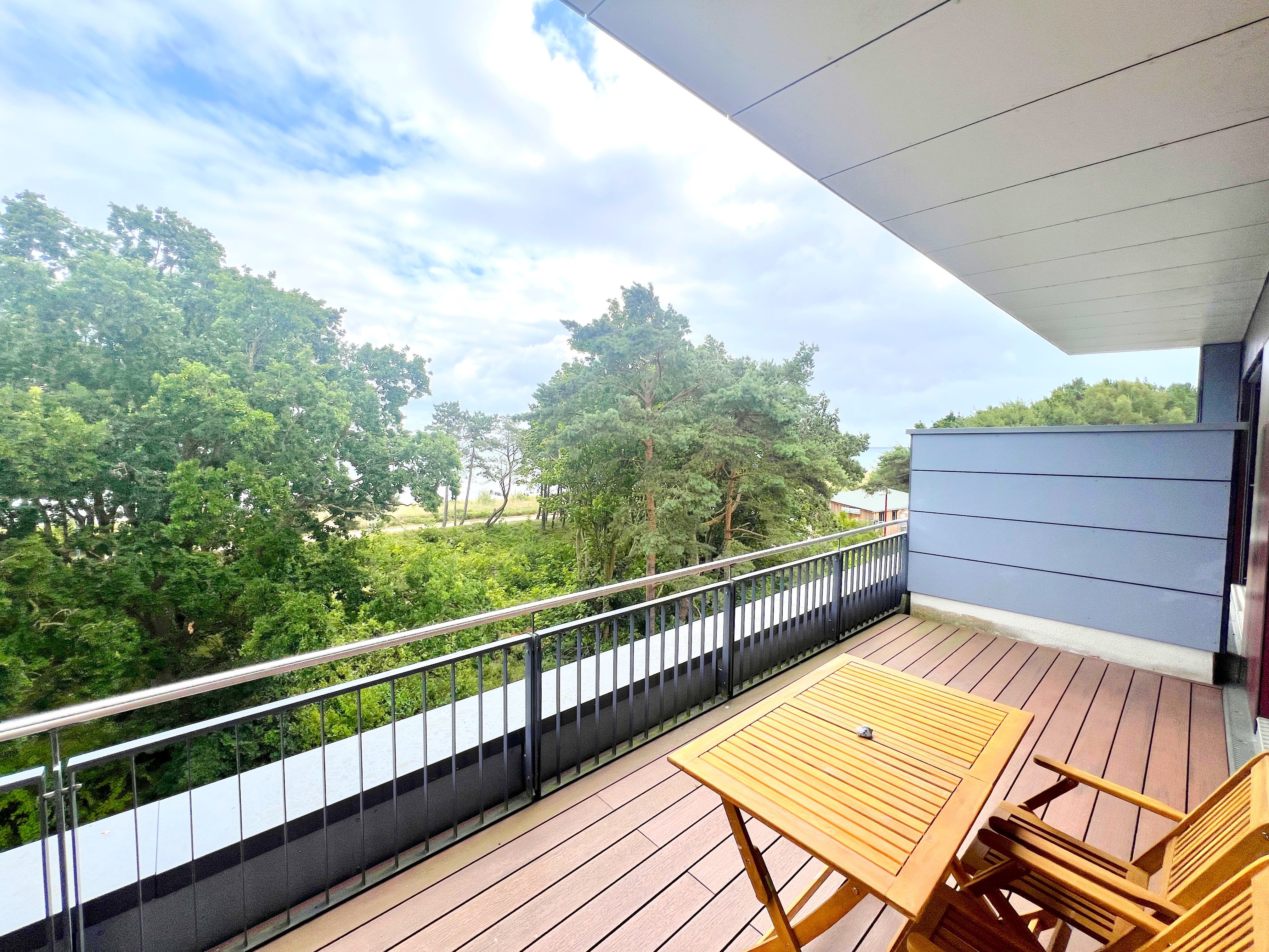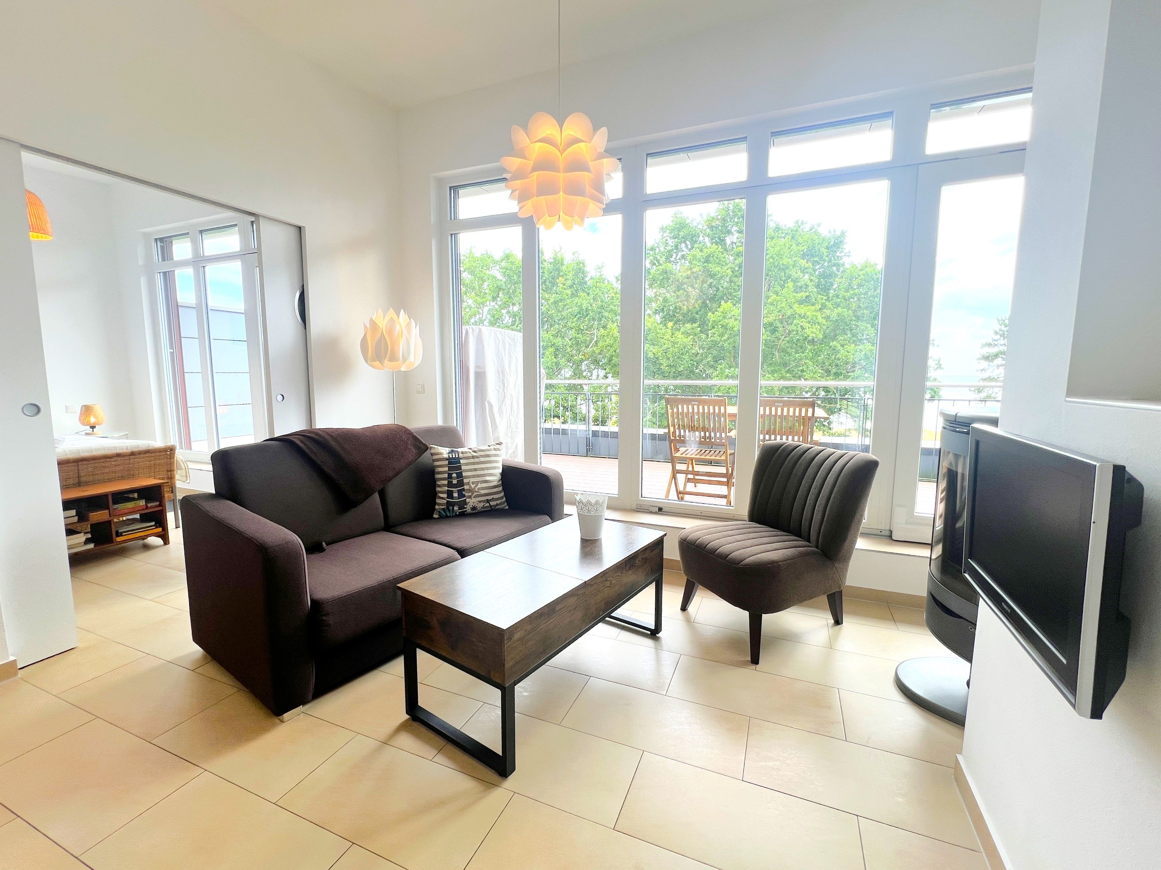 Das Herzstück der Wohnung ist der lichtdurchflutete Wohnbereich mit schwenkbarem Kaminofen, der sich flexibel zur Sitzecke oder zum Essplatz ausrichten lässt und so jederzeit für eine behagliche Atmosphäre sorgt. Von hier aus betreten Sie den außergewöhnlich großen Balkon, der sich über die gesamte Breite der Wohnung erstreckt. Hier erwartet Sie nicht nur ein traumhafter Meerblick, sondern auch ein eigener Strandkorb perfekt für entspannte Stunden mit Meeresrauschen.
