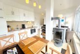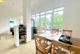 Die offene Küche ist voll ausgestattet: Ceranfeld, Backofen, Kühlschrank mit Gefrierfach, Geschirrspüler, Filterkaffeemaschine, Wasserkocher und Toaster lassen keine Wünsche offen. Der Essbereich grenzt direkt an die Küche und bietet Platz mit Ausblick.