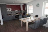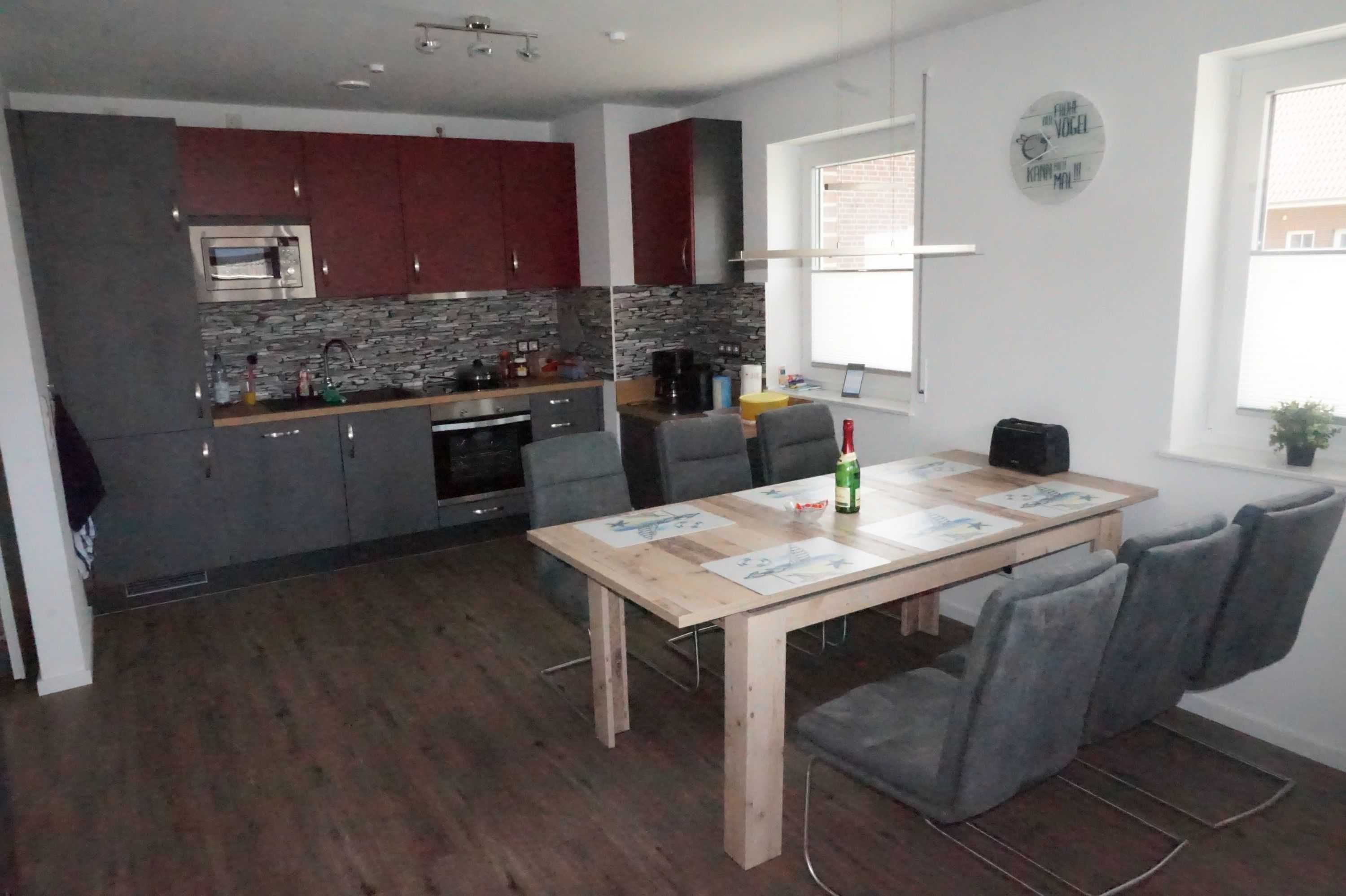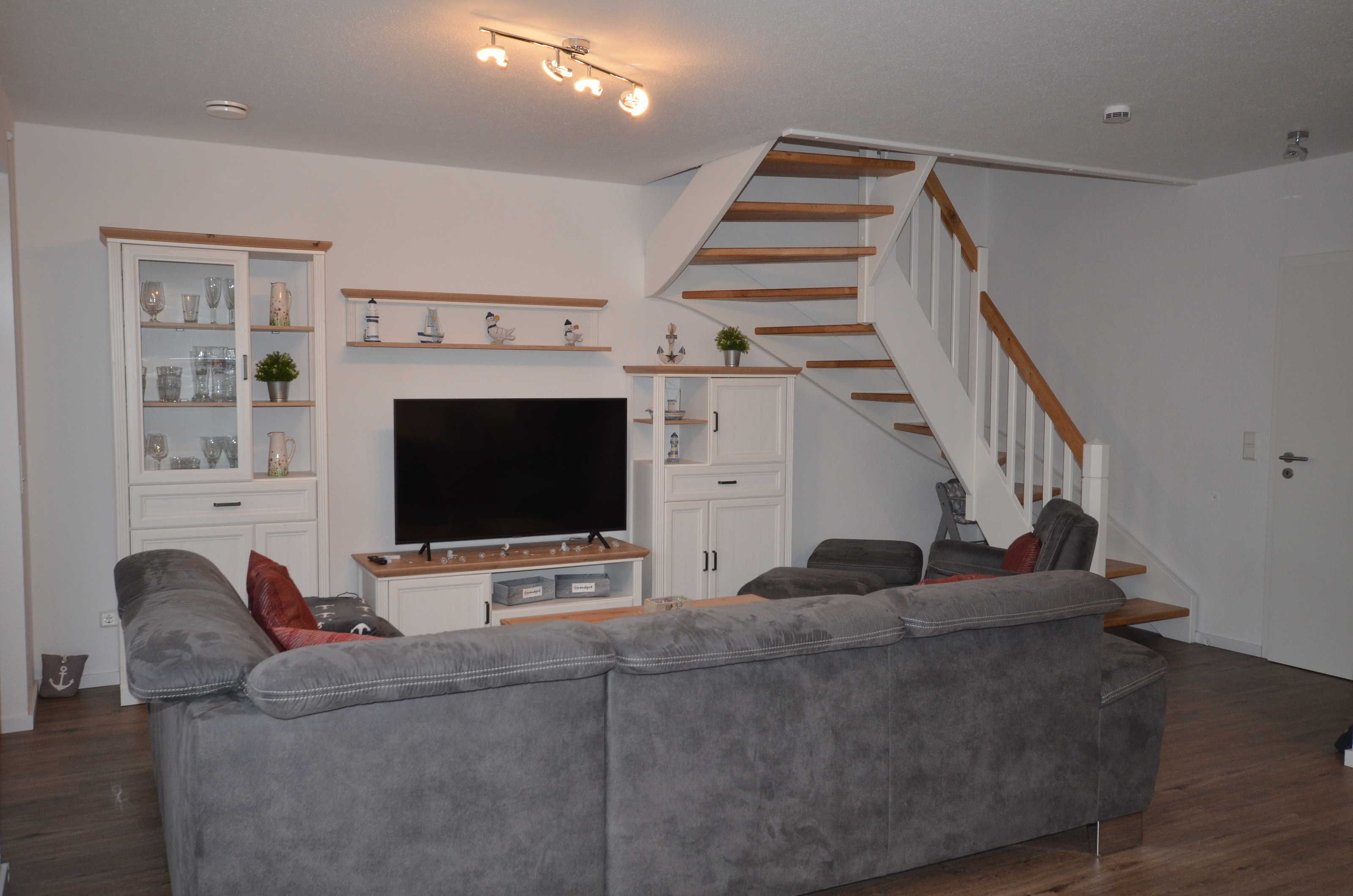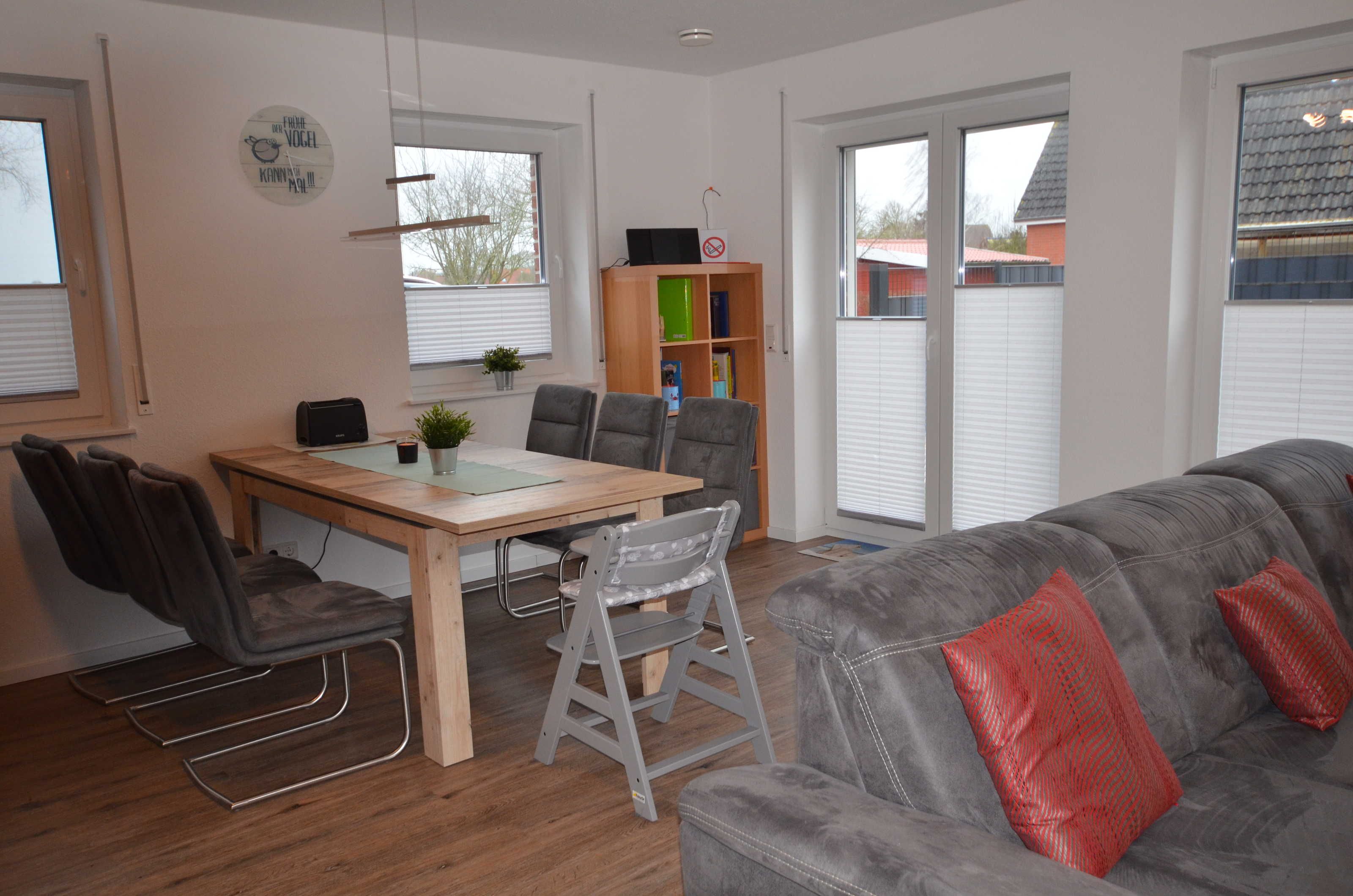 In der unteren Etage ist der großzügige Wohn- und Essbereich mit moderner offener Küchenzeile. Sowohl im Wohn- als auch im Essbereich ist ausreichend Platz für alle Gäste. Auch in diesem Raum befindet sich ein großer Flachbildfernseher. Eine Auswahl an Gesellschaftsspielen und Büchern stehen Ihnen genauso zur Verfügung wie kostenloses WLAN. Außerdem befindet sich in dieser Etage ein geräumiger Abstellraum. Die große, sonnige Terrasse mit bequemen Gartenmöbeln lädt zum Verweilen und Sonnen ein. Da die Terrasse komplett umzäunt ist, können Sie auch Ihre kleinen Kinder gefahrlos auf dem Rasen der Terrasse spielen lassen und müssen Sie nicht jede Sekunde im Auge haben. In unserem Fahrradschuppen steht Ihnen auch ein Bollerwagen zur Verfügung.