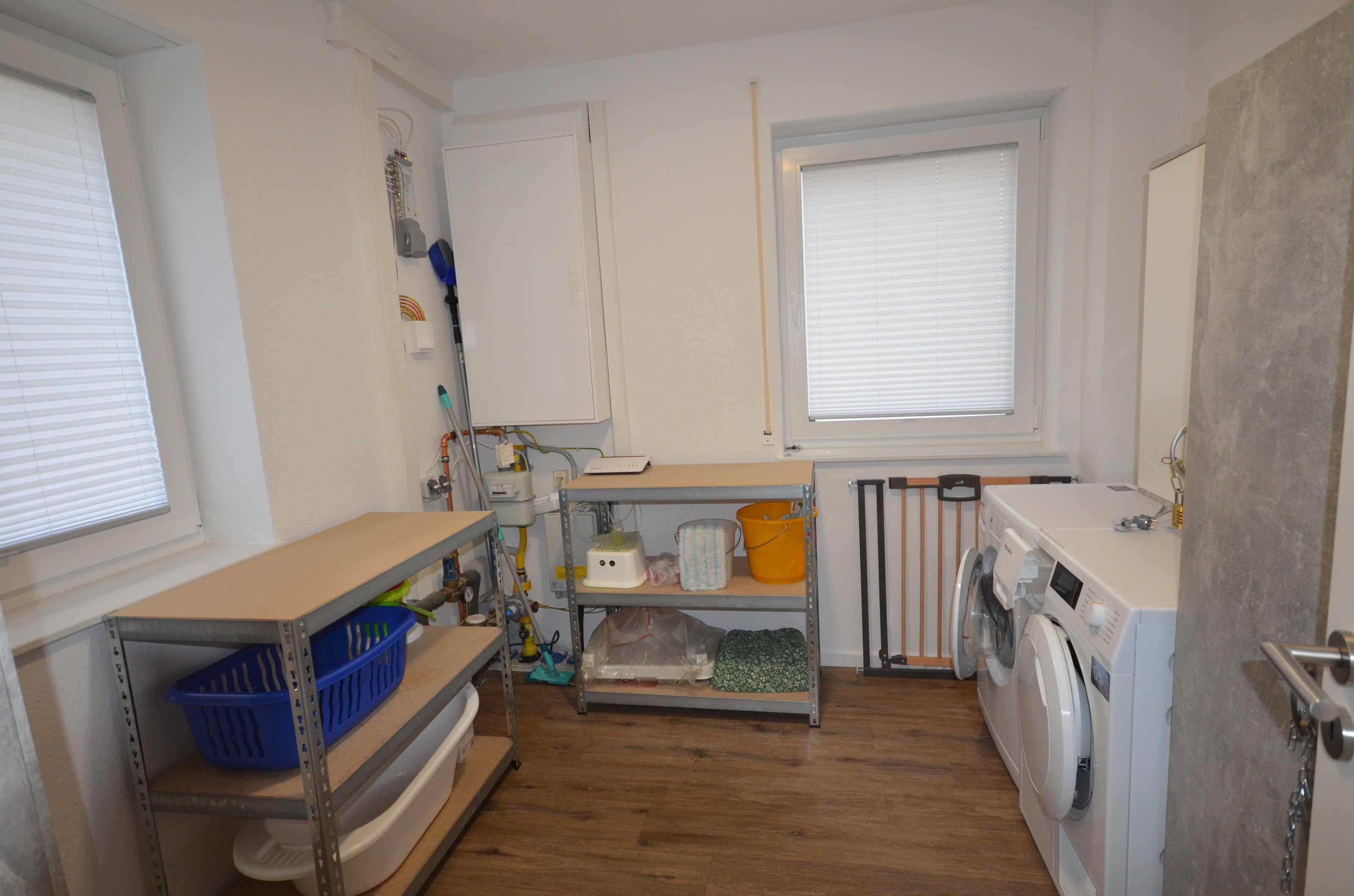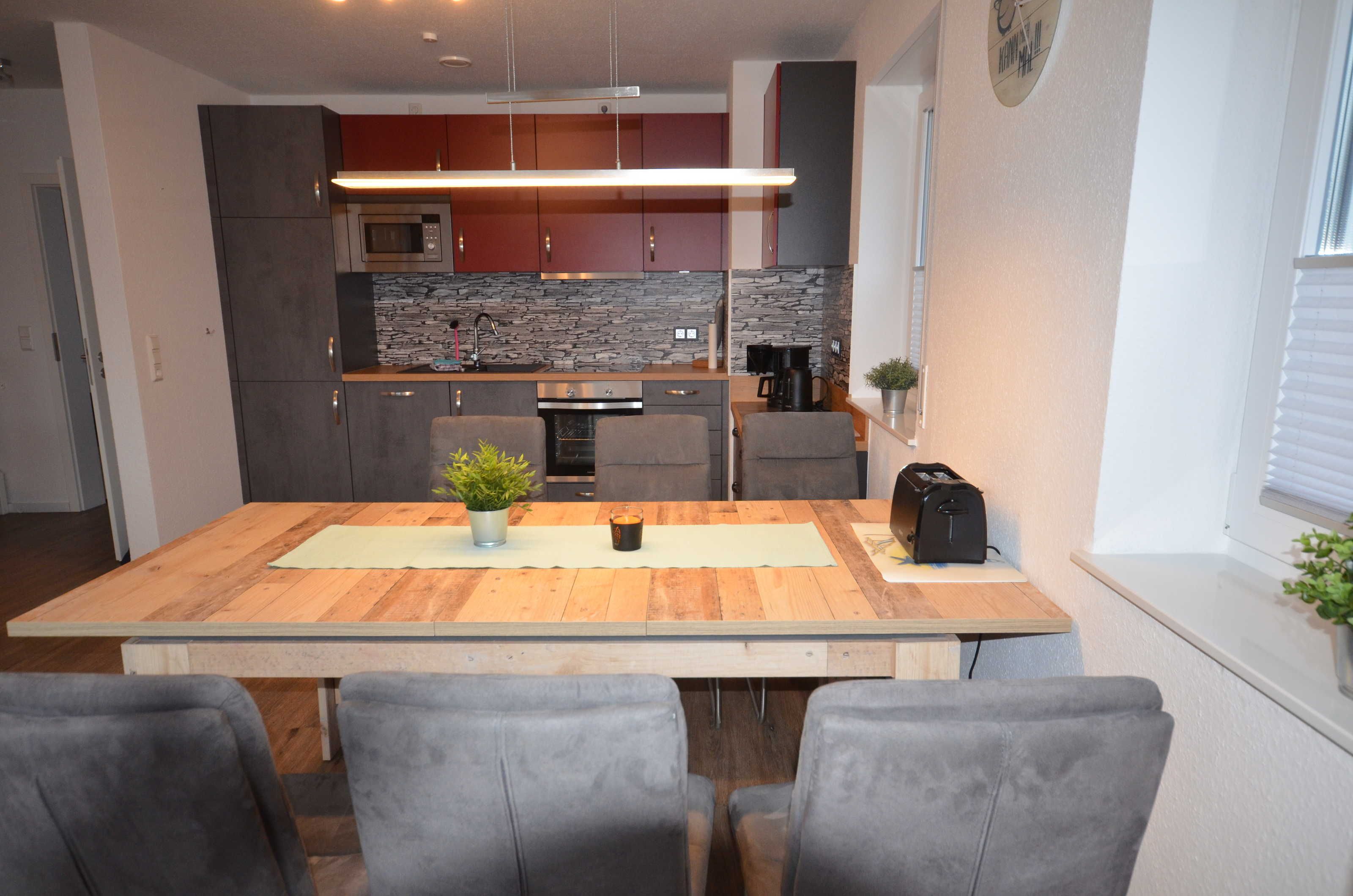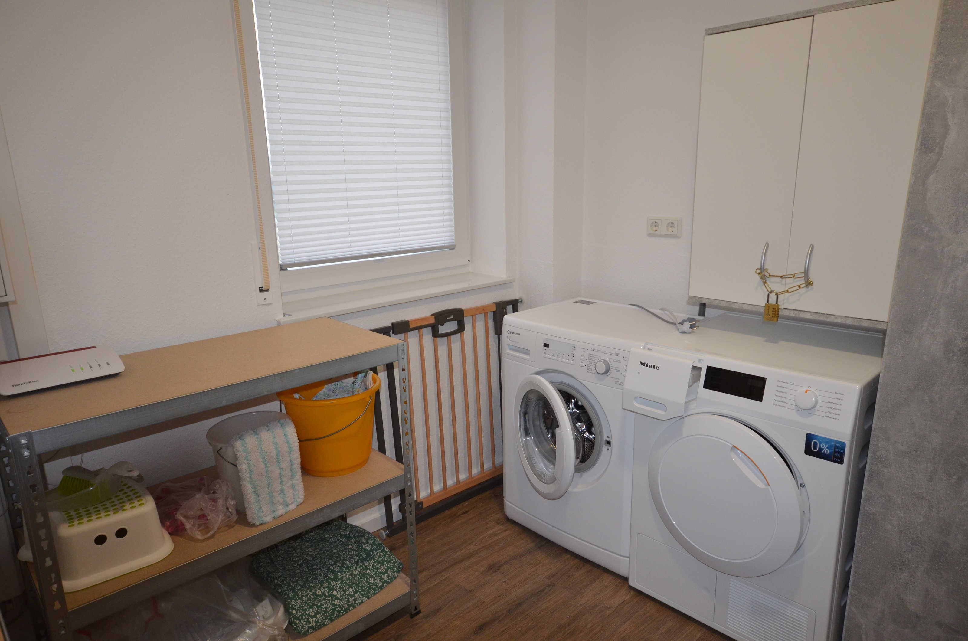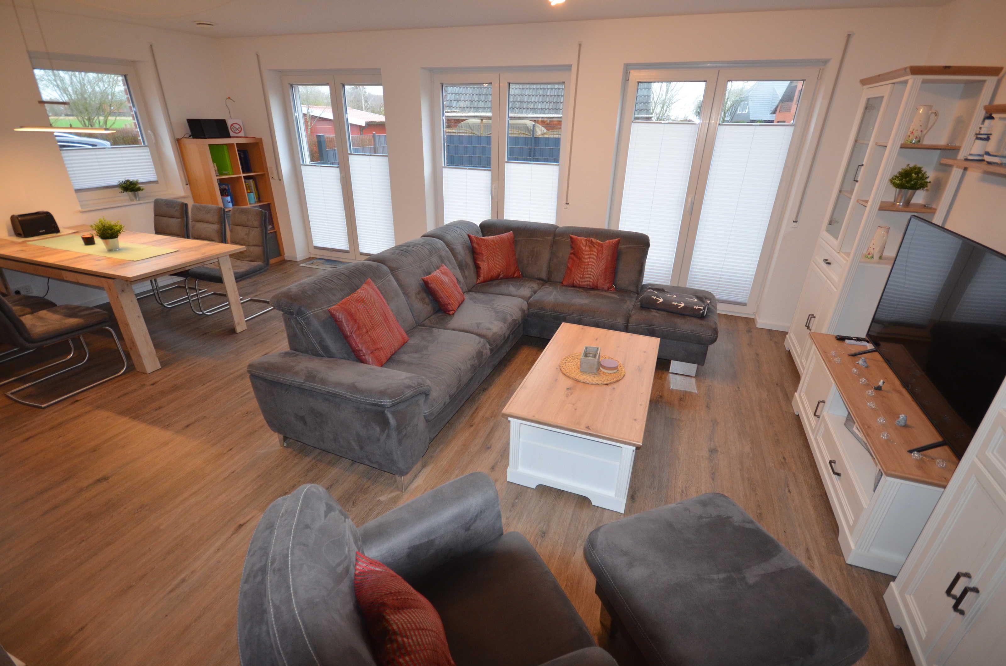 In der unteren Etage ist der großzügige Wohn- und Essbereich mit moderner offener Küchenzeile. Sowohl im Wohn- als auch im Essbereich ist ausreichend Platz für alle Gäste. Auch in diesem Raum befindet sich ein großer Flachbildfernseher. Eine Auswahl an Gesellschaftsspielen und Büchern stehen Ihnen genauso zur Verfügung wie kostenloses WLAN. Außerdem befindet sich in dieser Etage ein geräumiger Abstellraum. Die große, sonnige Terrasse mit bequemen Gartenmöbeln lädt zum Verweilen und Sonnen ein. Da die Terrasse komplett umzäunt ist, können Sie auch Ihre kleinen Kinder gefahrlos auf dem Rasen der Terrasse spielen lassen und müssen Sie nicht jede Sekunde im Auge haben. In unserem Fahrradschuppen steht Ihnen auch ein Bollerwagen zur Verfügung.
