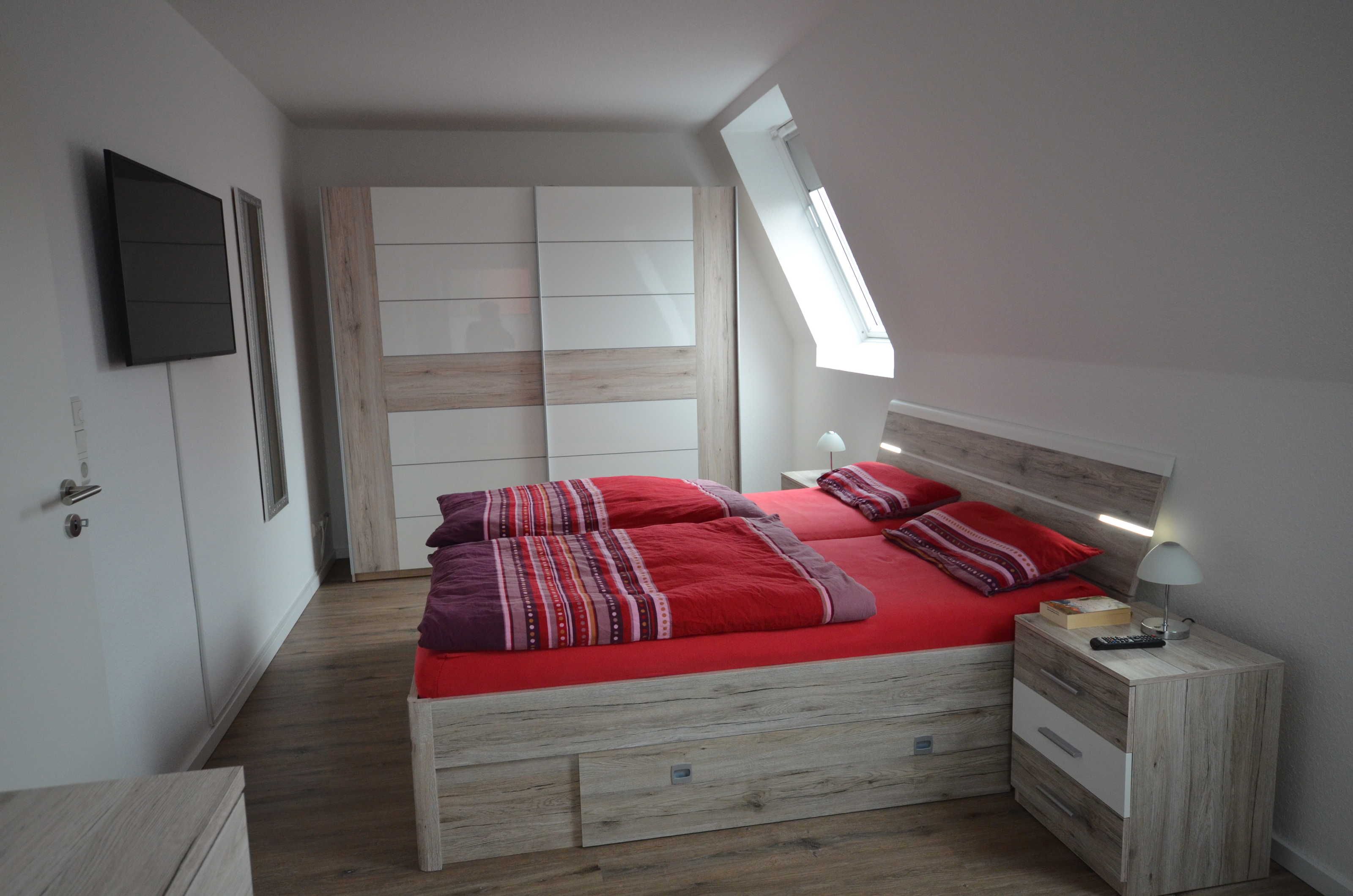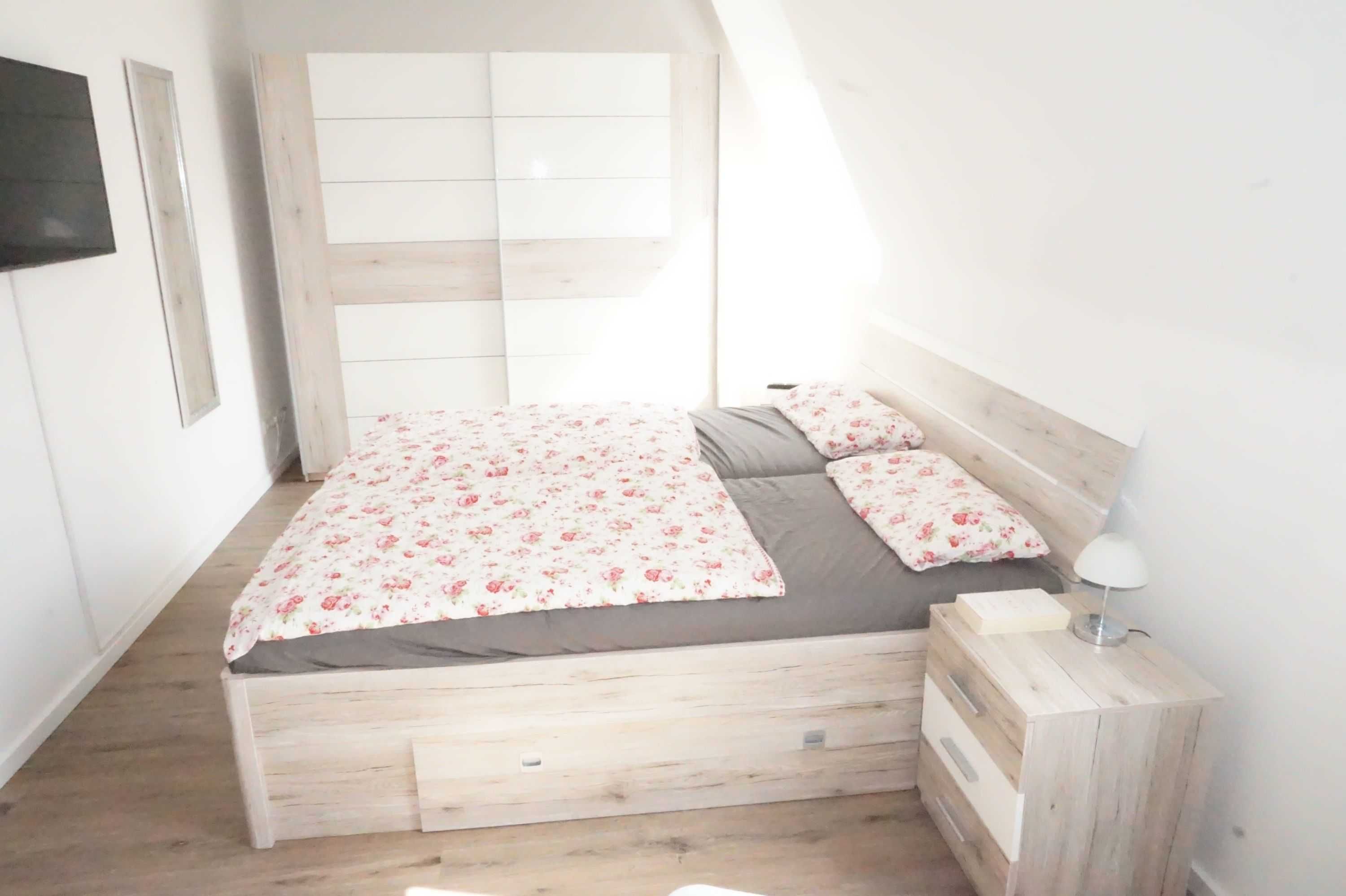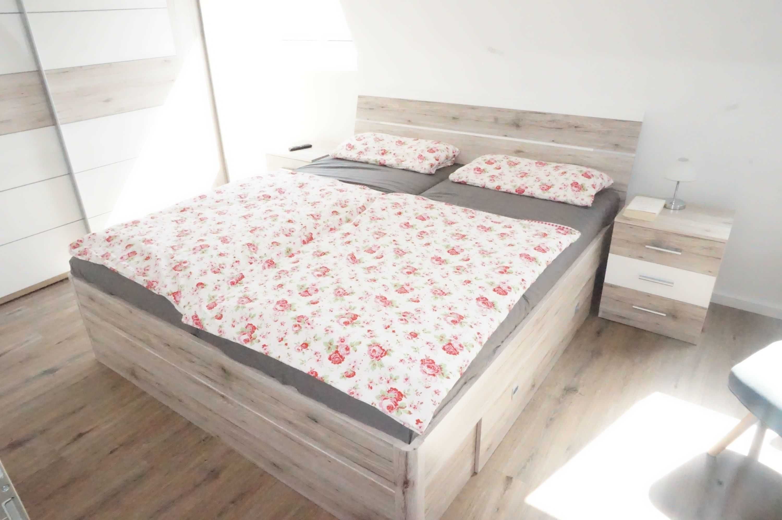 • Schlafzimmer 1 verfügt über ein Doppelbett (Maße: 1,80 x 2,00 Meter) und viel Platz für Ihren Kofferinhalt. In dem geräumigen Zimmer ist außerdem ausreichend Platz für das vorhandene Reisebett.