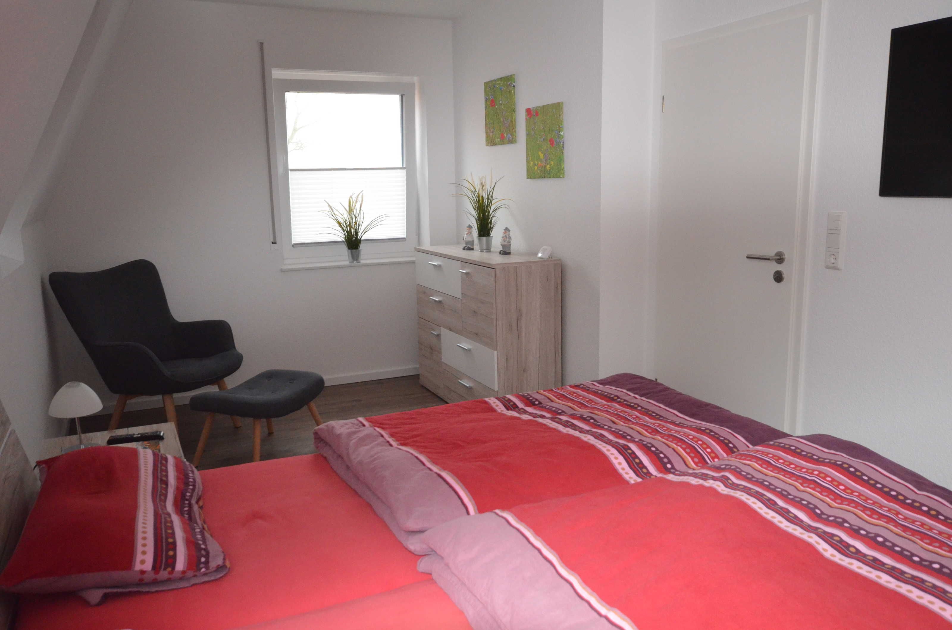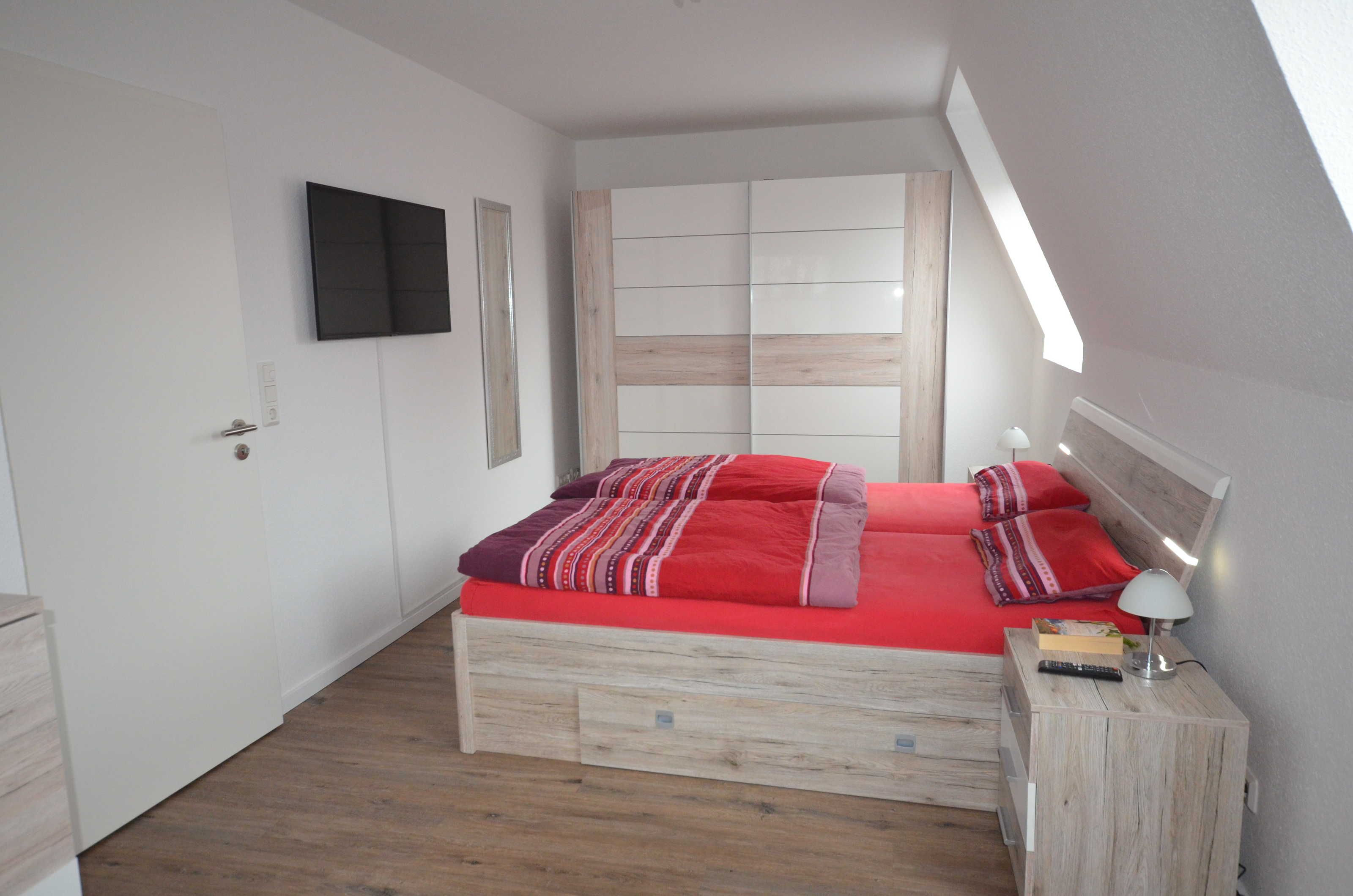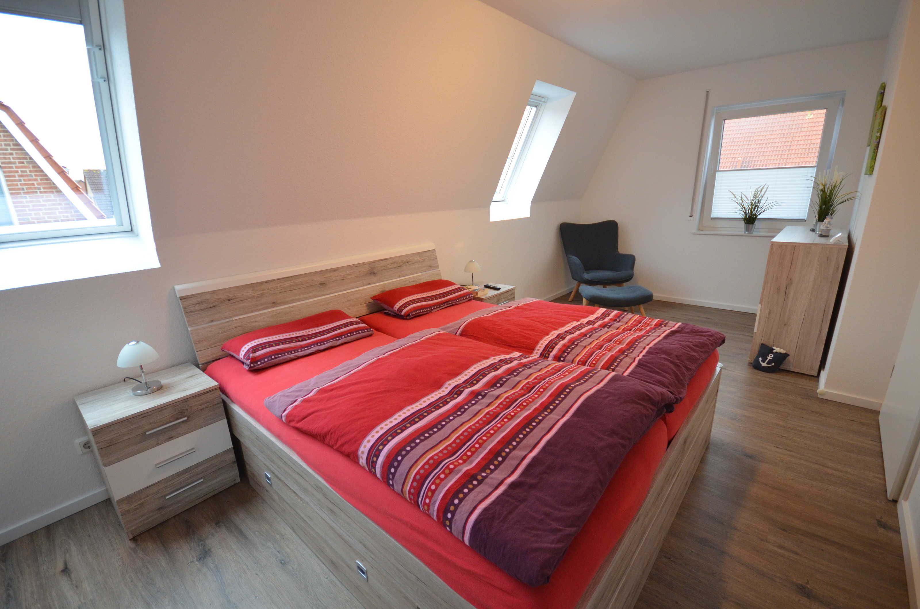 • Schlafzimmer 1 verfügt über ein Doppelbett (Maße: 1,80 x 2,00 Meter) und viel Platz für Ihren Kofferinhalt. In dem geräumigen Zimmer ist außerdem ausreichend Platz für das vorhandene Reisebett.