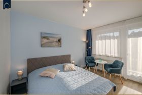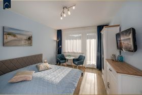 Die 32 m² große Wohnung eignet sich ideal für Paare oder Alleinreisende. Sie verfügt über ein separates Schlafzimmer mit gemütlichem Doppelbett, ein modernes Bad mit Dusche und WC sowie einen offenen Wohnbereich mit gut ausgestatteter Küche. Die überdachte Terrasse bzw. der Balkon lädt zu entspannten Stunden bei frischer Meeresluft ein. Ein privater Parkplatz auf dem abgeschlossenen Grundstück sorgt für sorgenfreies Ankommen.
