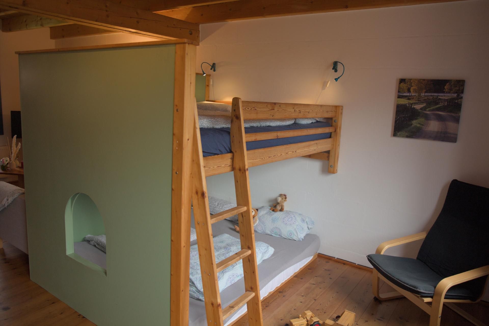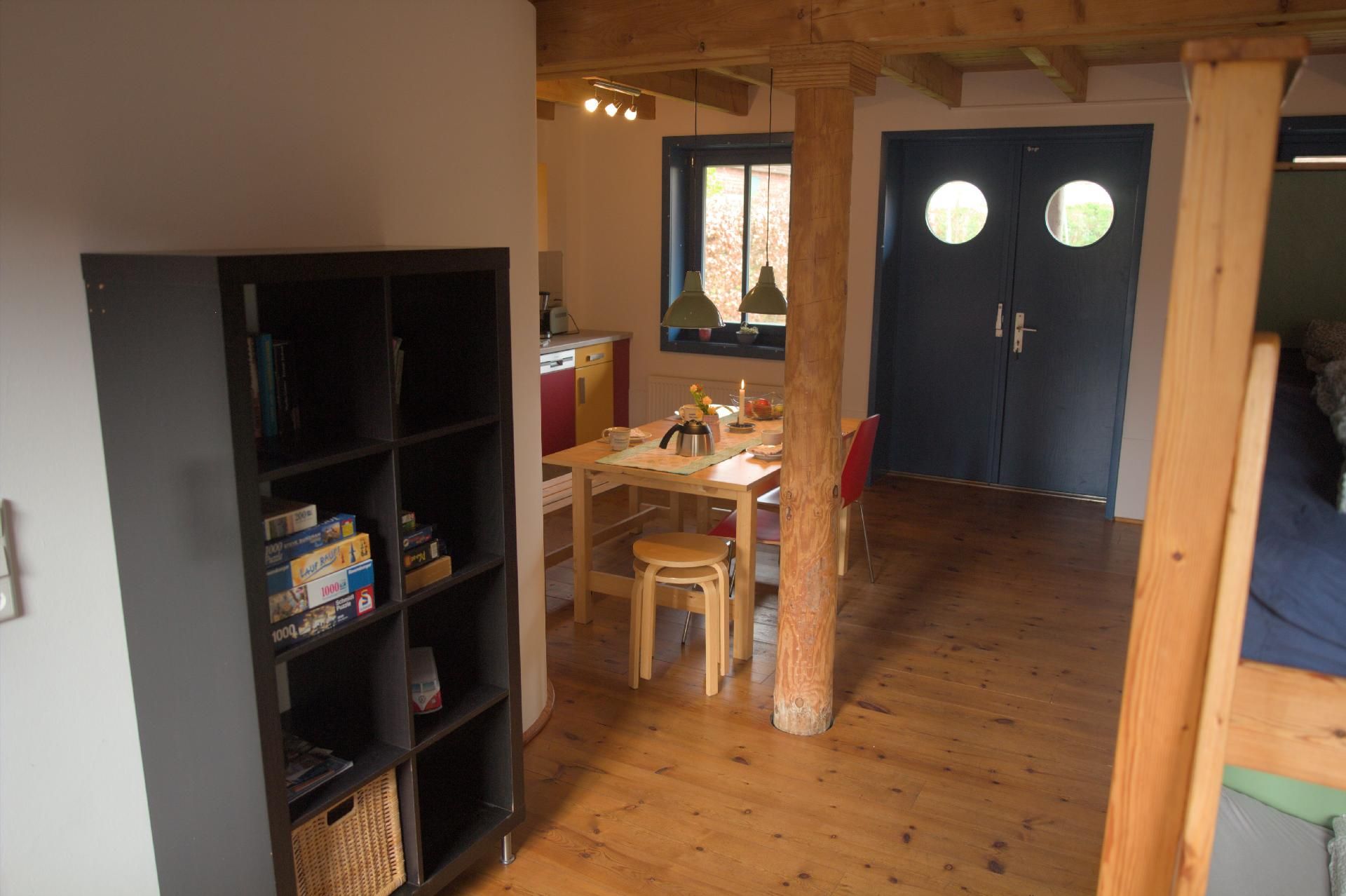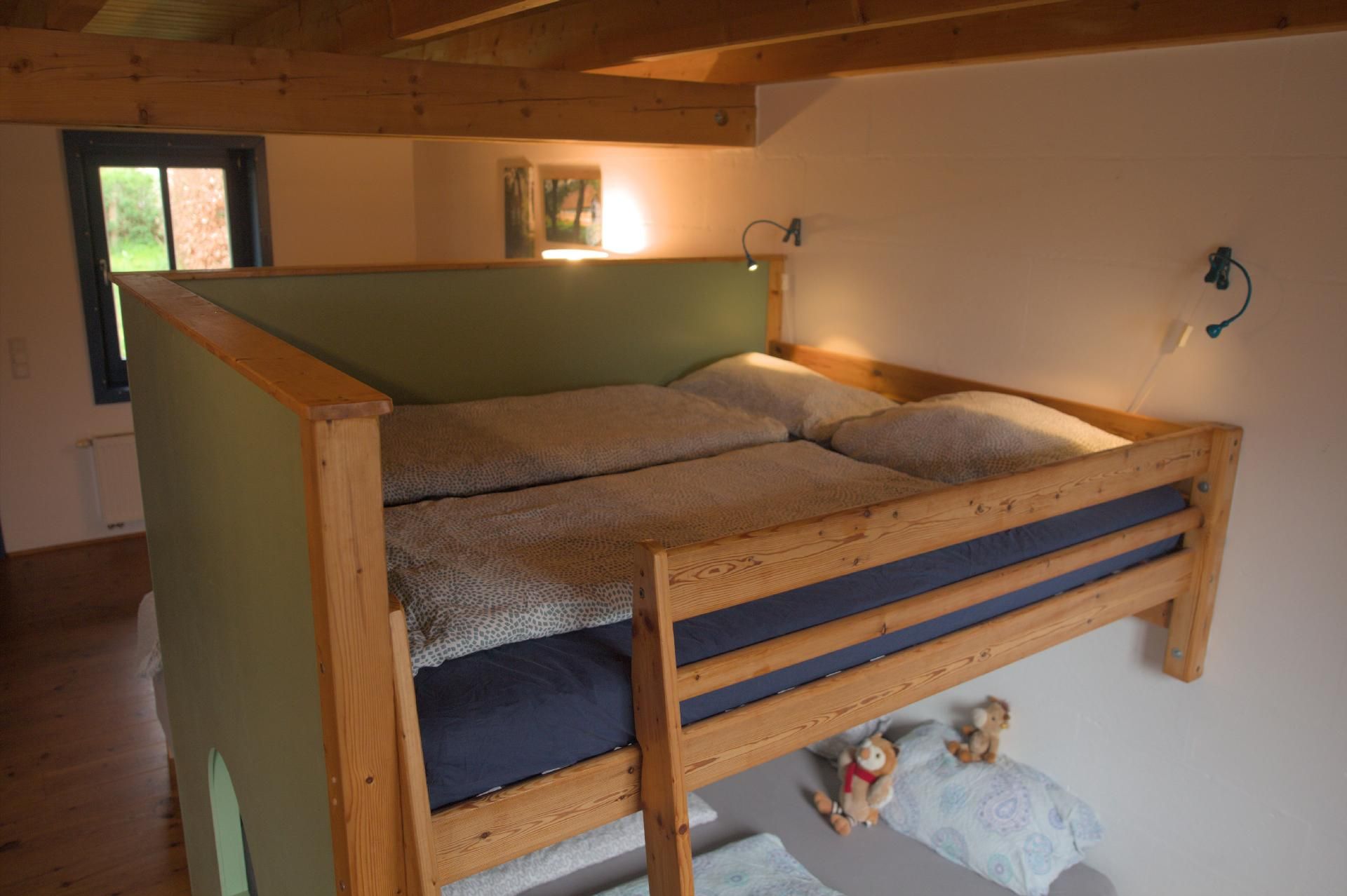 Im Inneren des Hauses erwartet Sie ein großer Wohnraum, der mit einer voll ausgestatteten Küche, einem gemütlichen Essbereich und einem clever durch ein Doppelhochbett abgetrennten Schlafbereich ausgestattet ist. Unter diesem befinden sich zwei kuschelige Plätze, die besonders bei den kleinen Gästen beliebt sind. Ab drei zahlenden Gästen steht ein zusätzliches separates Schlafzimmer zur Verfügung. Für die jüngsten Besucher können ein Kinderreisebett und ein Hochstuhl bereitgestellt werden, um Ihren Aufenthalt so komfortabel wie möglich zu gestalten.