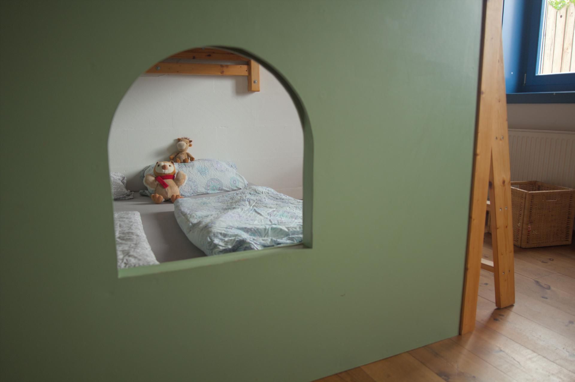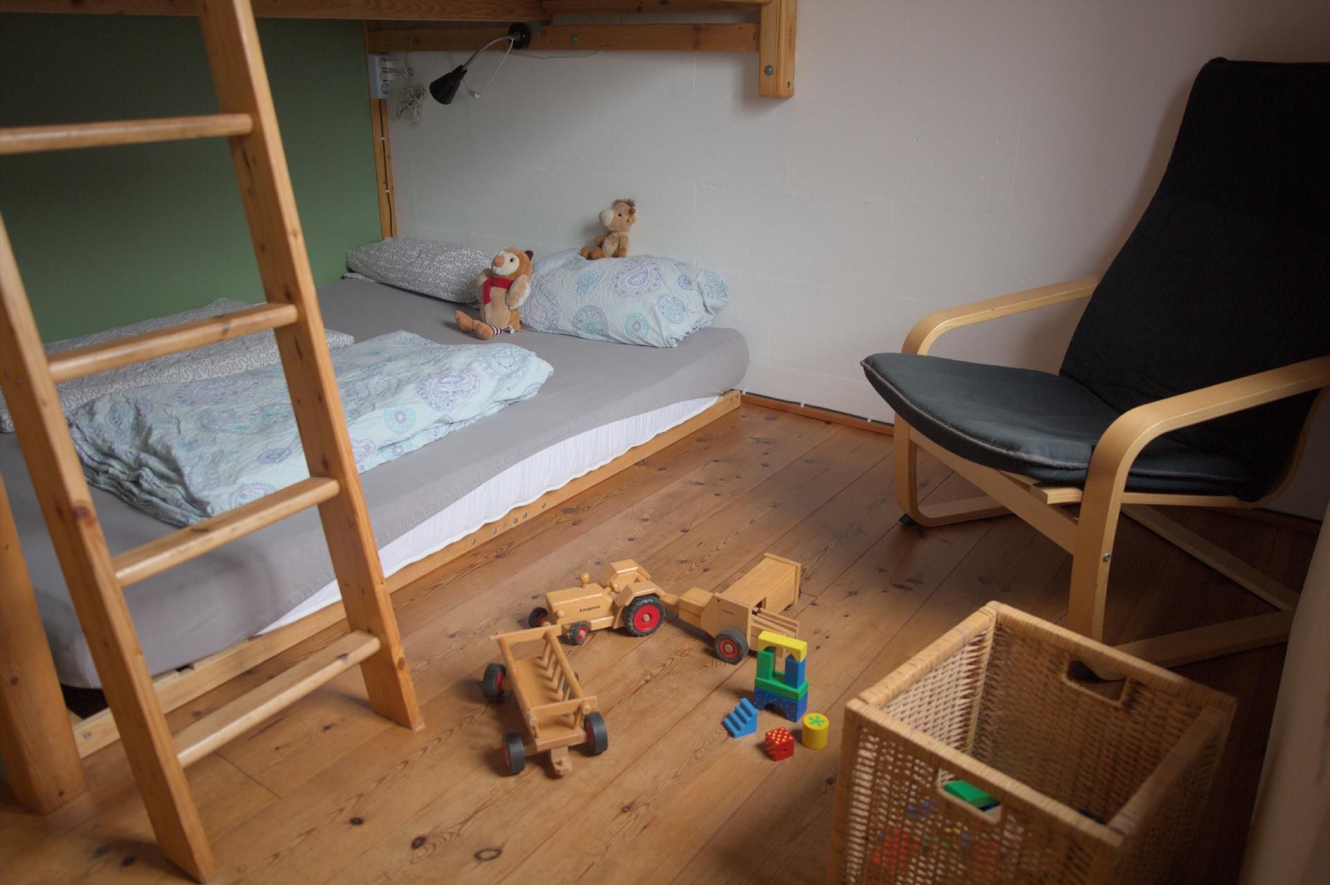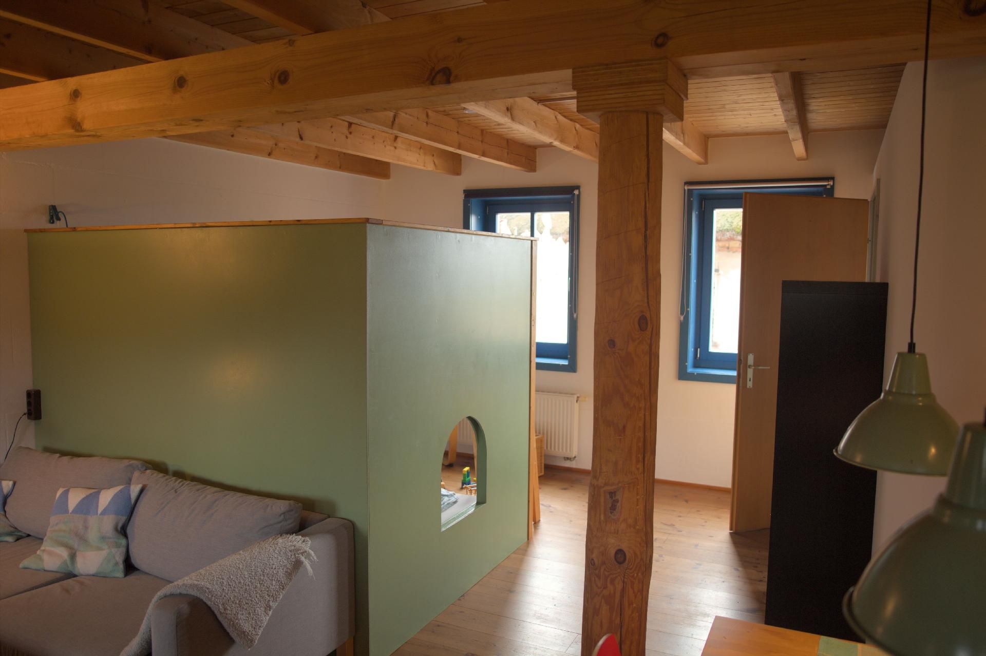Im Inneren des Hauses erwartet Sie ein großer Wohnraum, der mit einer voll ausgestatteten Küche, einem gemütlichen Essbereich und einem clever durch ein Doppelhochbett abgetrennten Schlafbereich ausgestattet ist. Unter diesem befinden sich zwei kuschelige Plätze, die besonders bei den kleinen Gästen beliebt sind. Ab drei zahlenden Gästen steht ein zusätzliches separates Schlafzimmer zur Verfügung. Für die jüngsten Besucher können ein Kinderreisebett und ein Hochstuhl bereitgestellt werden, um Ihren Aufenthalt so komfortabel wie möglich zu gestalten.