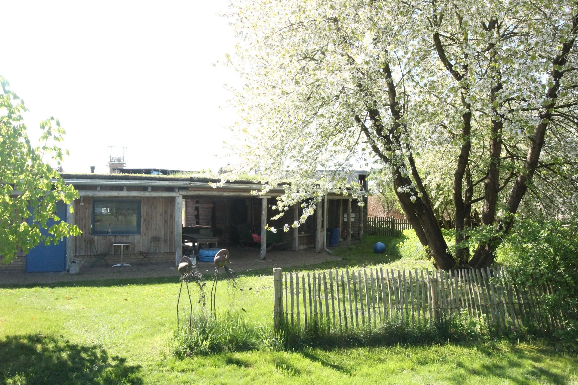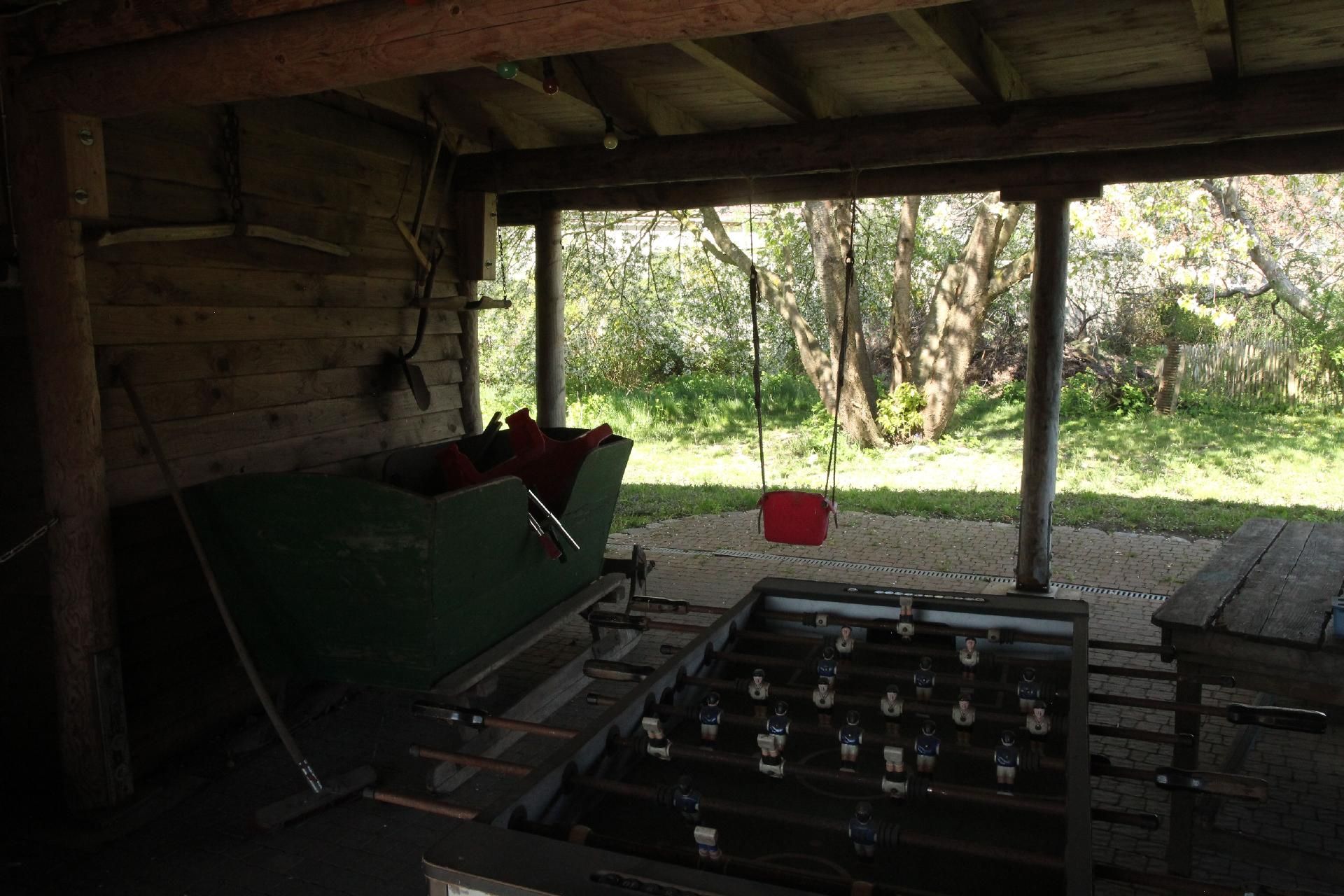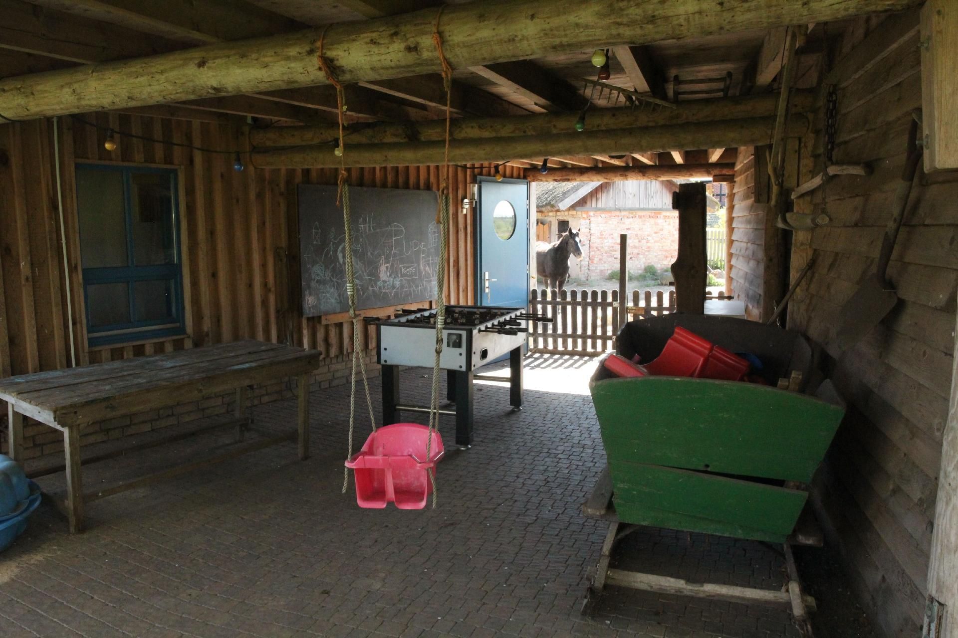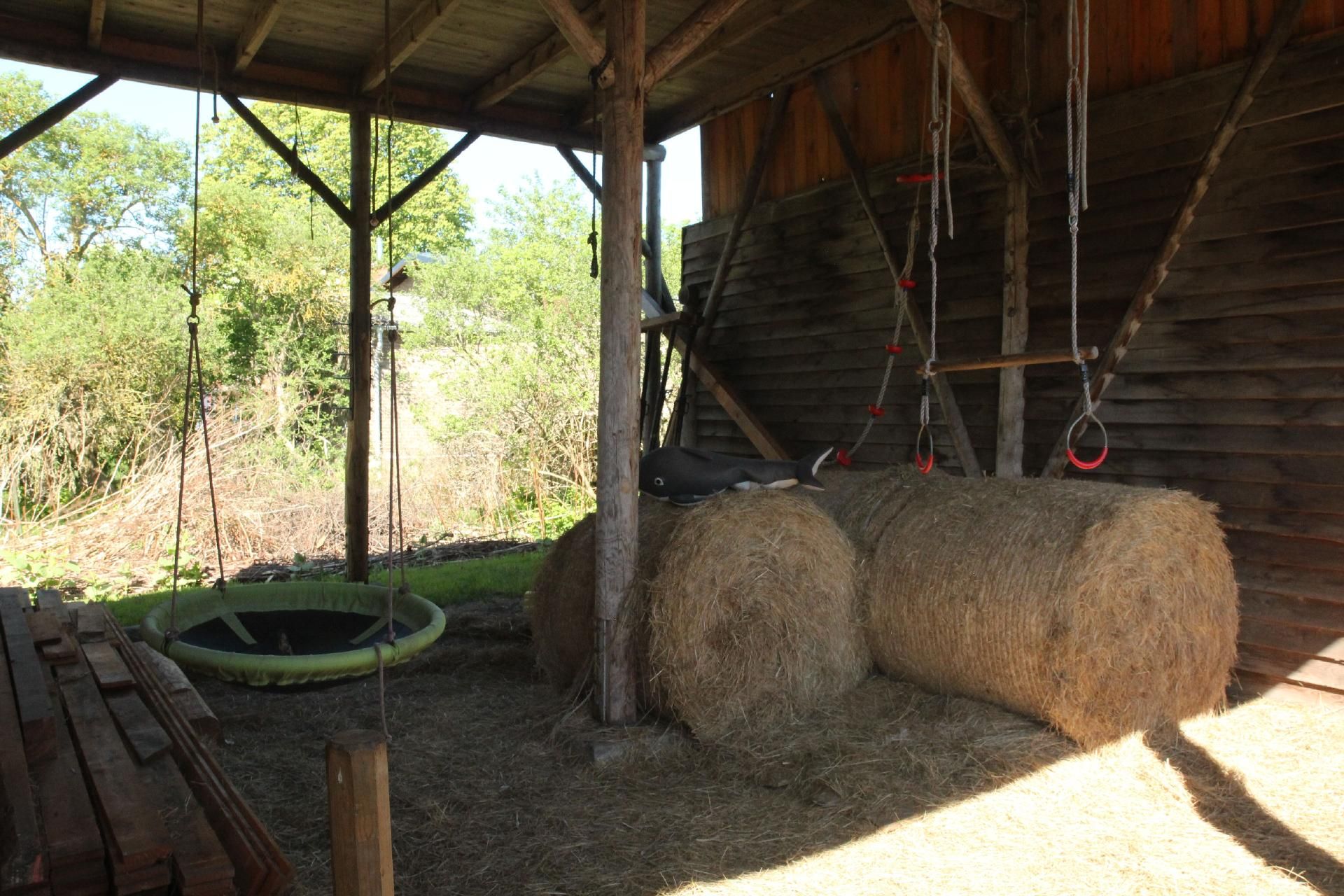 Der große Garten rund um das Haus lädt zum Spielen, Grillen und Entspannen ein. Die Streuobstwiese, der Holunderwald und der Spielplatz mit Heuballen vermitteln echtes Bauernhof-Feeling. Ein besonderes Highlight ist die halboffene Scheune, die bei jedem Wetter einen geschützten Platz im Freien bietet. Auf dem angrenzenden Hof gibt es Ponys und Esel, die gestreichelt, gekuschelt und nach Absprache auch geritten werden dürfen.