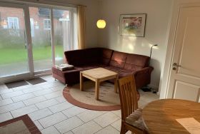 Der Wohnbereich befindet sich im Erdgeschoss. Das geräumige Wohnzimmer lädt mit einer separaten Sitz- und Essecke sowie TV und Radio zum Entspannen ein. Von hier aus gelangen Sie auf die möblierte Südterrasse mit Strandkorb.