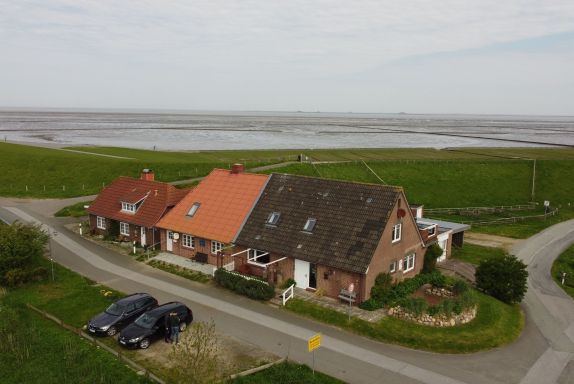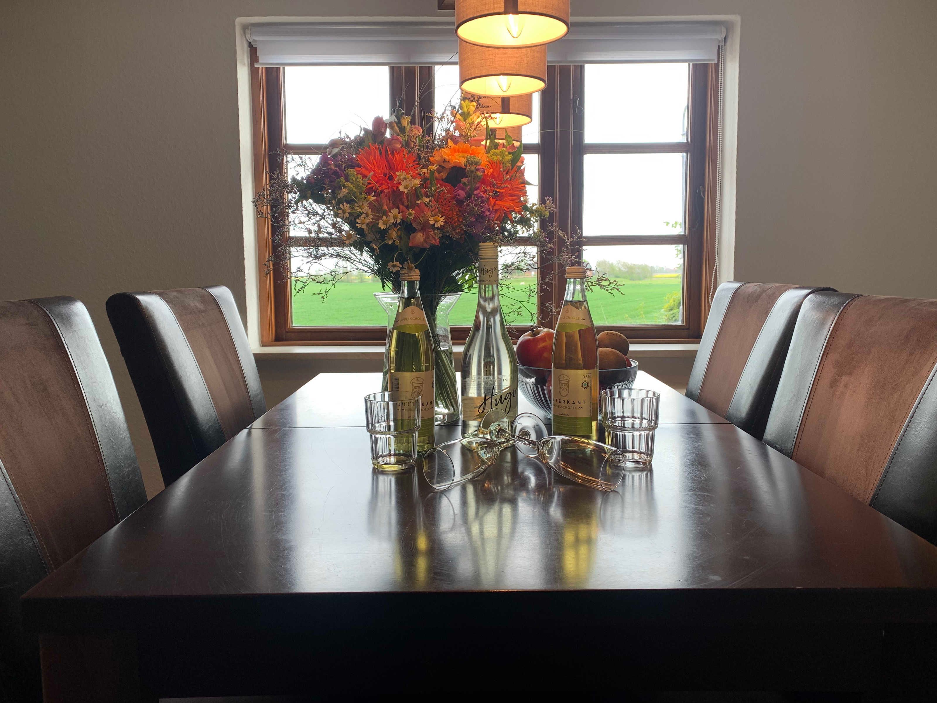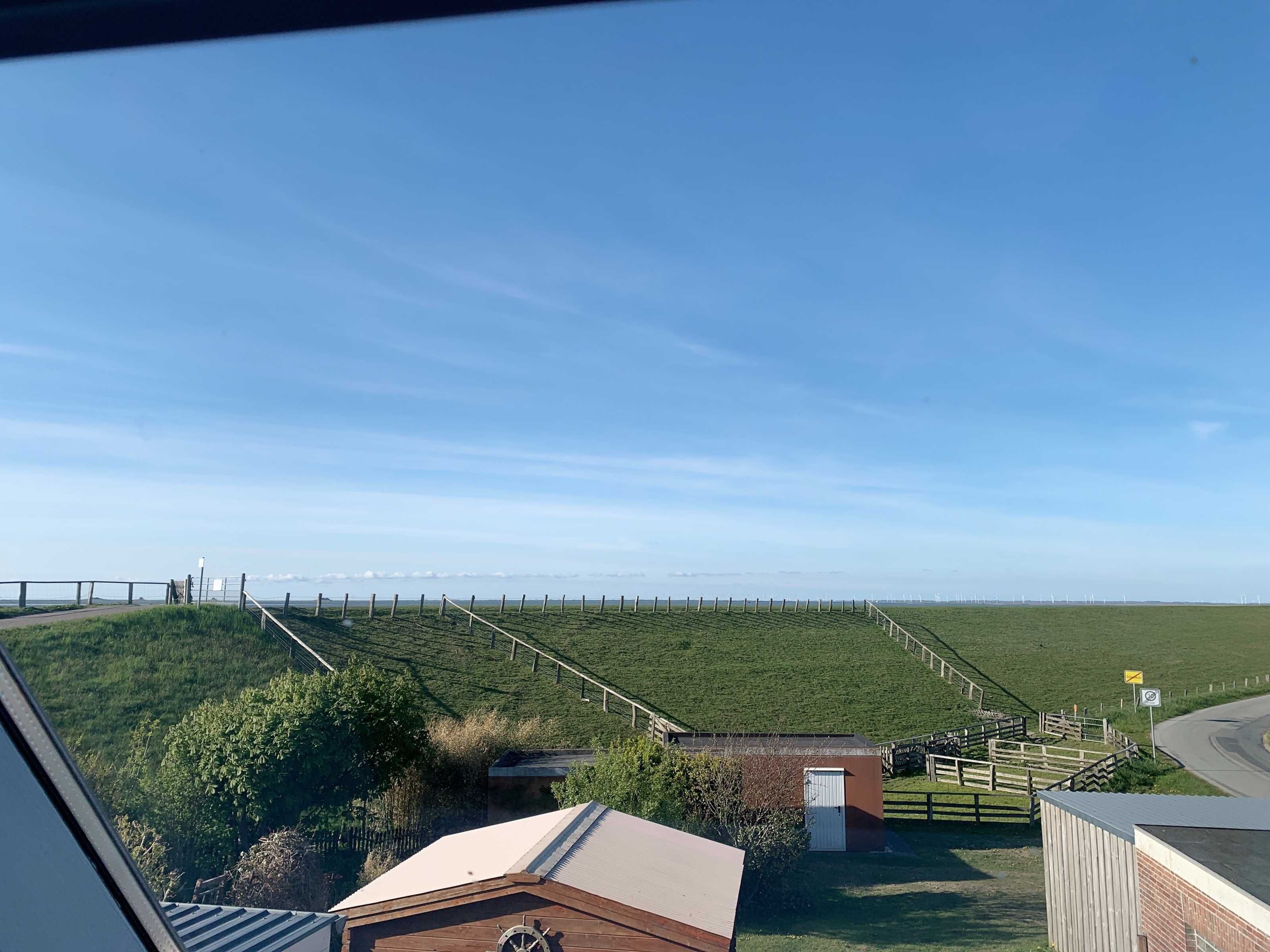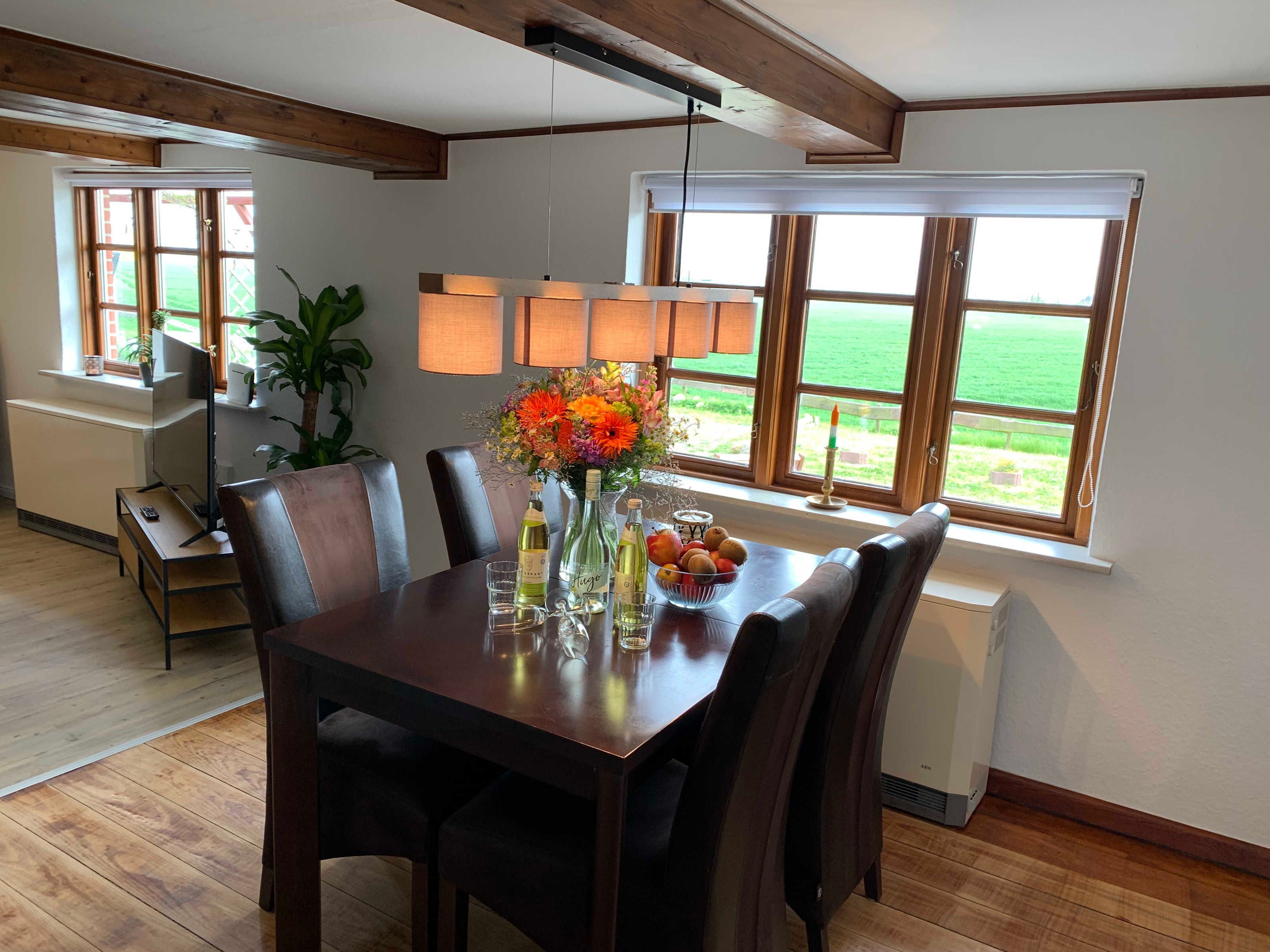 Direkt am Aussendeich gelegen bietet das 1870 gebaute und 2022 grundsanierte Haus Platz für bis zu 6 Personen. Im Erdgeschoss erwartet euch das große Wohnzimmer mit Essbereich, einer großen Couch, Smart-TV (inkl. Netflix), Büchern, Spielen und Infomaterial rund um Nordstrand und die Nordsee. Der Dielenboden und die Balkenlage machen das Wohnzimmer besonders gemütlich - und der wunderbare Panoramablick auf die Felder und Natur Nordstrands runden das wunderschöne Wohnzimmer ab.