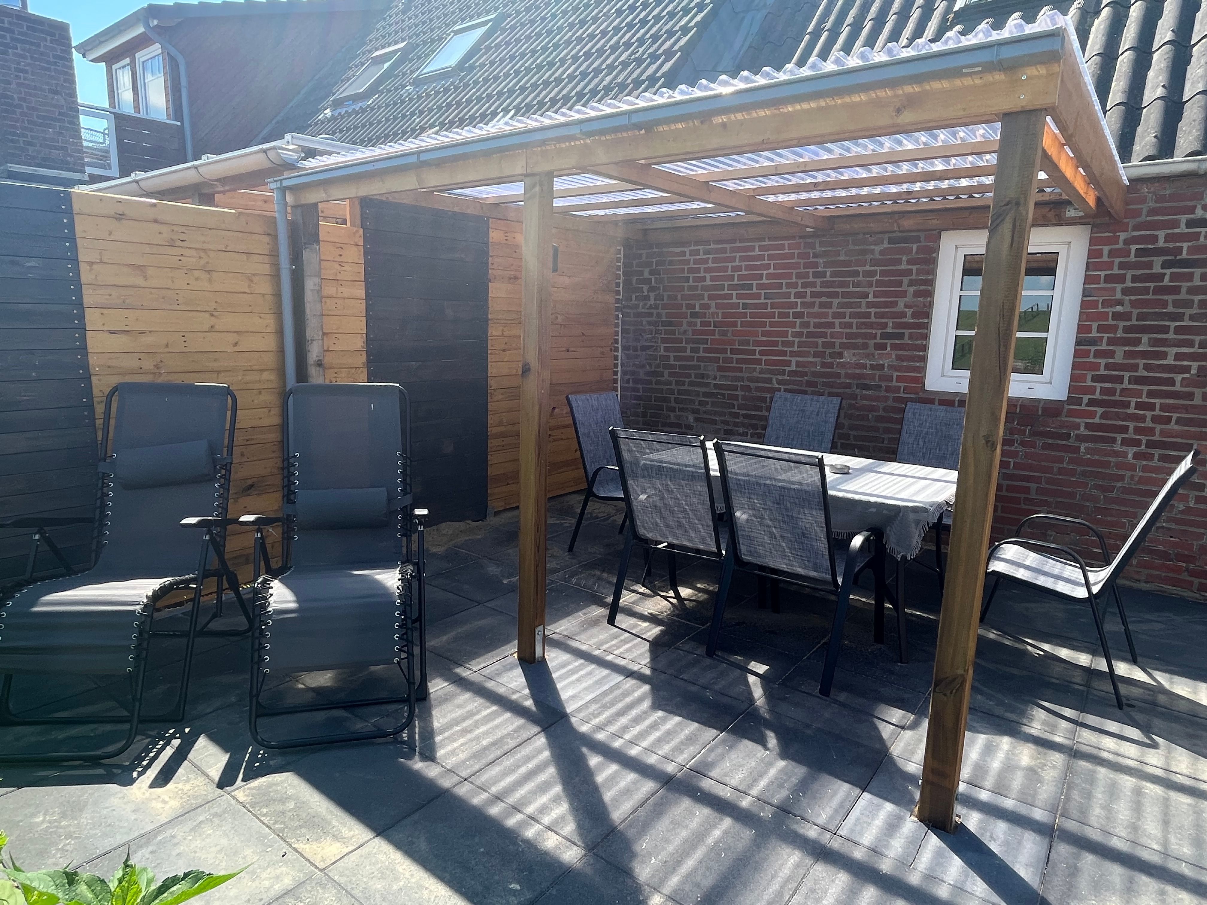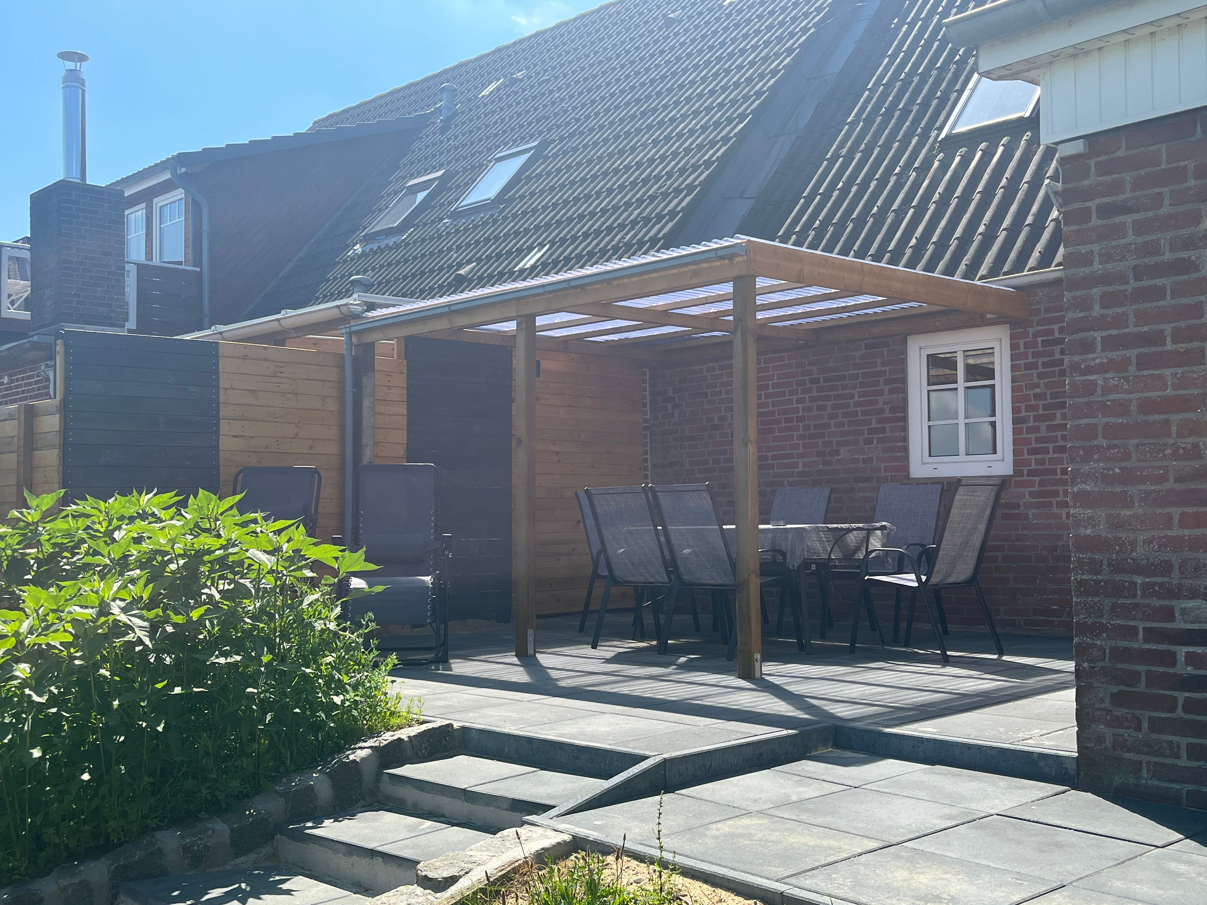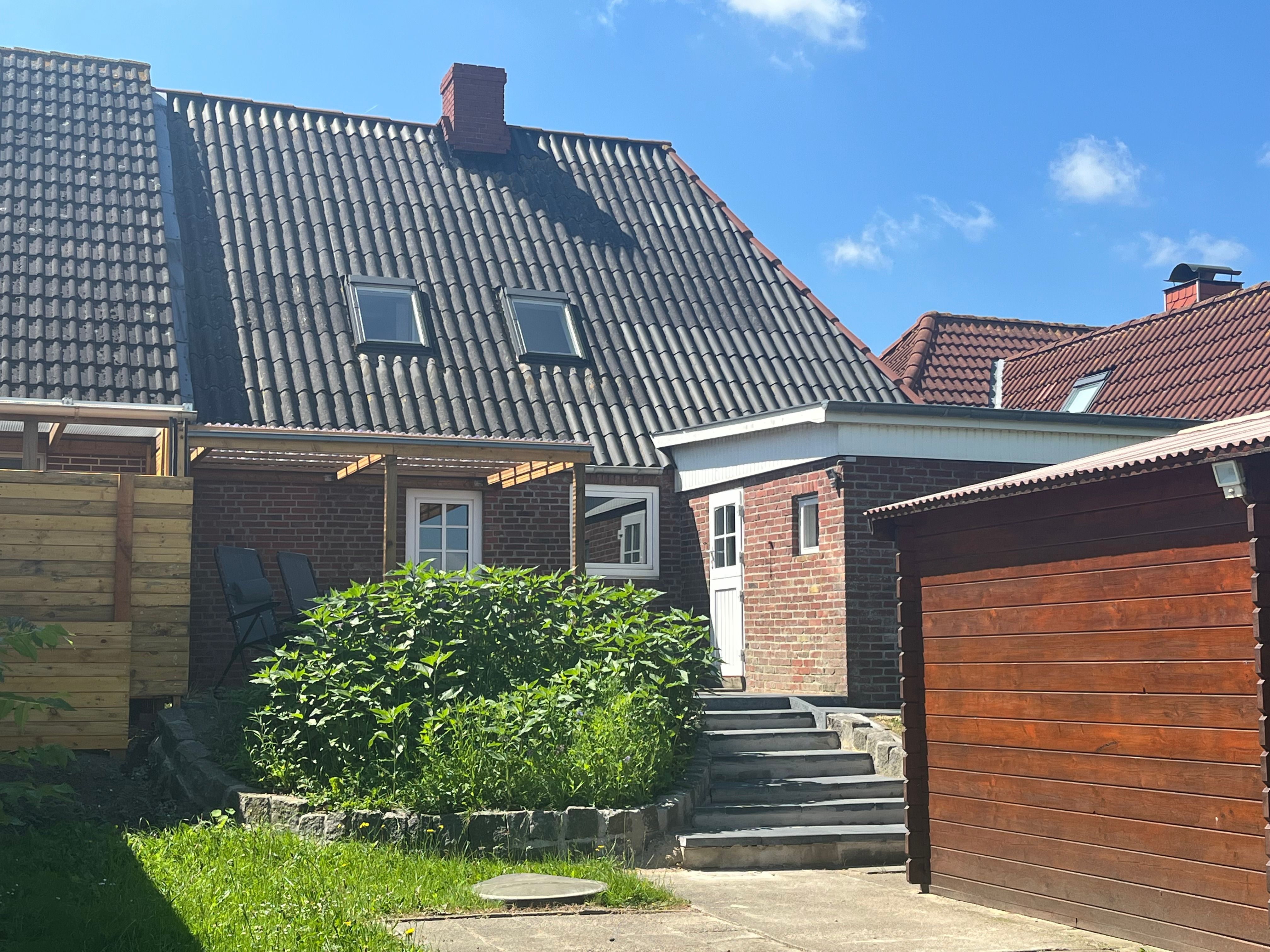 Vom Flur aus kommt man auf die große überdachte vollmöblierte Terrasse und in den hundefreundlich eingezäunten Garten. Dort steht das Gartenhäuschen, wo ihr eure E-Bikes sicher rein stellen und auch aufladen könnt.