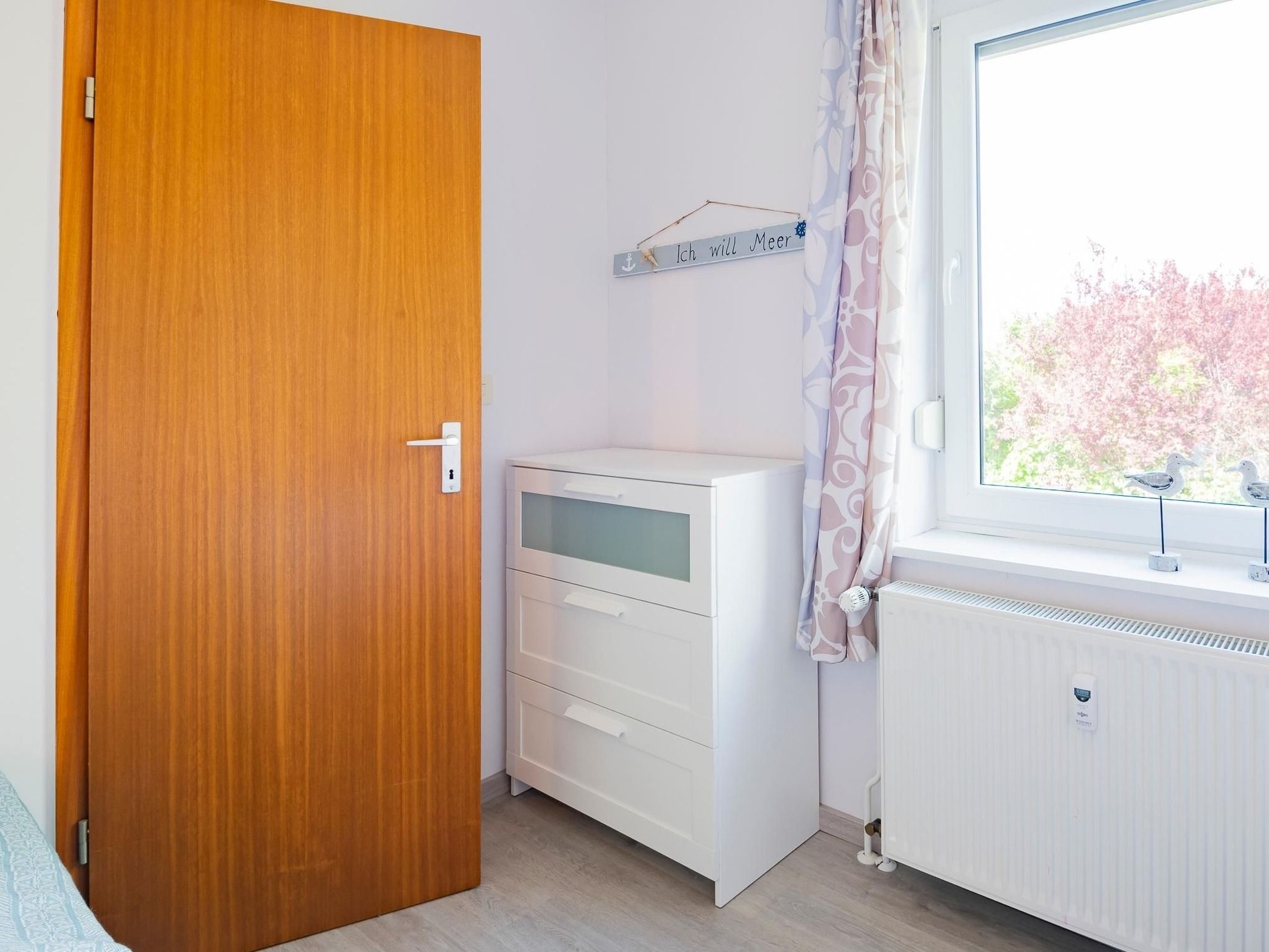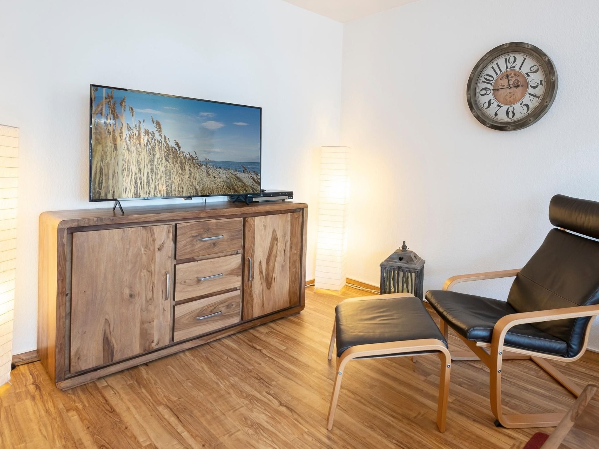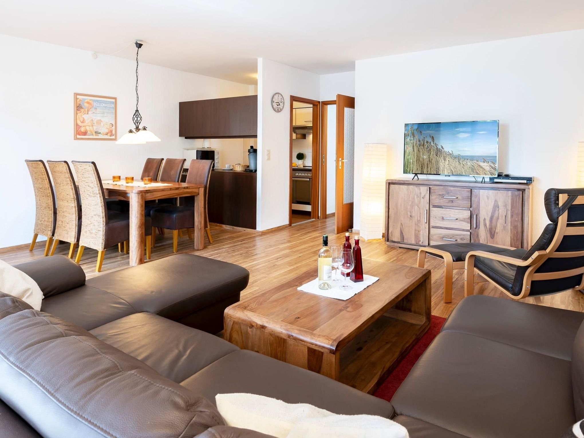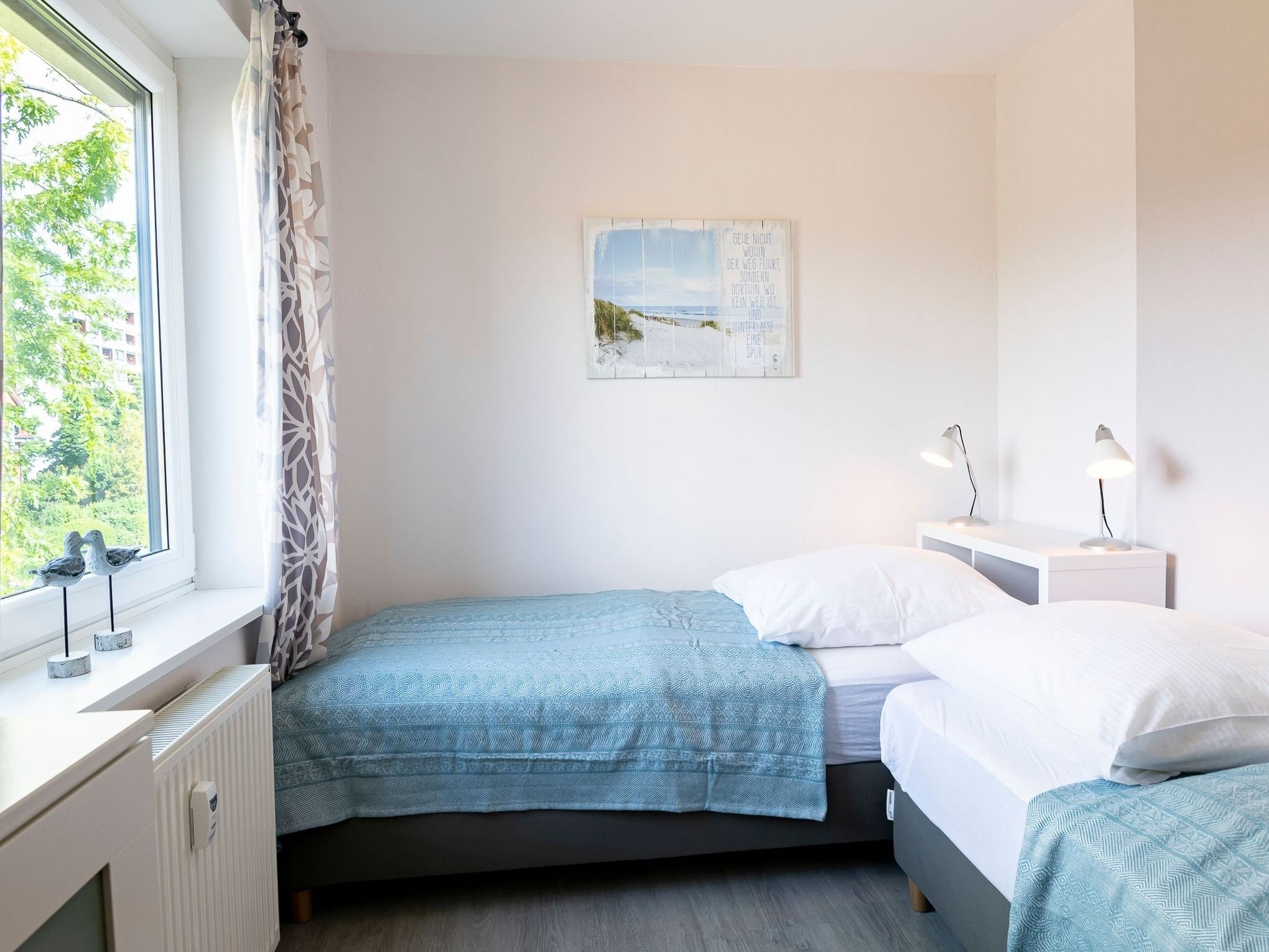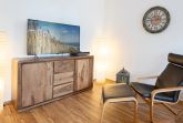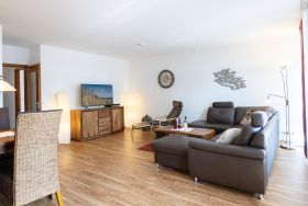 Ein einladender Wohn- und Essbereich heißt Sie in dieser Wohnung willkommen. Das lichtdurchflutetes Wohnzimmer mit Smart-TV und CD-Player lädt Sie ein, den Abend nach einem langen Strandtag ganz gemütlich ausklingen zu lassen. Treten Sie von hier aus auf den sonnigen Balkon, auf dem Sie die Meeresluft schon in den ersten Sonnenstunden des Tages genießen können. Die im Wohnzimmer integrierte Küche ist mit Kühlschrank, Gefrierfach, Backofen, Mikrowelle, Kaffeemaschine und Spülmaschine voll ausgestattet und lässt keine Wünsche offen. Im Elternschlafzimmer mit komfortablem Doppelbett (2x 90x200 cm) steht ein großer Kleiderschrank für Ihre Urlaubsbekleidung bereit. Für geruhsame Nächte befinden sich Außenrollläden an den Fenstern, ebenso im zweiten Schlafzimmer, welches mit zwei Boxspringbetten (je 90x200 cm) und Kommode ausgestattet ist. Und auch im Badezimmer fehlt es Ihnen an nichts. Fußbodenheizung und ein beheizbarer Handtuchhalter sorgen für reichlich Komfort.
