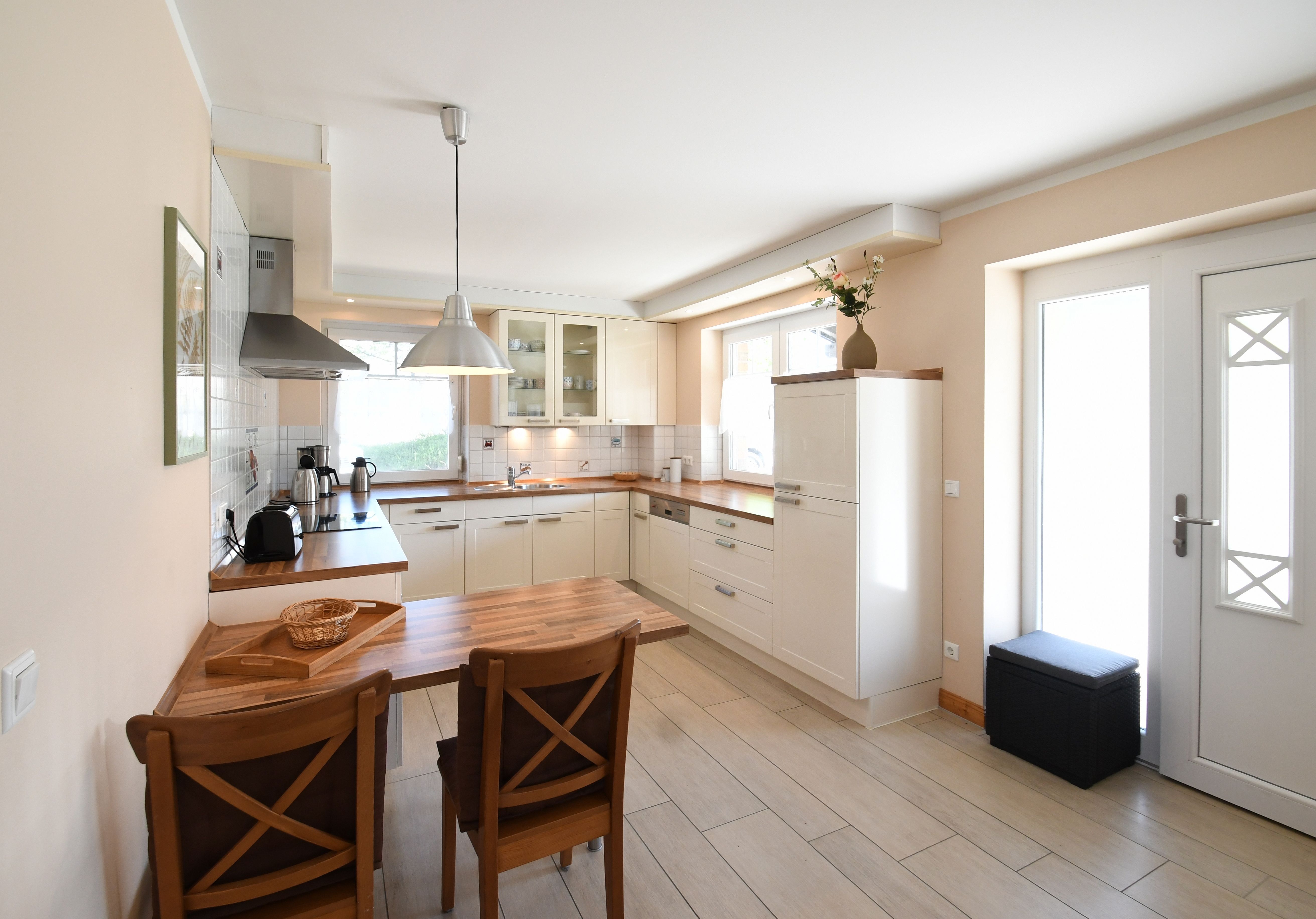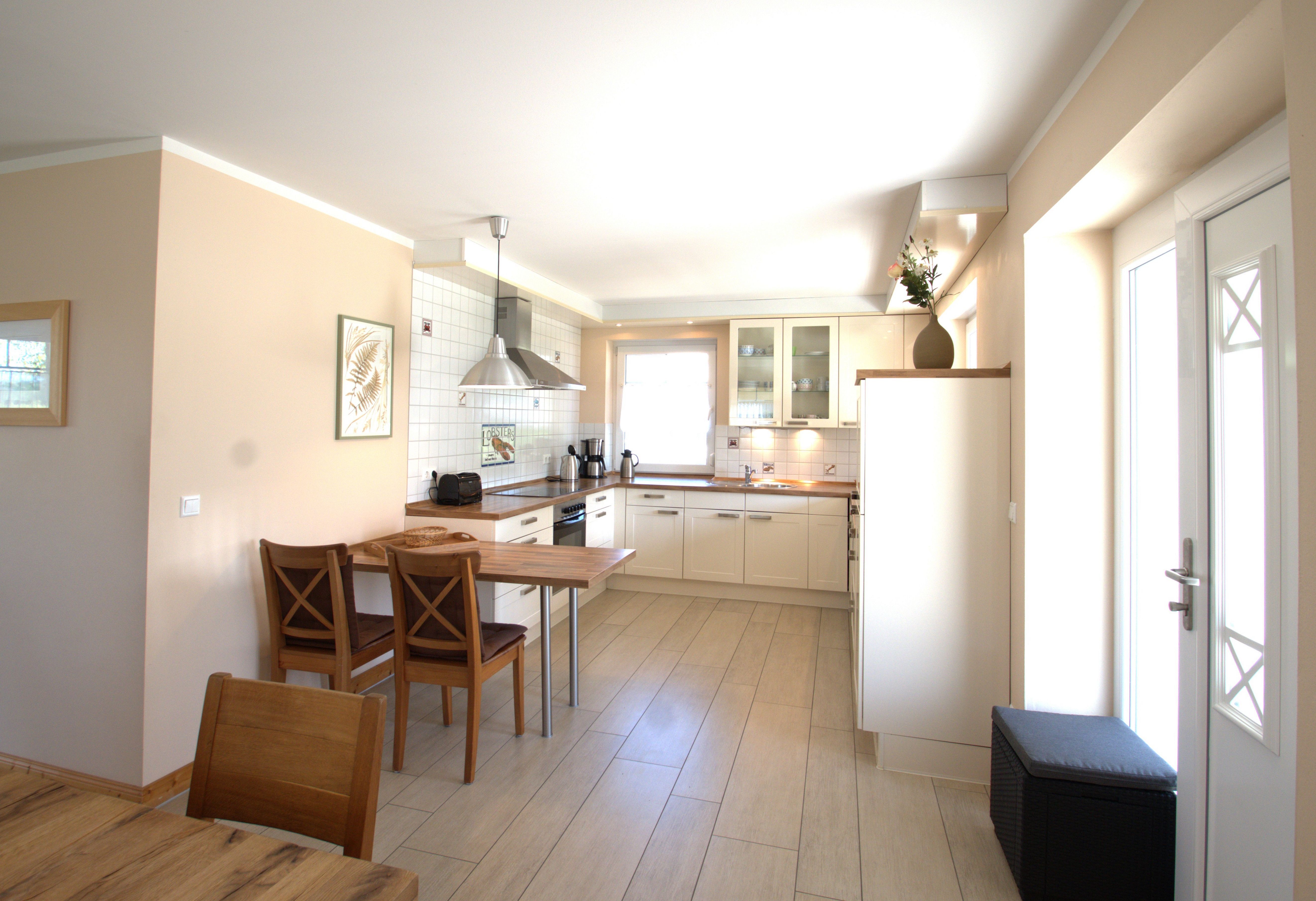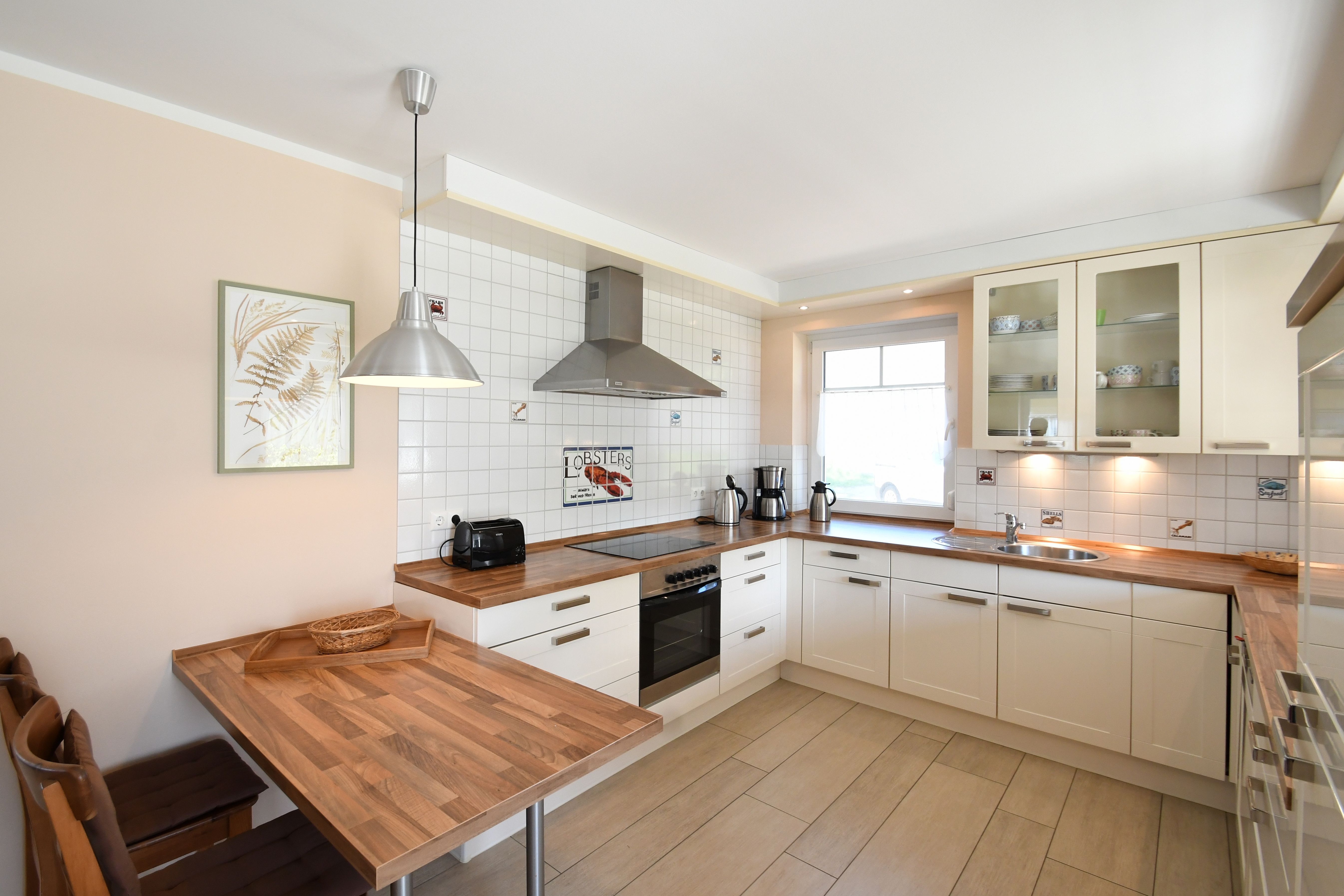 Die offene Küche verfügt über einen Backofen, einen Kühlschrank einen Geschirrspüler, Kaffeemaschine, einen Wasserkocher, einen Toaster und diverses Küchenutensilien.