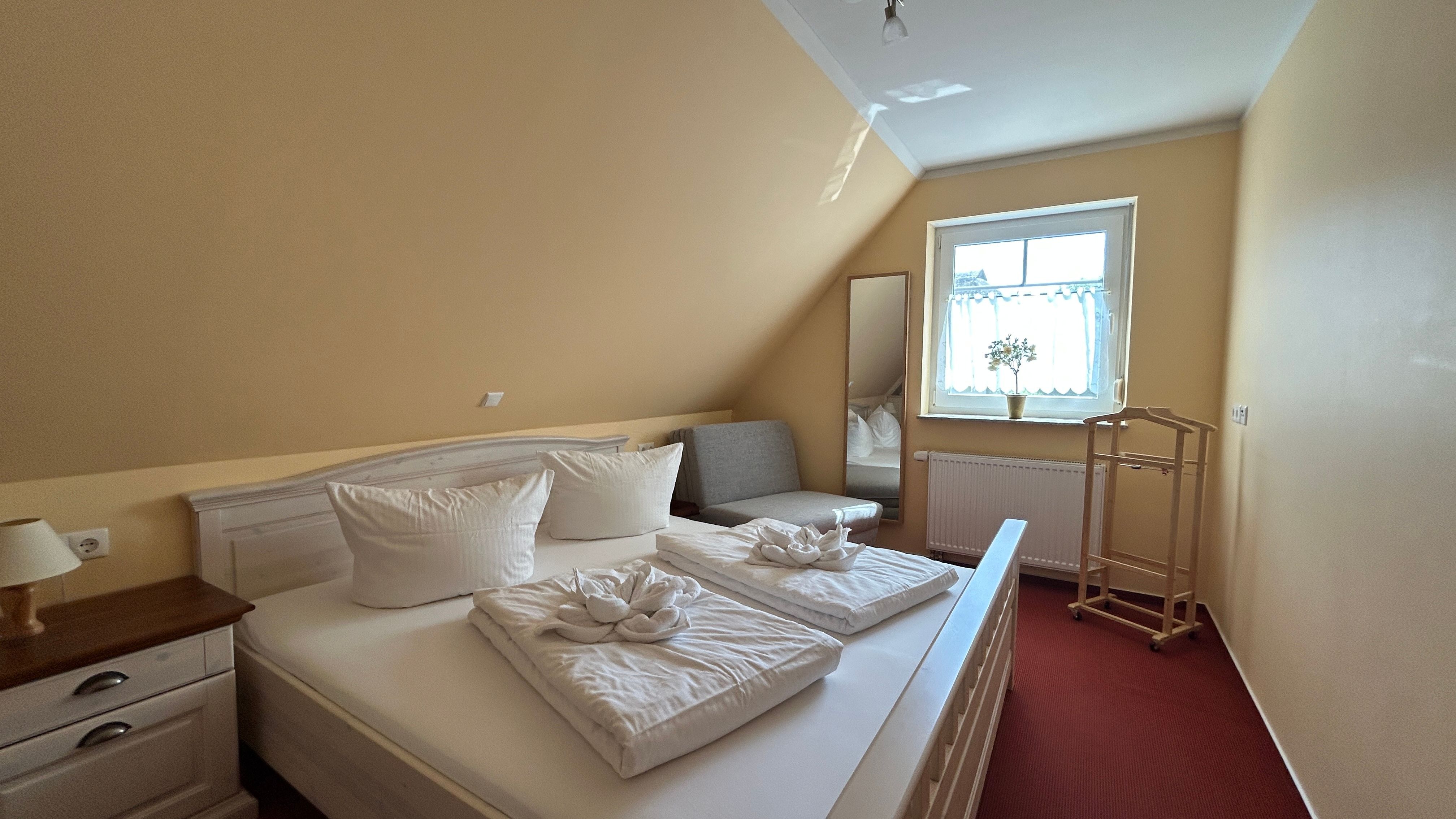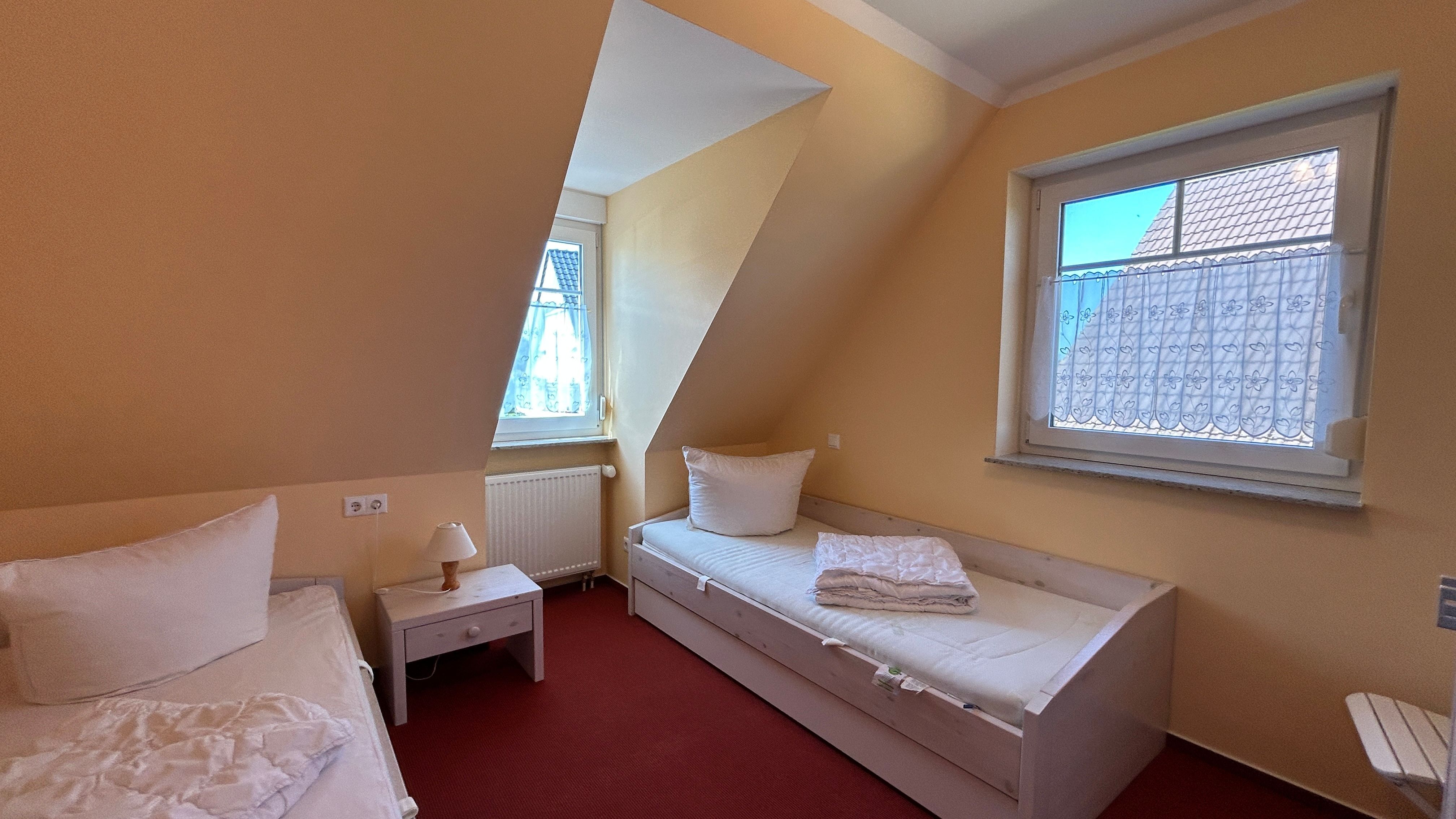 Im Obergeschoss des Hauses gibt es die 3 Schlafzimmer, zwei mit jeweils einem Doppelbett, ein weiteres mit 2 Einzelbetten.