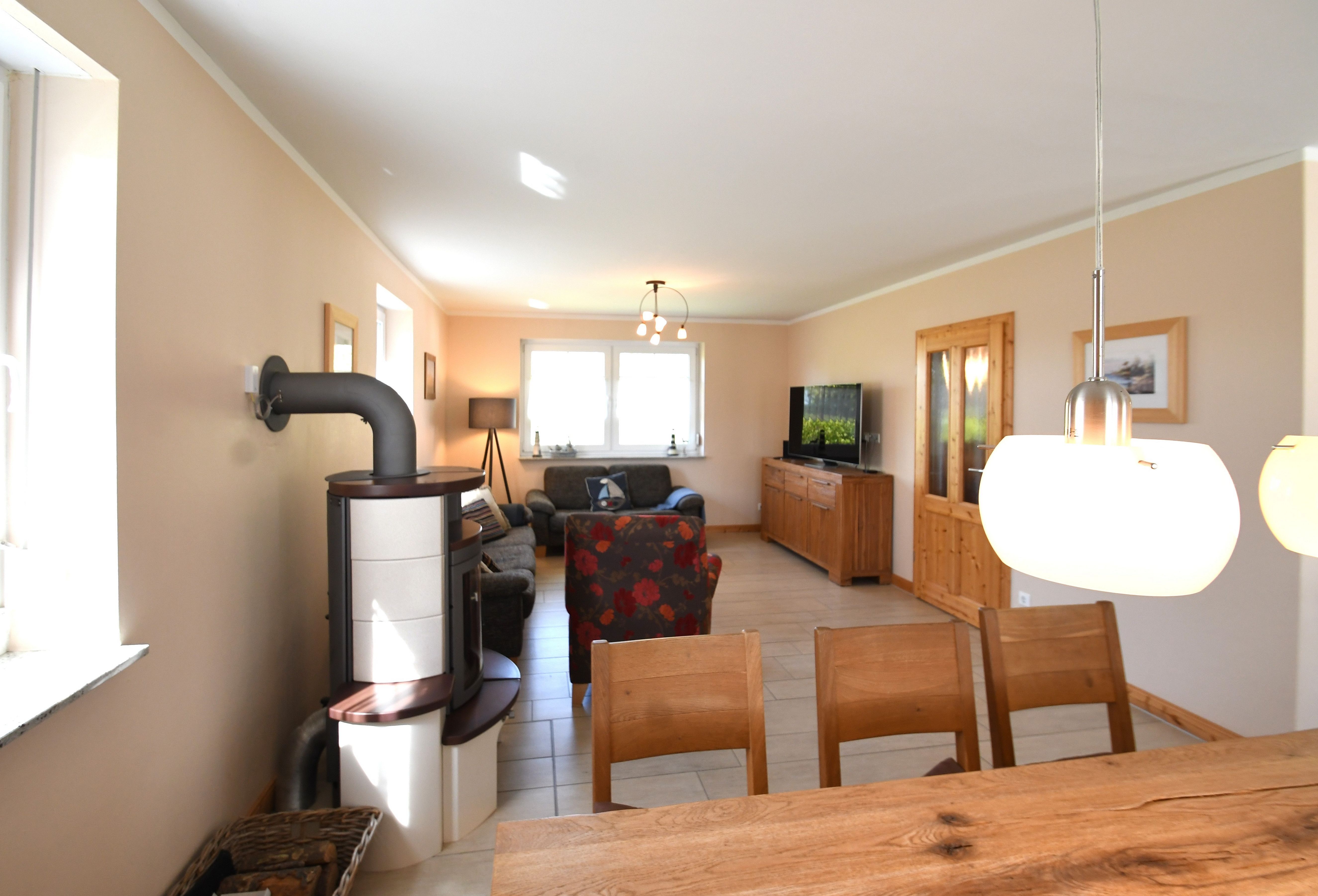 Der lichtdurchflutete Wohn- und Essbereich mit befindet sich im Erdgeschoss. Das Wohnzimmer ist mit gemütlichen Sofas und einem LED-HD-TV ausgestattet. Wann immer Sie möchten, verbreitet der Kamin eine besonders behagliche Atmosphäre.