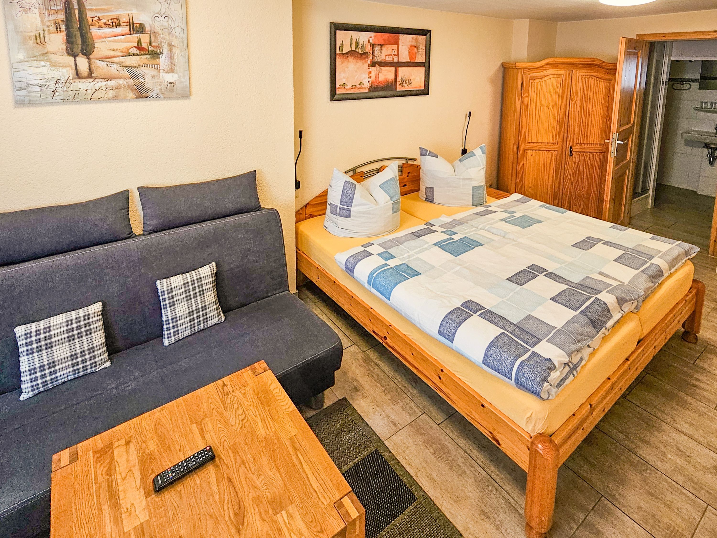 Das 17 m² große Doppelzimmer ist mit Naturholzmöbeln und modernem Komfort, wie Radio und TV ausgestattet. Es verfügt über ein Doppelbett (180 x 200) und ein Bad mit Dusche und WC. Eine kleine Sitzecke mit Tisch lädt Sie ein, vielleicht eine Karte an die Lieben zu schreiben oder einfach nur ein gutes Buch zu lesen.