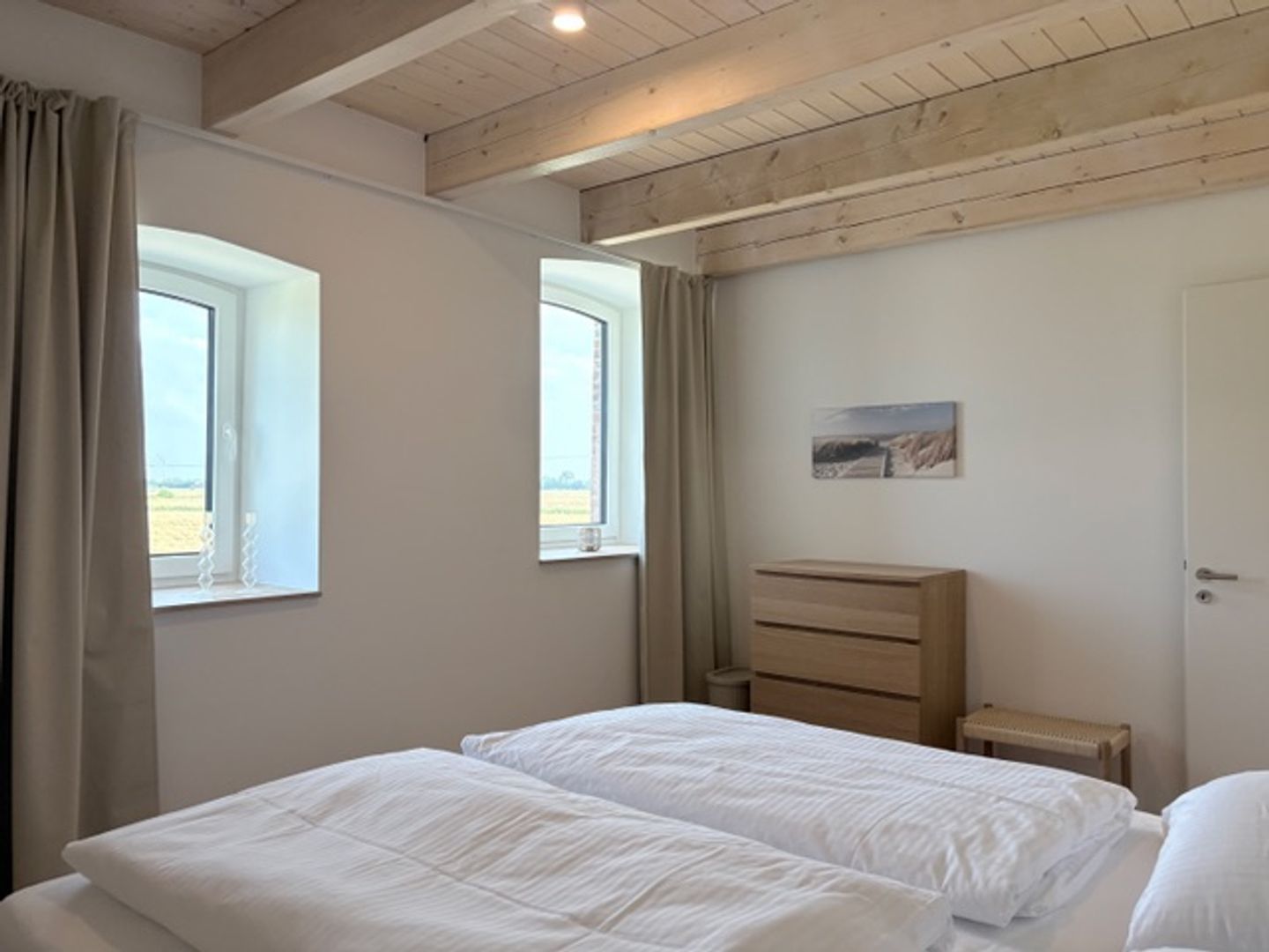 Über die modern restaurierte Scheune mit ihrem beeindruckenden alten Ständerwerk erreichen sie ihre Wohnung „een“ (Plattdeutsch für eins).