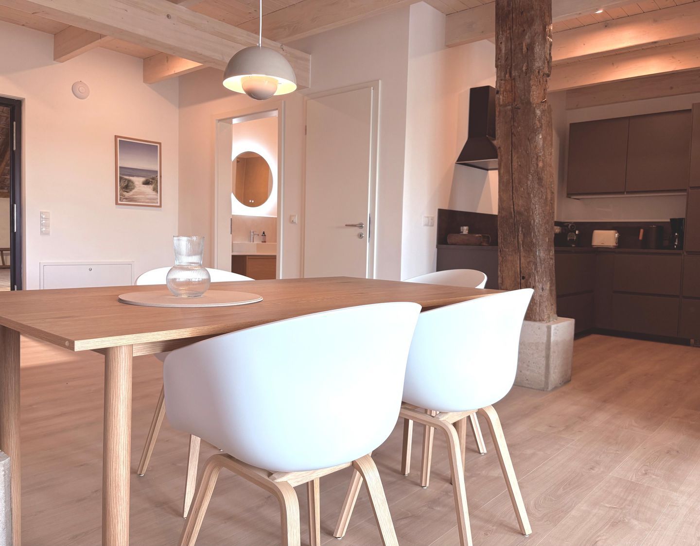 Unsere vier großzügigen Ferienwohnungen bieten viel Platz für Familien, Freunde oder kleine Gruppen. Für romantische Auszeiten zu zweit steht eine charmante, loftartige Wohnung bereit.